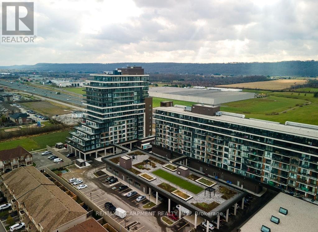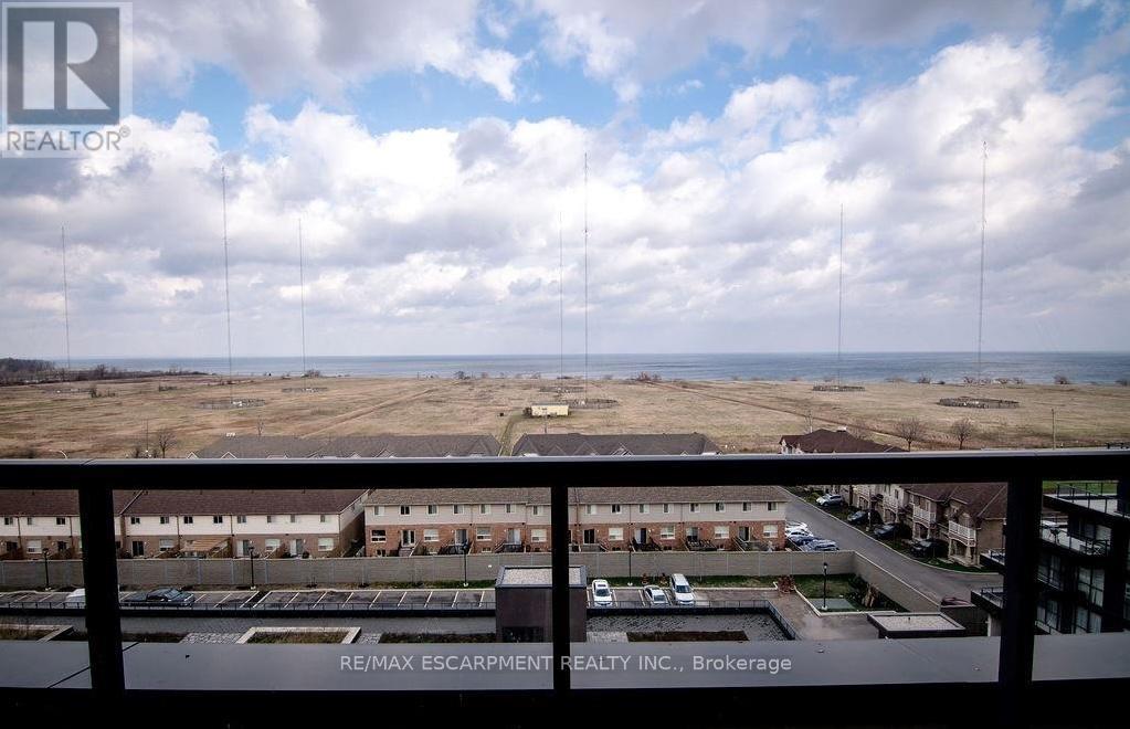 Lake views for days. Welcome to unit 810 at 560 North Service Rd - perched high above Grimsby-on-the-Lake with sweeping, unobstructed views of Lake Ontario. This 2-bedroom + den, 2-bath suite offers approximately 983 sq ft of bright, open-concept living. The modern kitchen features a quartz-topped island, ample cabinetry, and durable vinyl plank flooring throughout The desirable split-bedroom layout provides added privacy, while the versatile den is ideal for a home office, nurser, or flex space. Start your mornings with coffee on the oversized balcony, taking in stunning sunrises over the water. Additional highlights include in-quite laundry and generous storage. Steps to waterfront trails, cafes, and restaurants, with quick access to the QEW and GO Transit - making this an excellent option for commuters and lifestyle buyers alike. A turnkey waterfront community opportunity with views that truly set it apart. (id:64974)