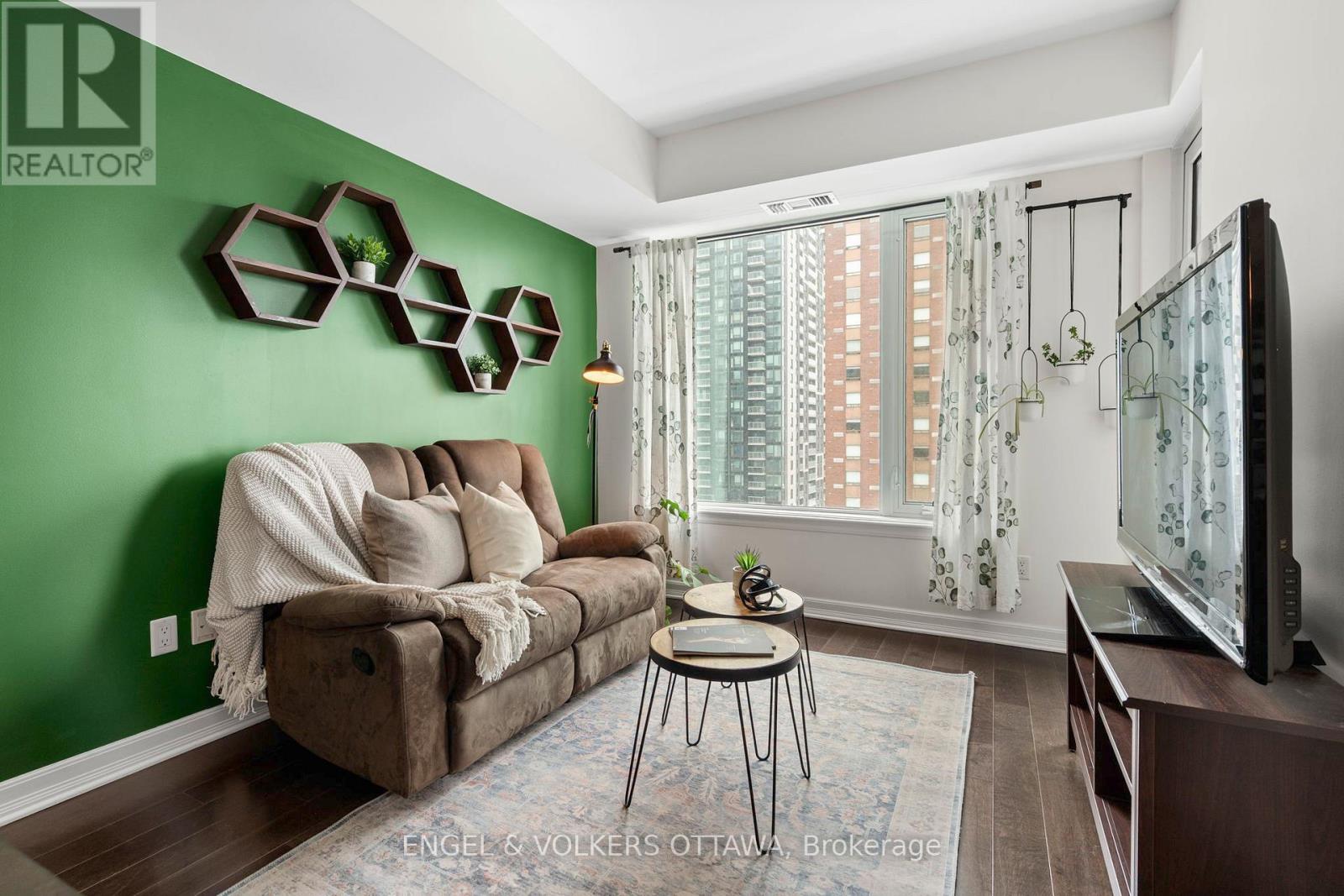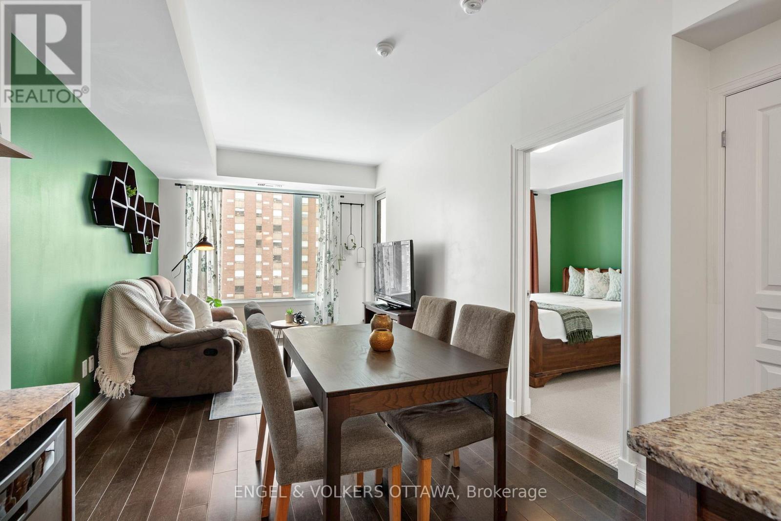 A bright and functional 1-bedroom + den condo in the heart of downtown, offering the perfect blend of location and convenience. Featuring hardwood flooring throughout the main living areas, this space feels warm, modern, and move-in ready. The open-concept kitchen is finished with rich cabinetry, granite countertops, stainless steel appliances, and a centre island-ideal for casual dining or entertaining. It flows seamlessly into the living and dining area, creating great sightlines and an inviting space to host or unwind. Large windows fill the home with natural light and lead to a private balcony, perfect for morning coffee or taking in the city views. The bedroom offers a comfortable space with an oversized window and a full-size closet, while the versatile den provides the ideal work-from-home setup, reading nook, or guest space-adding flexibility to suit your lifestyle. Additional features include in-unit laundry, a well-appointed bathroom, and efficient use of space throughout. Located in a prime downtown setting, just steps to Metro, restaurants, cafes, shops, transit, and the Ottawa Little Theatre. Whether you're a first-time buyer, investor, or looking for a low-maintenance urban lifestyle, this is a fantastic opportunity to own in one of the city's most connected locations. (id:64974)