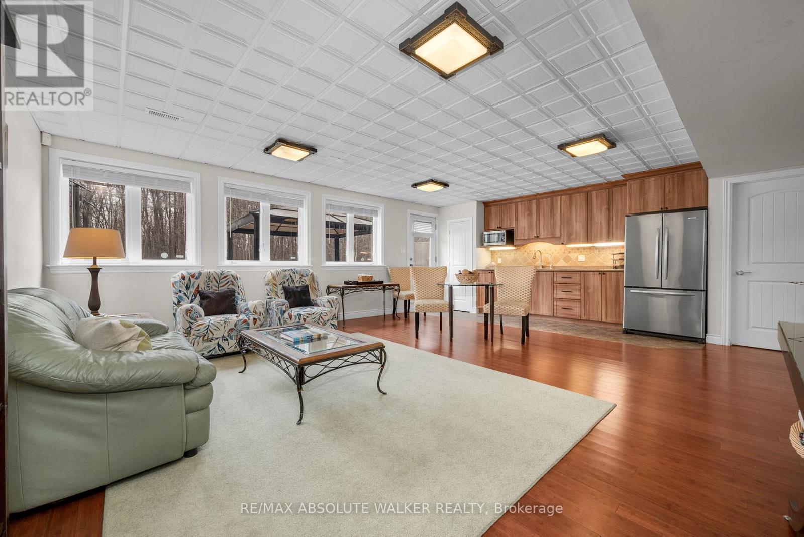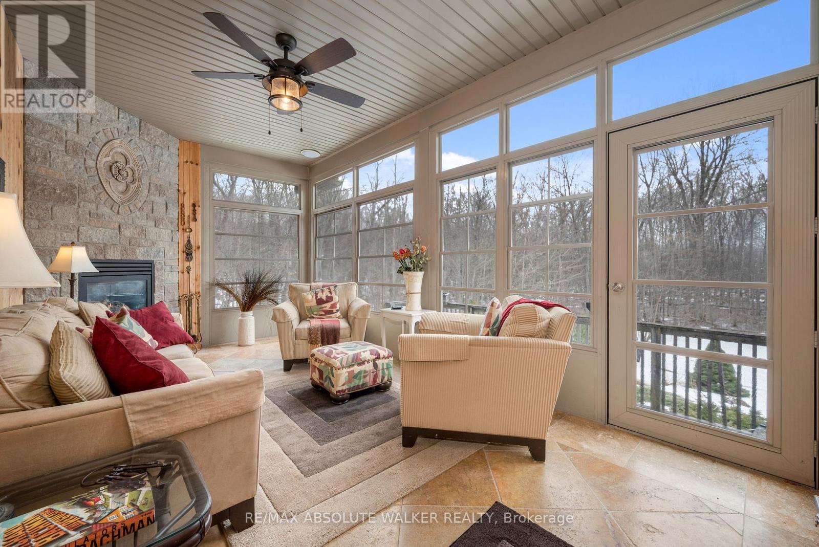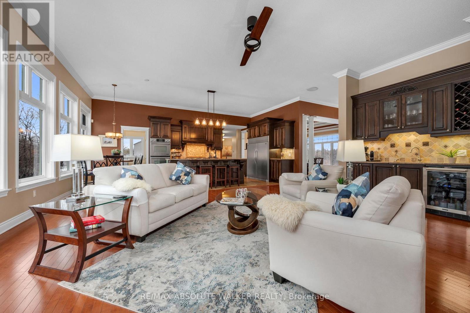 Set on a private, wooded 1.97-acre executive lot just 20 minutes from downtown Ottawa, this custom Corvinelli bungalow features over 4,800 sq.ft. of thoughtfully designed finished living space with 3+2 bedrooms and 3 full bathrooms. An extra-wide foyer welcomes you into beautifully appointed principal rooms. The living room impresses with 11ft ceilings, architectural mouldings, a warm fireplace, and expansive windows showcasing forest views. A wet bar with a beverage fridge and wine storage adds the perfect touch for entertaining while the formal dining room, framed by decorative columns, features a custom coved ceiling and provides an elegant setting for gatherings. At the heart of the home is a chef-inspired kitchen with granite countertops, a large centre island with seating, heated floors, JennAir double wall ovens, a gas cooktop, and custom maple cabinetry. A spacious walk-in pantry offers excellent storage. Just beyond, the three-season sunroom with a fireplace overlooks the landscaped gardens and deck, creating a warm and inviting retreat. The private primary suite offers rich hardwood flooring, large windows, a walk-in closet, and a spa-like ensuite with heated floors, a double vanity, and an oversized walk-in shower with dual shower heads. An additional main floor bedroom, a full bathroom, and a well-designed laundry room with custom cabinetry complete this level. A bonus room above the garage offers the perfect space for teenage retreat, guest room, or studio. The walk-out lower level is ideal for guests or multigenerational living with a bright family room, accessory kitchen, two bedrooms, a full bathroom with heated floors, plus flexible spaces including a home theatre/gym, office, and workshop. Additional highlights include a three-car garage with 9ft doors and EV charger connection, a 17kW Generac generator, and upgraded insulated siding (2024). An exceptional property offering luxury, space, craftsmanship and privacy. (id:64974)
