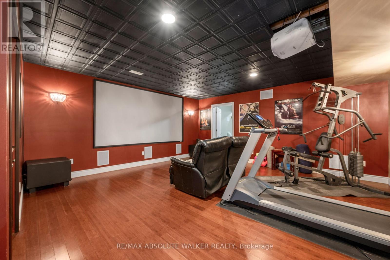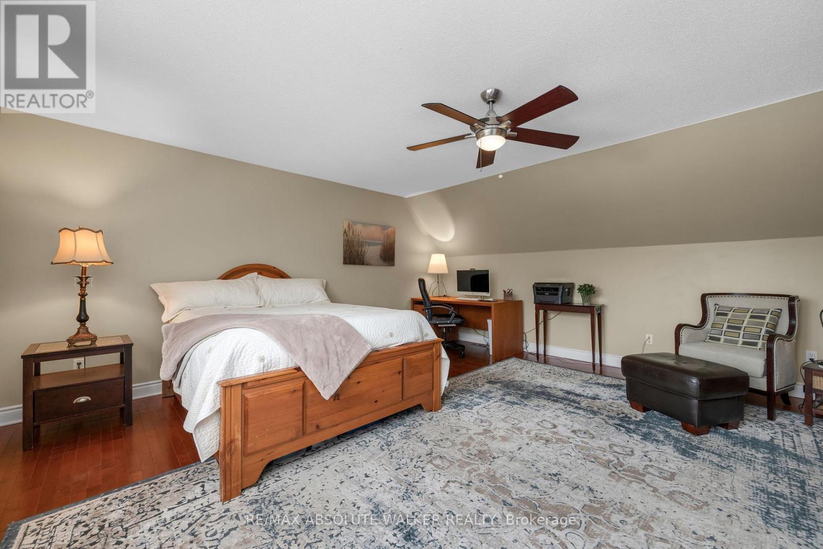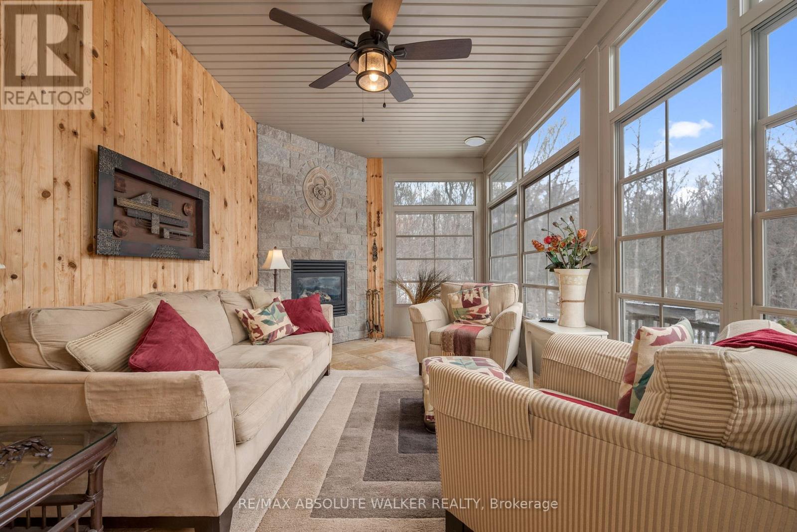 Set on a private, wooded 1.97-acre executive lot just 20 minutes from downtown Ottawa, this custom Corvinelli bungalow features over 4,800 sq.ft. of thoughtfully designed finished living space with 3+2 bedrooms and 3 full bathrooms. An extra-wide foyer welcomes you into beautifully appointed principal rooms. The living room impresses with 11ft ceilings, architectural mouldings, a warm fireplace, and expansive windows showcasing forest views. A wet bar with a beverage fridge and wine storage adds the perfect touch for entertaining while the formal dining room, framed by decorative columns, features a custom coved ceiling and provides an elegant setting for gatherings. At the heart of the home is a chef-inspired kitchen with granite countertops, a large centre island with seating, heated floors, JennAir double wall ovens, a gas cooktop, and custom maple cabinetry. A spacious walk-in pantry offers excellent storage. Just beyond, the three-season sunroom with a fireplace overlooks the landscaped gardens and deck, creating a warm and inviting retreat. The private primary suite offers rich hardwood flooring, large windows, a walk-in closet, and a spa-like ensuite with heated floors, a double vanity, and an oversized walk-in shower with dual shower heads. An additional main floor bedroom, a full bathroom, and a well-designed laundry room with custom cabinetry complete this level. A bonus room above the garage offers the perfect space for teenage retreat, guest room, or studio. The walk-out lower level is ideal for guests or multigenerational living with a bright family room, accessory kitchen, two bedrooms, a full bathroom with heated floors, plus flexible spaces including a home theatre/gym, office, and workshop. Additional highlights include a three-car garage with 9ft doors and EV charger connection, a 17kW Generac generator, and upgraded insulated siding (2024). An exceptional property offering luxury, space, craftsmanship and privacy. (id:64974)