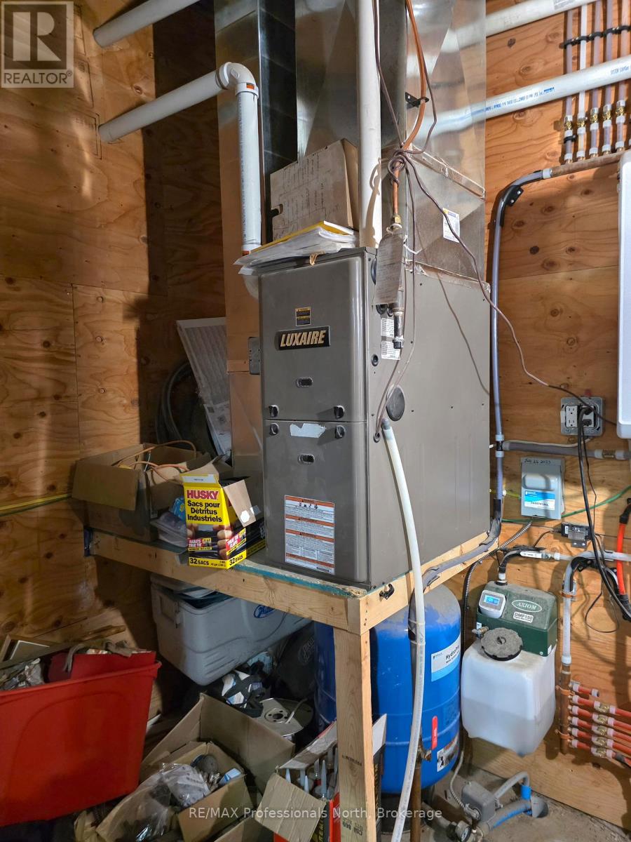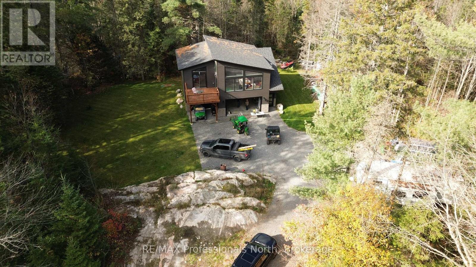 Built in 2023, this beautifully crafted home blends contemporary design with the peaceful charm of a forest setting. Nestled among the trees on a private one-acre lot, it offers the perfect balance of comfort, style, and practicality - just 30 minutes from Huntsville. Step inside to an inviting open-concept living space featuring soaring cathedral ceilings, energy-efficient pot lighting, and large windows that frame tranquil views of nature. The kitchen is a chefs dream, equipped with a professional Wolf range and generous counter space for entertaining or everyday cooking. With two spacious bedrooms and two full bathrooms, each with its own large walk-in shower, the layout combines functionality with luxury. An extra-wide staircase easily accommodates a chair-lift, ensuring accessibility for all. The home's thoughtful features continue with a huge three-car garage, complete with in-floor heating, battery-backup garage door openers that can be operated remotely, and a full Generac generator for peace of mind. The main living level is warmed by efficient forced-air heating and air conditioning can be easily added for year-round comfort. Enjoy morning coffee or evening sunsets from the expansive decks at both the front and rear, surrounded by the quiet beauty of the forest. If you've been searching for a modern, energy-smart home with privacy, practicality, and just the right touch of luxury - this one checks every box. BONUS: part of the garage can be converted into an inlaw suite (roughed in)! This property is ideal for those who are interested in the outdoors. It is across from the OFC D trail and ATV trail. (id:64974)