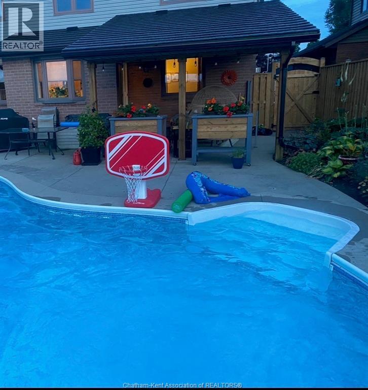 Welcome to this meticulously maintained and thoughtfully renovated two-storey home, a perfect blend of comfort, style, and functionality for modern family living. The main level features a bright and inviting layout with a spacious living room, formal dining area, and a cozy family room—ideal for both everyday living and entertaining. The eat-in kitchen with granite countertops, a tiled backsplash, and direct access to the rear yard, making indoor-outdoor hosting effortless. A convenient main floor laundry room and welcoming foyer with a stunning hardwood staircase complete. Upstairs, you’ll find 3 generously sized bedrooms, including a large primary suite with a walk-in closet and private 3pc ensuite. A well-appointed 4pc bath serves the additional bedrooms.The fully finished lower level is designed for relaxation and entertainment, featuring a custom-built bar, comfortable family room, and a dedicated movie-night setup with a big-screen TV and surround sound included. Additional updates and features include updated HVAC, a durable metal roof with a lifetime transferrable warranty, and meticulous upkeep throughout. Step outside to your private backyard retreat—fully fenced and beautifully landscaped, complete with an in-ground swimming pool and a covered patio area perfect for those who prefer to relax in the shade. Elegant wrought iron fencing along the rear allows you to take in stunning sunset views, creating a truly special outdoor setting. Situated in a sought-after, family-friendly neighbourhood, this home is conveniently located close to excellent schools, parks, and all amenities. (id:64974)
