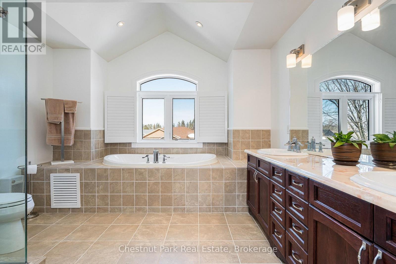 Located in the south end of Collingwood this highly sought-after neighbourhood boasts an enclave of custom-built homes where pride of ownership is evident. In 2008 the current owners purchased the full-town lot and set out to design their dream home. Through the expertise and craftsmanship of local builder, Redwood Homes, their vision was realized. This traditional two-storey, four-bedroom, four-bathroom home with fully finished basement offers warmth, comfort, and quality throughout. Natural light is abundant and each room has a bright and spacious feeling given the combination of windows and ceiling height on each level including the basement. Hardwood floors, three separate entertaining areas, one with a cathedral ceiling and the other a wood burning fireplace, add to the charm of this well-designed home. From the kitchen, take in and admire the southern facing backyard, professionally designed by Landmark Group boasting perennial gardens, maturing trees and lots of open space (that once hosted a wedding for 100) that could accommodate a future pool. The tiered deck with Hot Tub offers an abundance of space to entertain or prepare that perfect meal on the grille from the separate year-round covered deck while listening to your favourite tunes through the built-in speakers. If energy efficiency and a quiet home are important, then you will appreciate the ICF construction, in-floor heating in the basement and the On Demand Hot Water. This home is within walking distance to multiple schools and connected to the community via Collingwood's expansive trail system. Only minutes by car to year-round recreation and both natural and physical amenities, it is perfectly situated to enjoy and immerse yourself in the four-season playground and the quality of life many have come to discover in Collingwood. (id:64974)