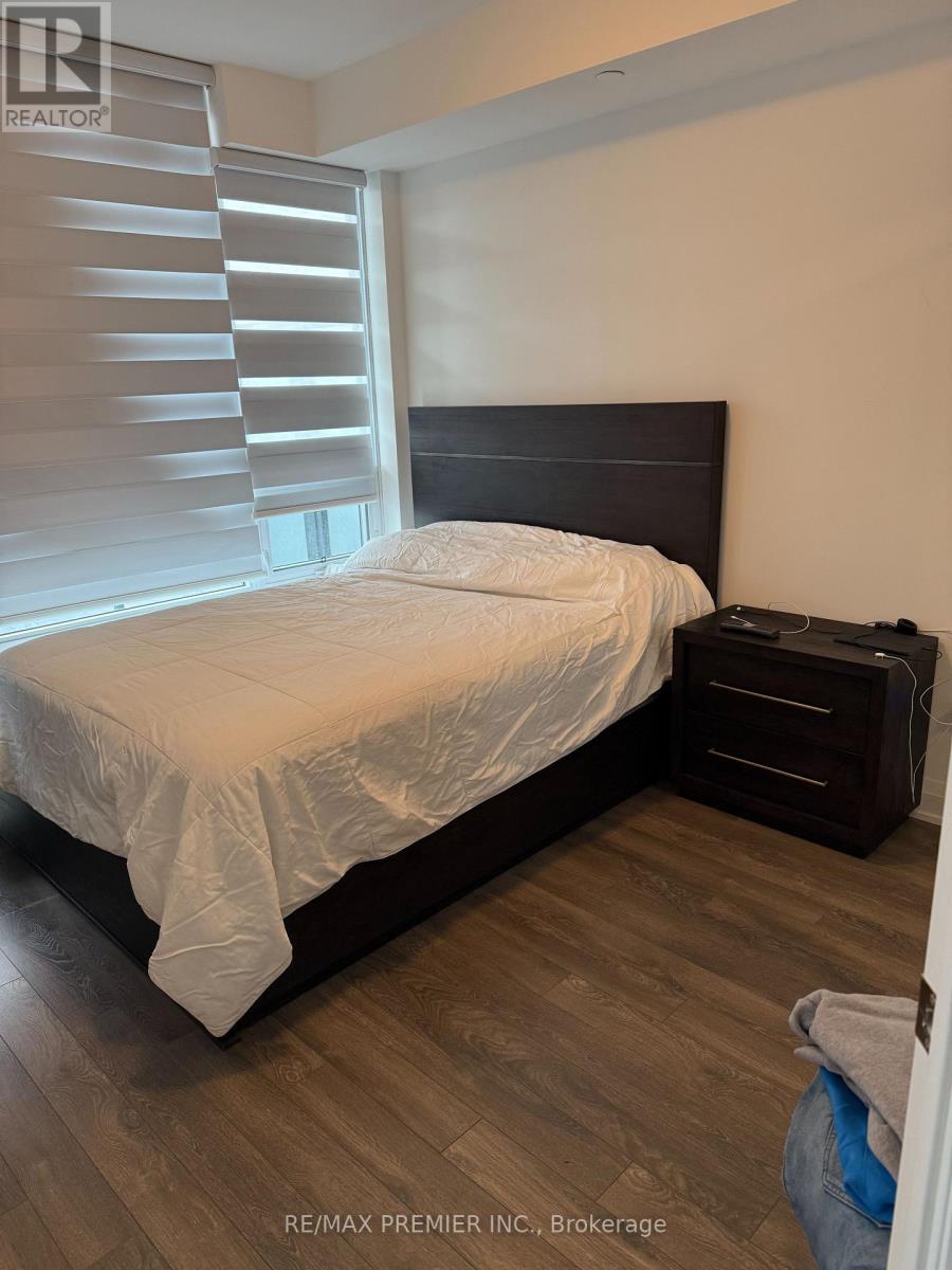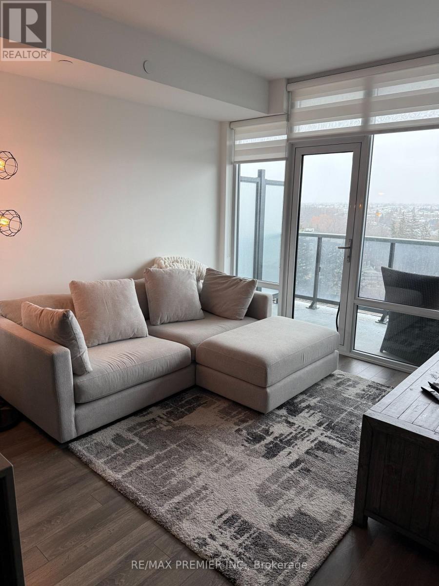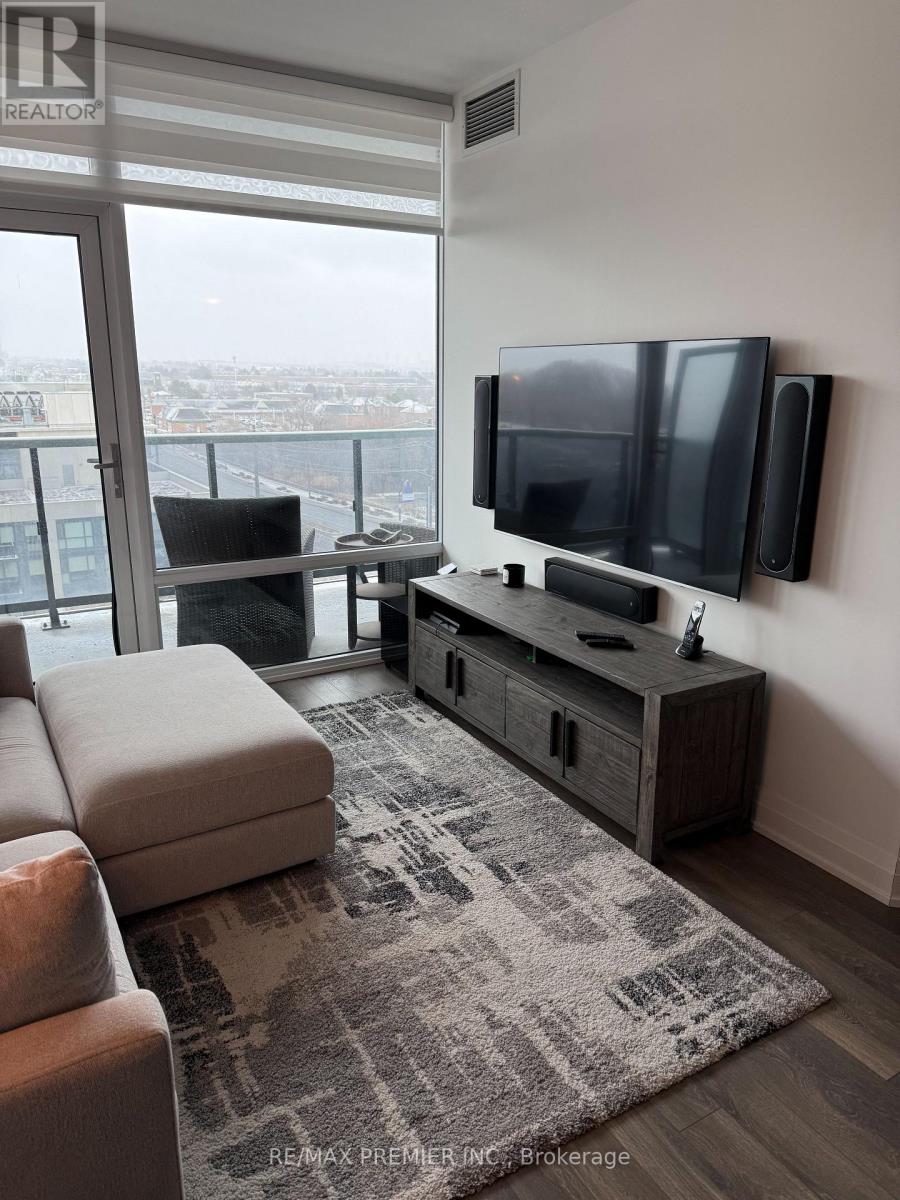 Welcome to the prestigious Avenue On 7 condo building-an impressive 2-bedroom, 1-bath suite with beautifully upgraded finishes throughout. The open-concept kitchen offers quartz countertops, a stylish backsplash, a center island, and stainless steel appliances, making it perfect for both cooking and entertaining. The second bedroom provides versatility as either a spacious home office or a comfortable guest room, complete with its own closet. Floor-to-ceiling windows fill the unit with natural light all day, while the large east-facing balcony offers great space for relaxing. Ideally situated near public transit, shopping, and major highways, this sought-after building also features resort-style amenities including an outdoor pool, luxury gym, party and media rooms, visitor parking, and concierge. (id:64974)