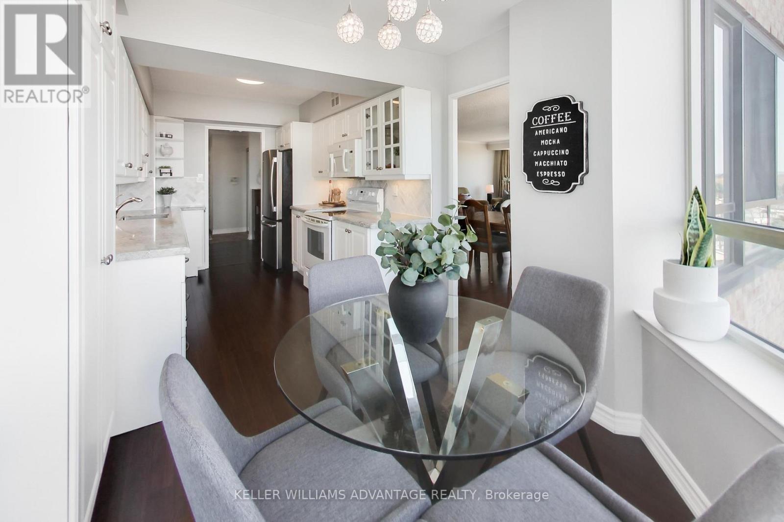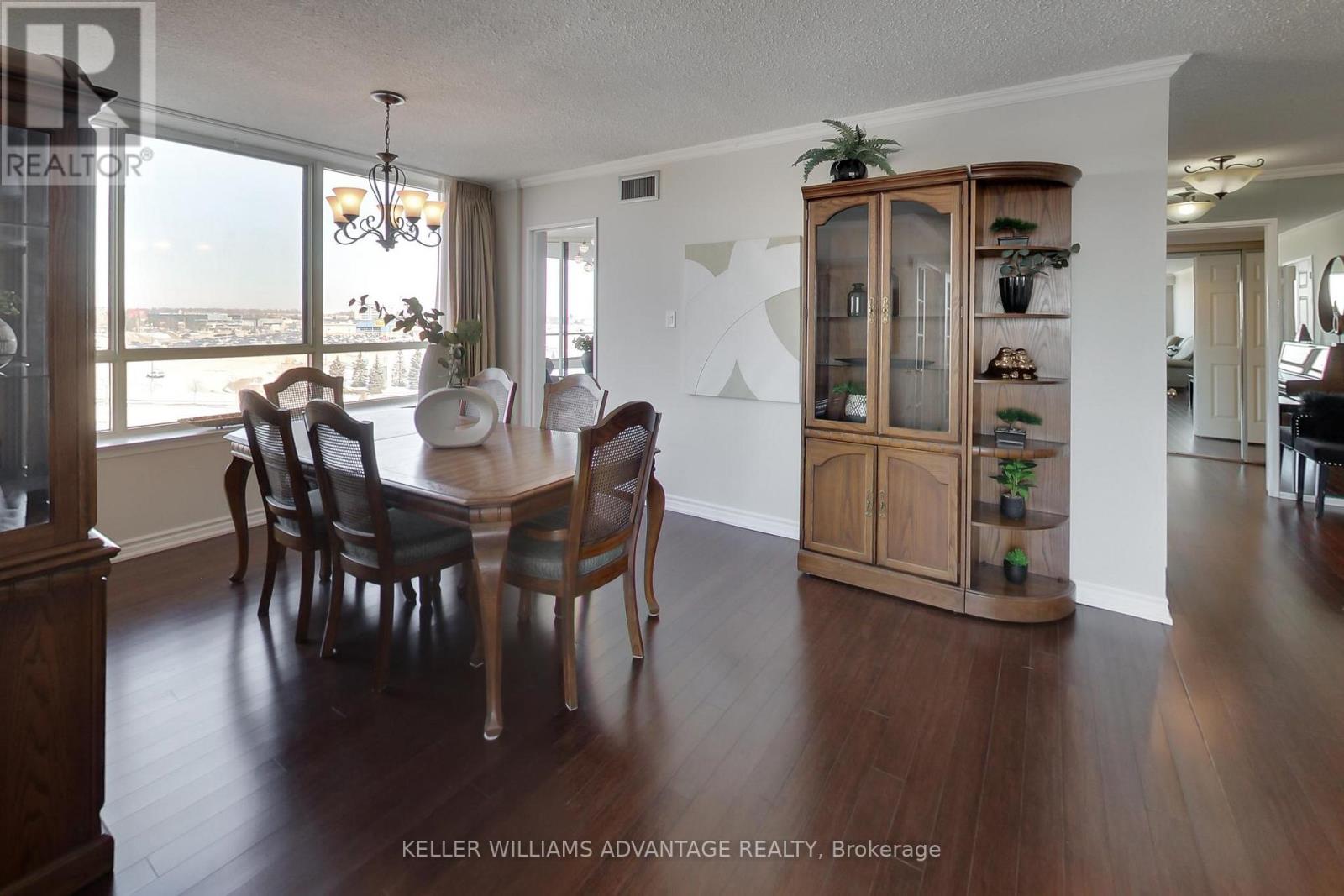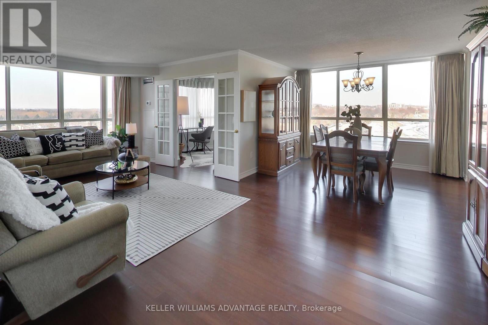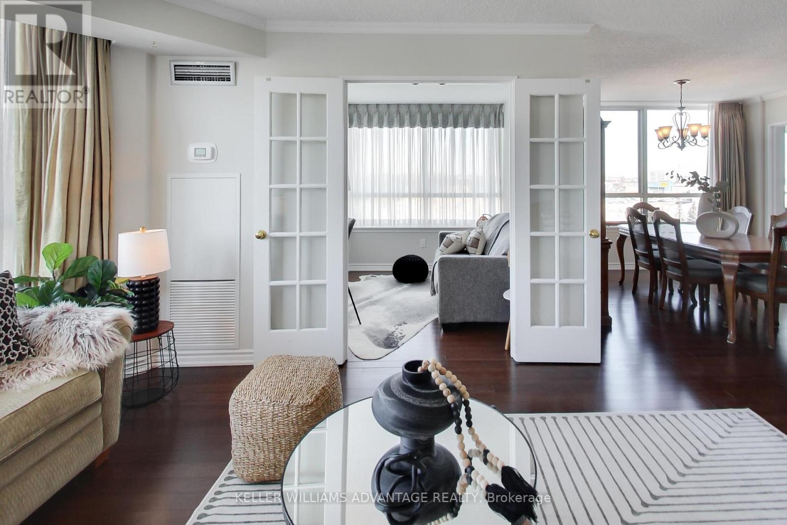 Welcome To Tridel's Walden Pond2! Beautiful corner 1530 sq ft suite with clear views. Bright, open, spacious concept. 2 large bedrooms with ample space and privacy. Den was used as a third bedroom. Large kitchen with breakfast area and sliding doors to balcony. Carpet free! Engineered hardwood, has near floor to ceiling windows which floods the suite with year-round natural light. All-inclusive maintenance fees, including Rogers basic cable and Wifi. Has 2 underground parking spots, side-by-side and close to the elevator. The exceptionally managed building has many amenities. 24hr gatehouse security, Full gym, indoor swimming pool, change rooms, billiards room, guest suites, library, tennis courts, and more. Walking distance to Markville Mall, restaurants, parks, trails, ponds, Markville Secondary School, Centennial GO Station, groceries, and more. (id:64974)