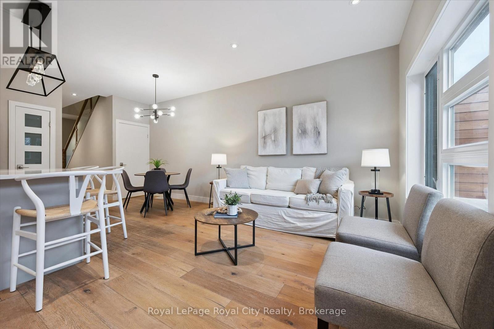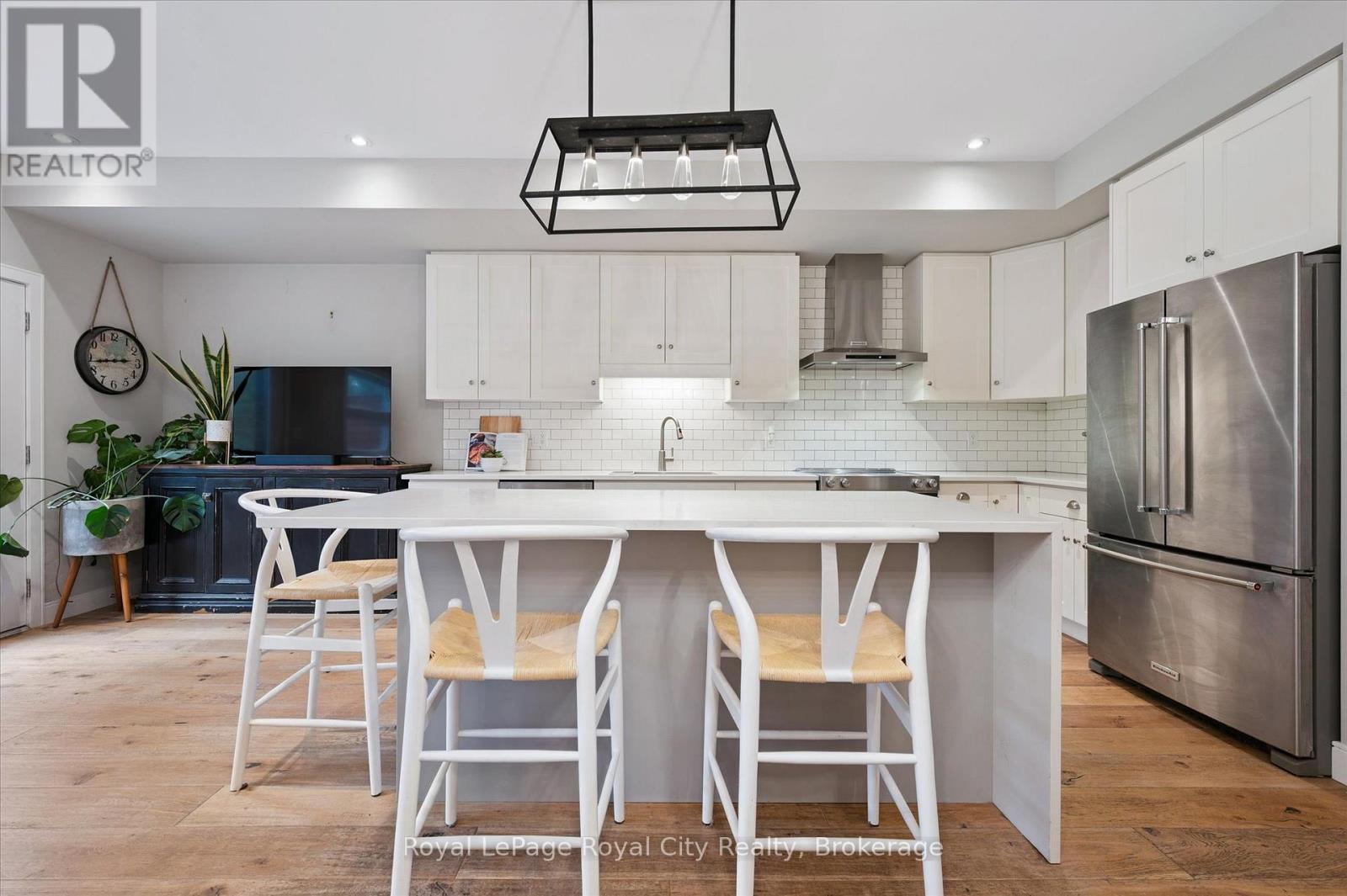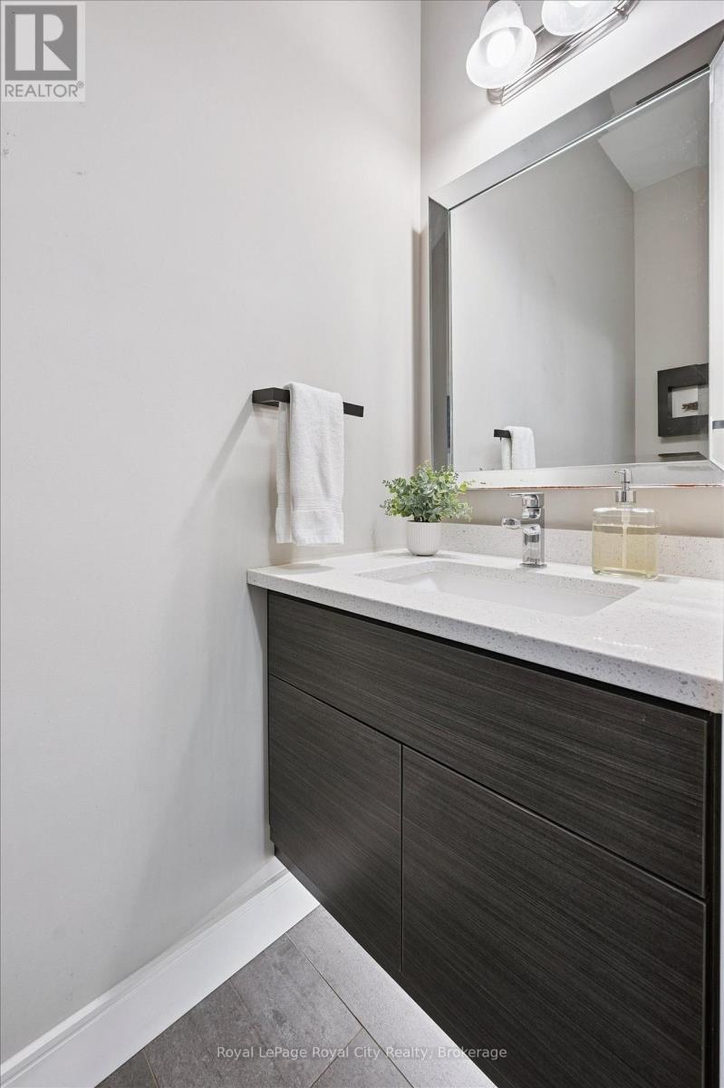 Welcome to #83-60 Arkell Road, an exceptional modern townhome tucked within an exclusive, private enclave of just a handful of homes. Backing onto a dense forest, this home offers rare privacy and a natural backdrop that feels miles away from city life-yet it's ideally located in Guelph's desirable South End, close to top-rated schools, public transit, and every amenity imaginable. With over 2,400 sq ft of living space, including a walk-out lower level, this home features 3 bedrooms and 3.5 bathrooms, plus a den/home office on the second floor. This unit is highly upgraded, with luxury vinyl plank flooring, LED pot lights, and stone surfaces throughout. The open-concept main floor is perfect for entertaining, with a spacious dining and living area that walks out to a private deck overlooking the forest. The chef-inspired kitchen features full-height cabinetry, high-end stainless steel appliances, and a quartz waterfall island that anchors the space. The upper landing includes a convenient laundry closet and a flex space that's ideal for an office, workout area, or reading nook. The primary suite enjoys a dedicated ensuite with a glass-enclosed shower and rain shower head, while two additional bedrooms share a stylish 4-piece bathroom. The finished walk-out basement provides even more living space with a full bathroom and a large recreation room that opens to a covered patio surrounded by nature. The cherry on top? This unit comes with a rare third parking space! This is the ideal home for a stylish couple, modern family, or investor who is looking to attract a high quality tenant. (id:64974)