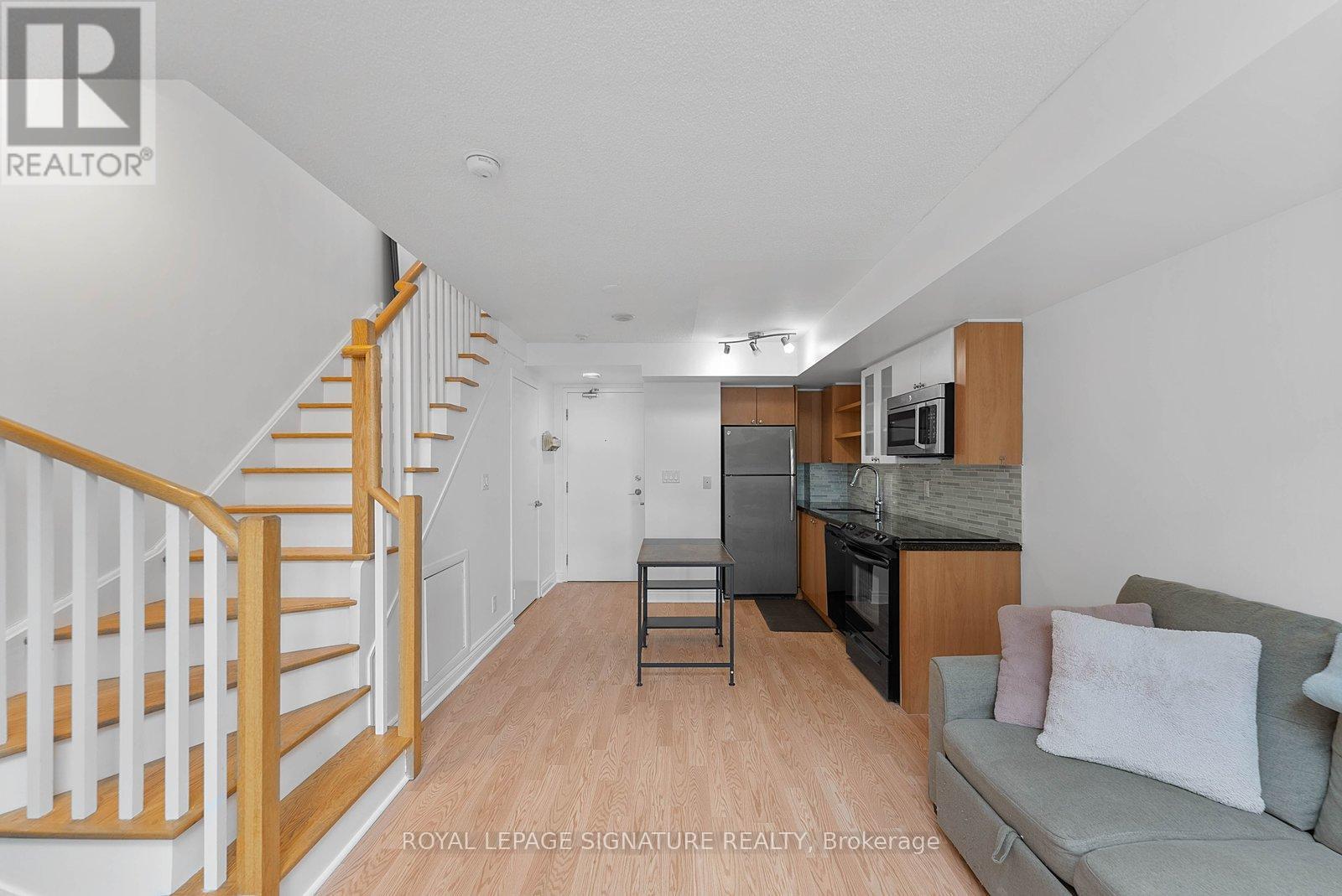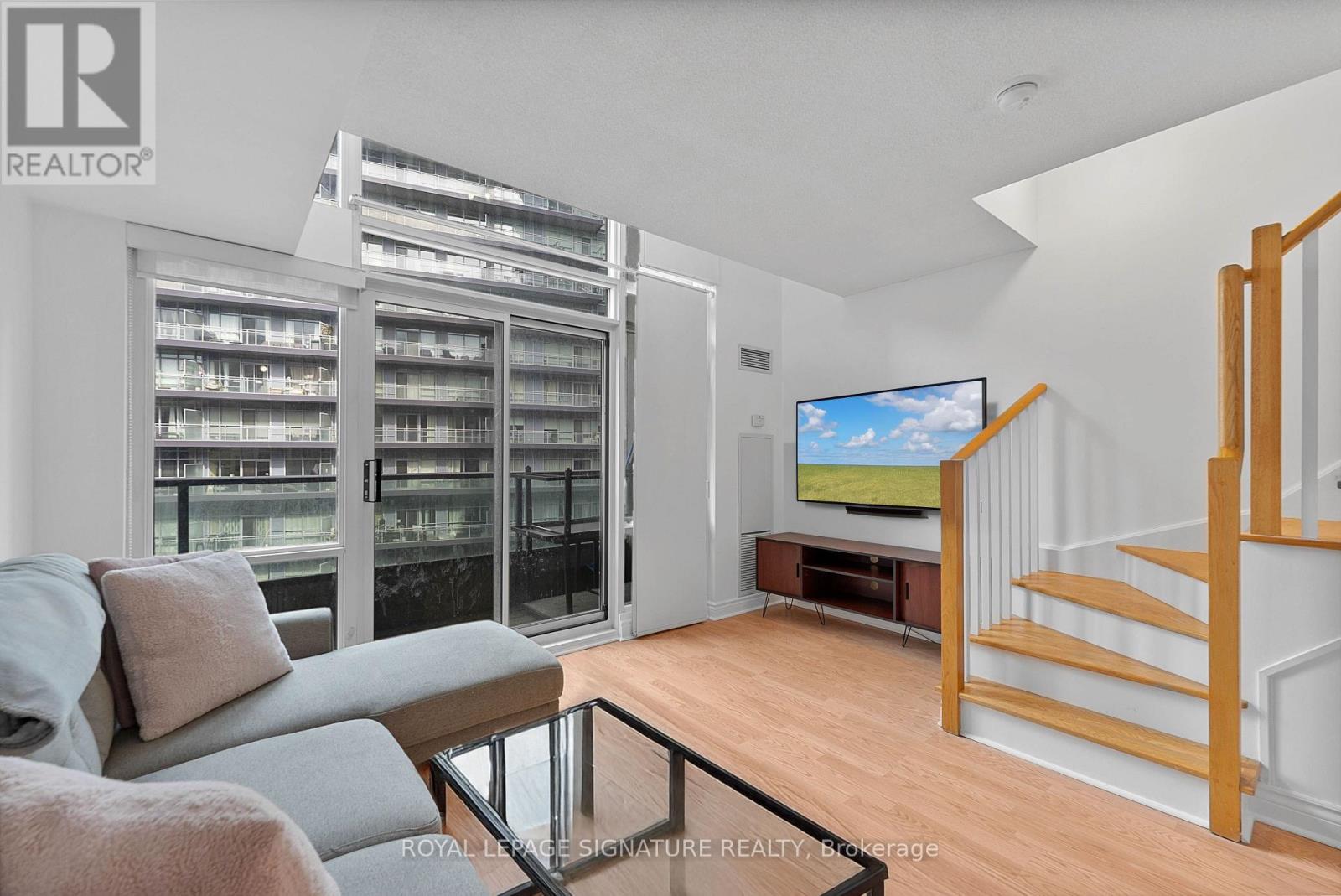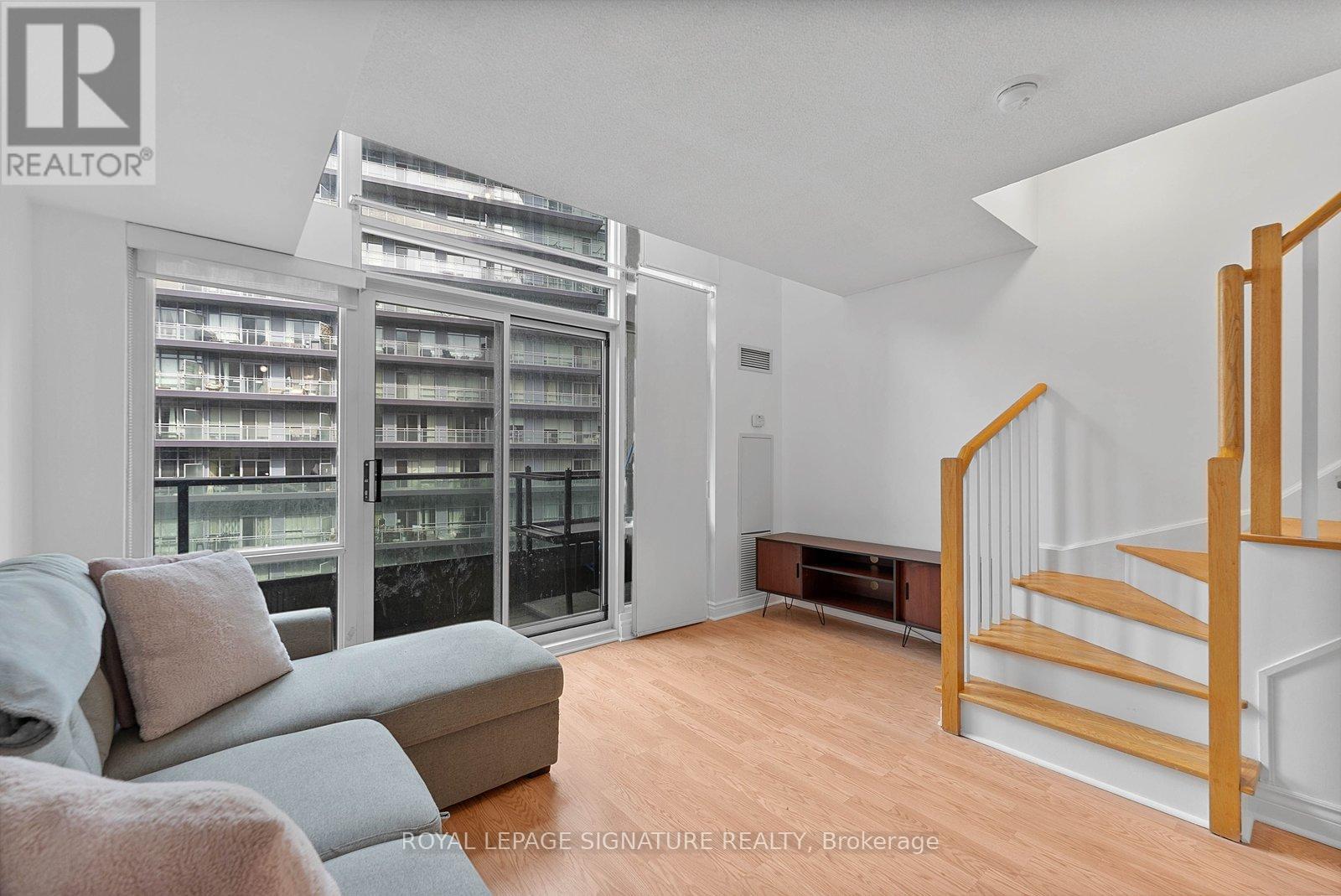 Turn-key and freshly painted, this bright two-storey suite offers a functional layout and exceptional natural light. The kitchen is generously sized and overlooking the living room, creating an open and connected main living space . The living room features a walk-out to the balcony and dramatic two-storey, floor-to-ceiling windows that fill the suite with natural light. A convenient 2-piece powder room completes the main level. Upstairs, the spacious bedroom includes in-suite laundry and a private ensuite bath, offering a comfortable and practical retreat. Ideally located close to everyday amenities, with Loblaws across the street and the Fleet streetcar at your doorstep. Enjoy being minutes from the waterfront and green space at Coronation Park. Parking and locker included. (id:64974)