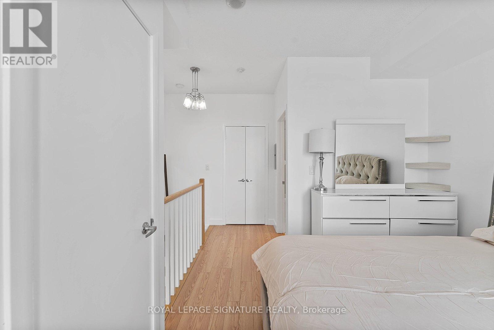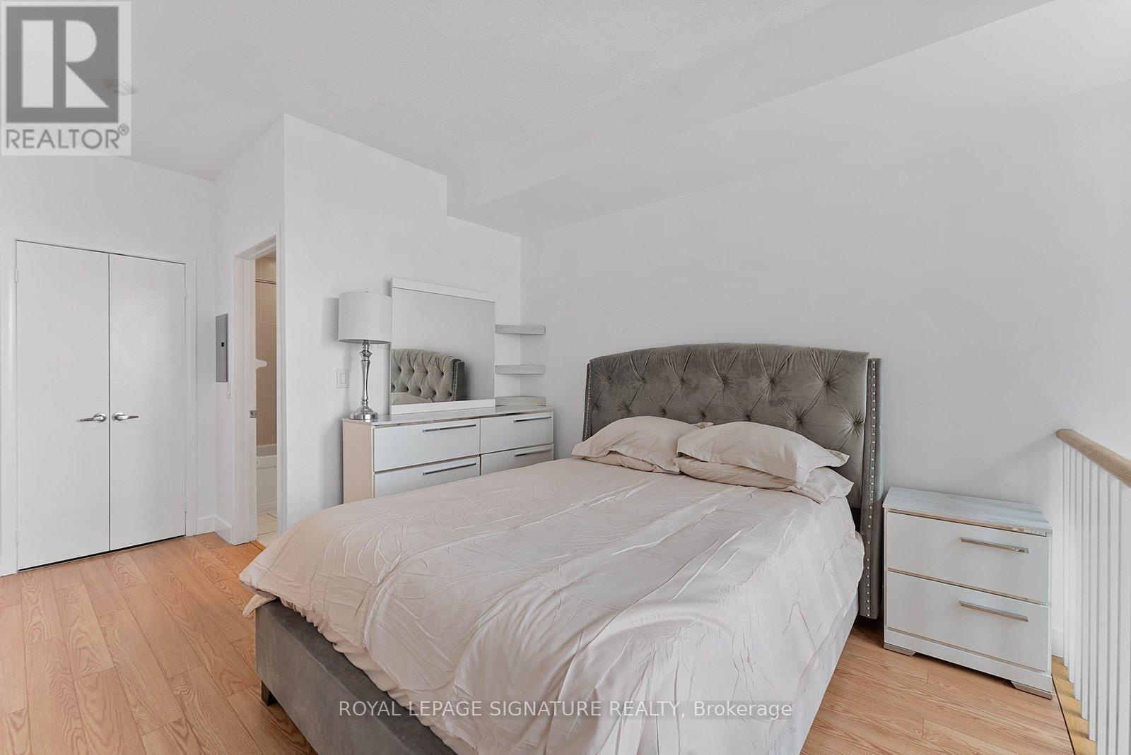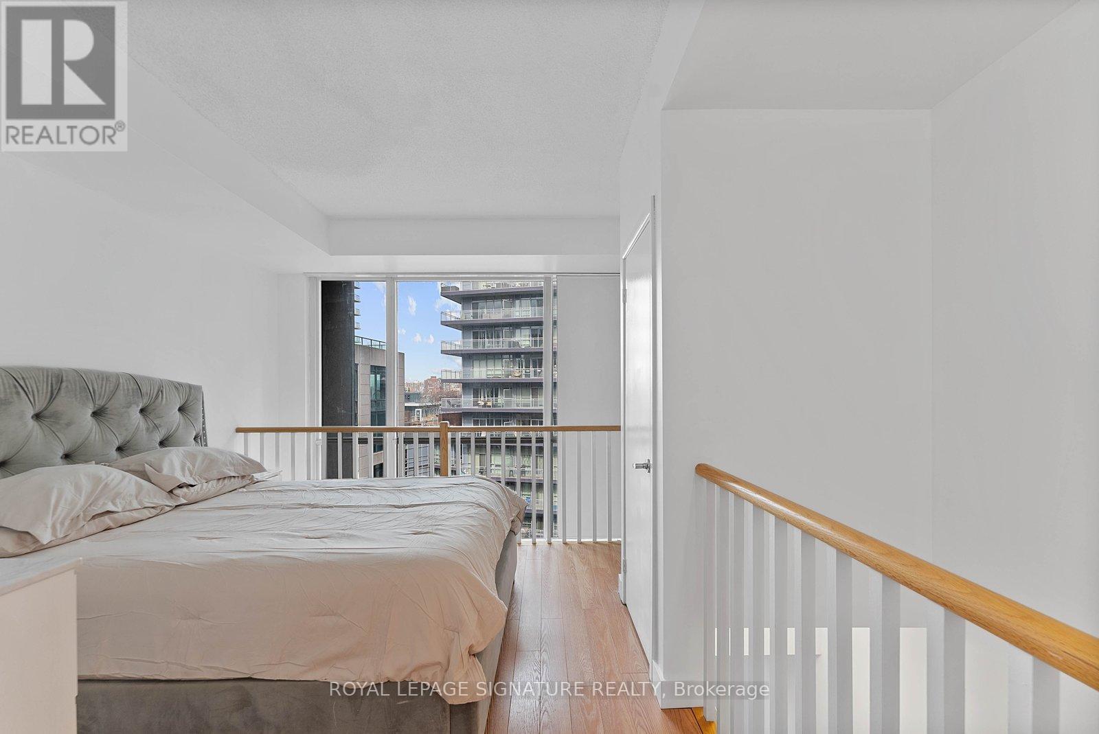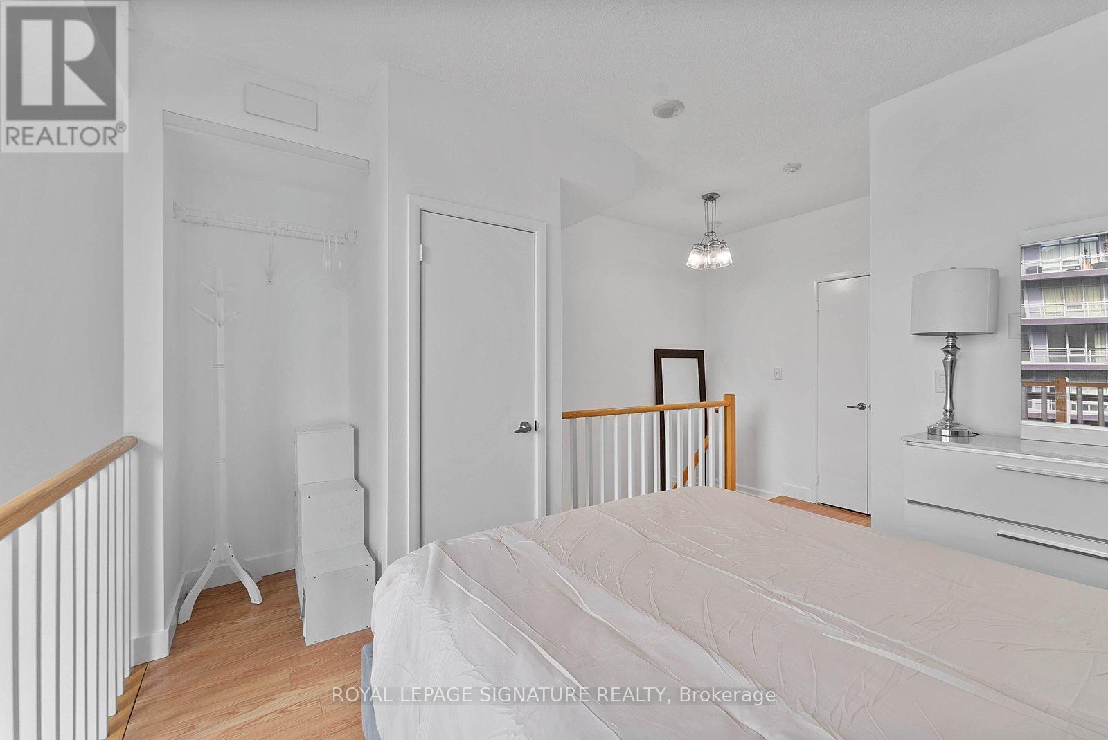 Turn-key and freshly painted, this bright two-storey suite offers a functional layout and exceptional natural light. The kitchen is generously sized and overlooking the living room, creating an open and connected main living space . The living room features a walk-out to the balcony and dramatic two-storey, floor-to-ceiling windows that fill the suite with natural light. A convenient 2-piece powder room completes the main level. Upstairs, the spacious bedroom includes in-suite laundry and a private ensuite bath, offering a comfortable and practical retreat. Ideally located close to everyday amenities, with Loblaws across the street and the Fleet streetcar at your doorstep. Enjoy being minutes from the waterfront and green space at Coronation Park. Parking and locker included. (id:64974)