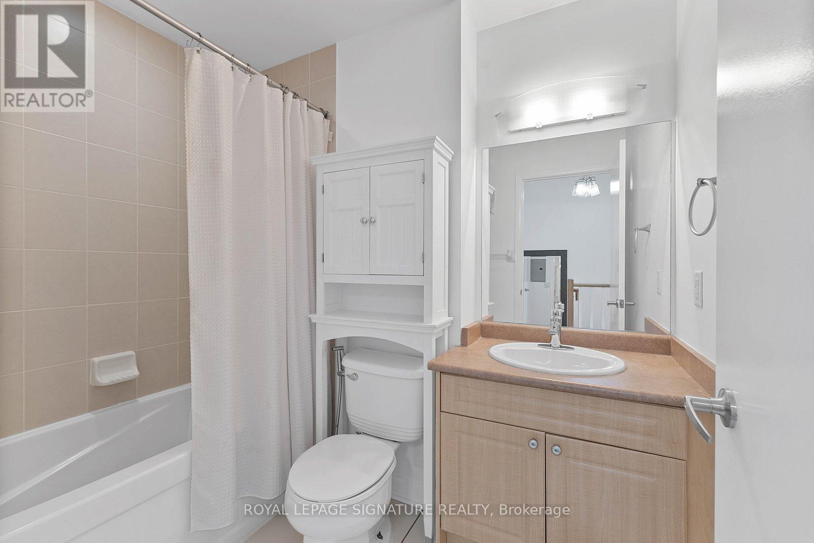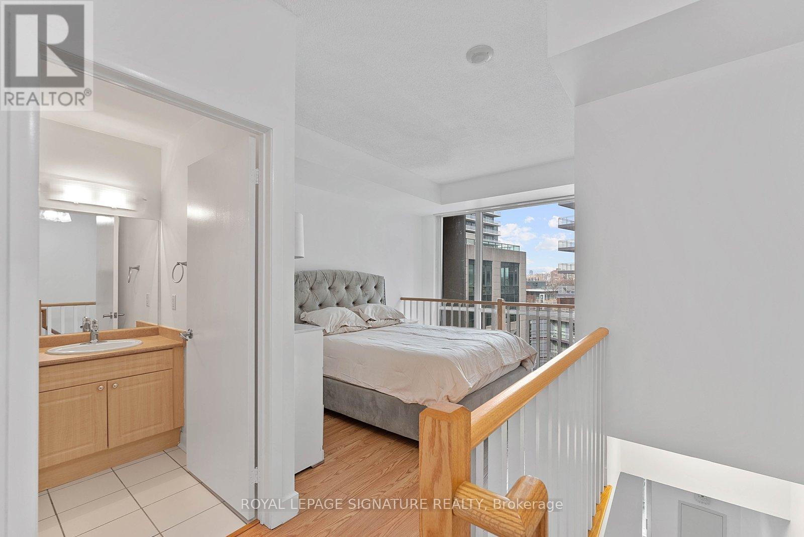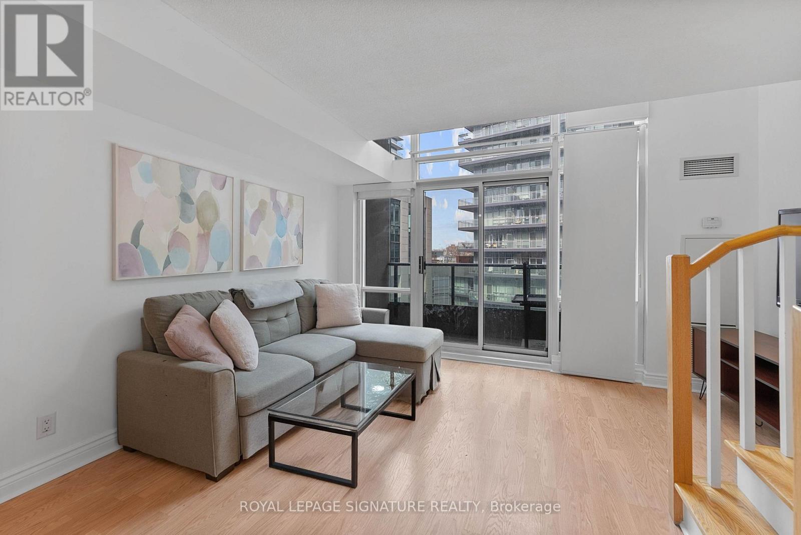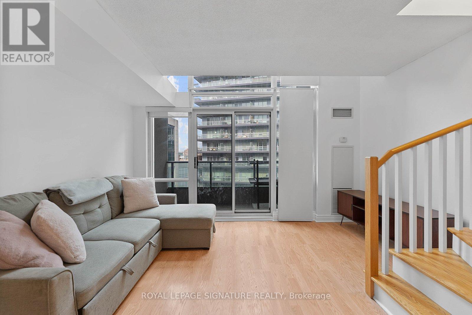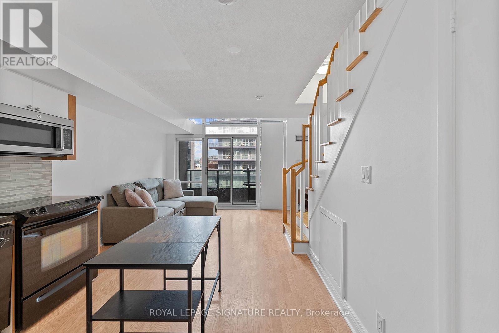 Turn-key and freshly painted, this bright two-storey suite offers a functional layout and exceptional natural light. The kitchen is generously sized and overlooking the living room, creating an open and connected main living space . The living room features a walk-out to the balcony and dramatic two-storey, floor-to-ceiling windows that fill the suite with natural light. A convenient 2-piece powder room completes the main level. Upstairs, the spacious bedroom includes in-suite laundry and a private ensuite bath, offering a comfortable and practical retreat. Ideally located close to everyday amenities, with Loblaws across the street and the Fleet streetcar at your doorstep. Enjoy being minutes from the waterfront and green space at Coronation Park. Parking and locker included. (id:64974)