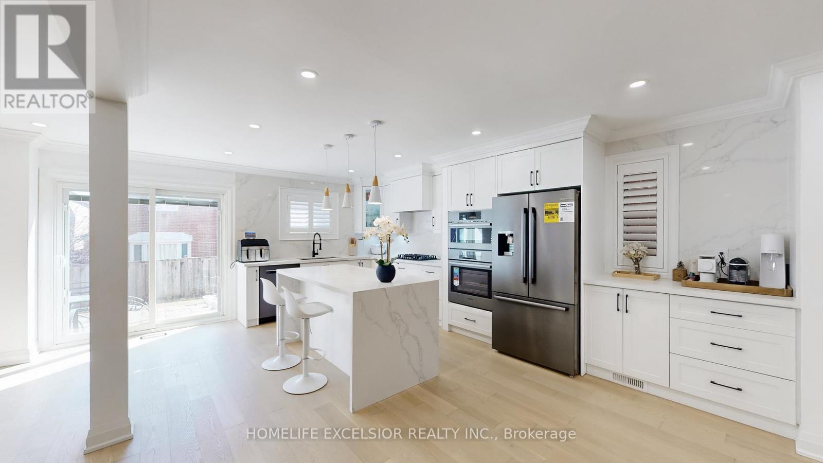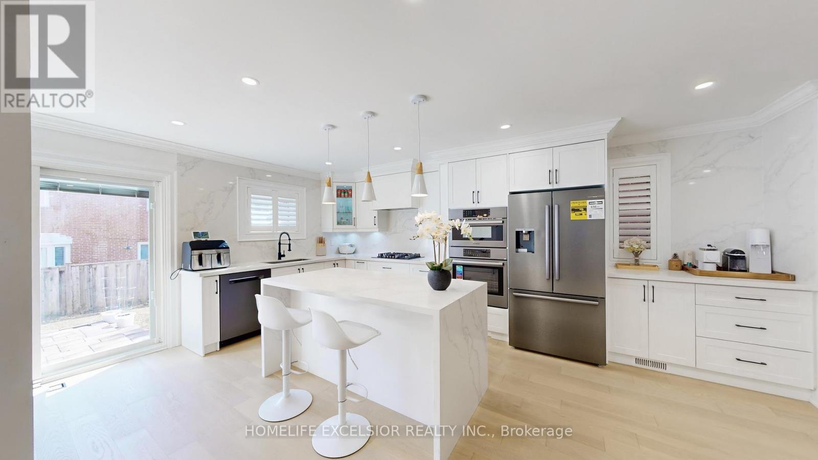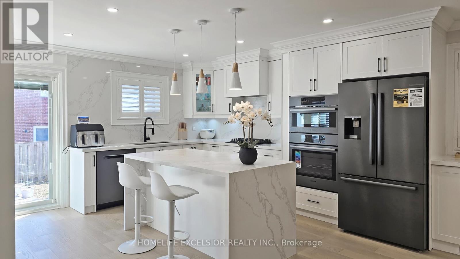 **YOUR DREAM HOME IS HERE** Fully renovated top to bottom in 2023. Chef's Kitchen with gas stove. Undermount sink with white quartz countertop & eat-in Island with storage. Bosch appliances. Open Concept Main Floor with light Engineer Hardwood flooring throughout. Smooth Ceiling w Pot lights throughout ALL floors. High-end Grohe fixtures throughout. 4 Bedrooms with custom built-in closet. California shutter throughout. High-efficiency furnace(2023); A/C Unit(2023); Tankless Water Heater(2023); Finished basement with 3pc bathroom, Vinyl Flooring and 2 rooms can that be used as office/bedroom/storage. Sought-after Thornhill location, walking distance to synagogue; Steps to Yorkhill Public School, Kosher Dining and Shopping. (id:64974)