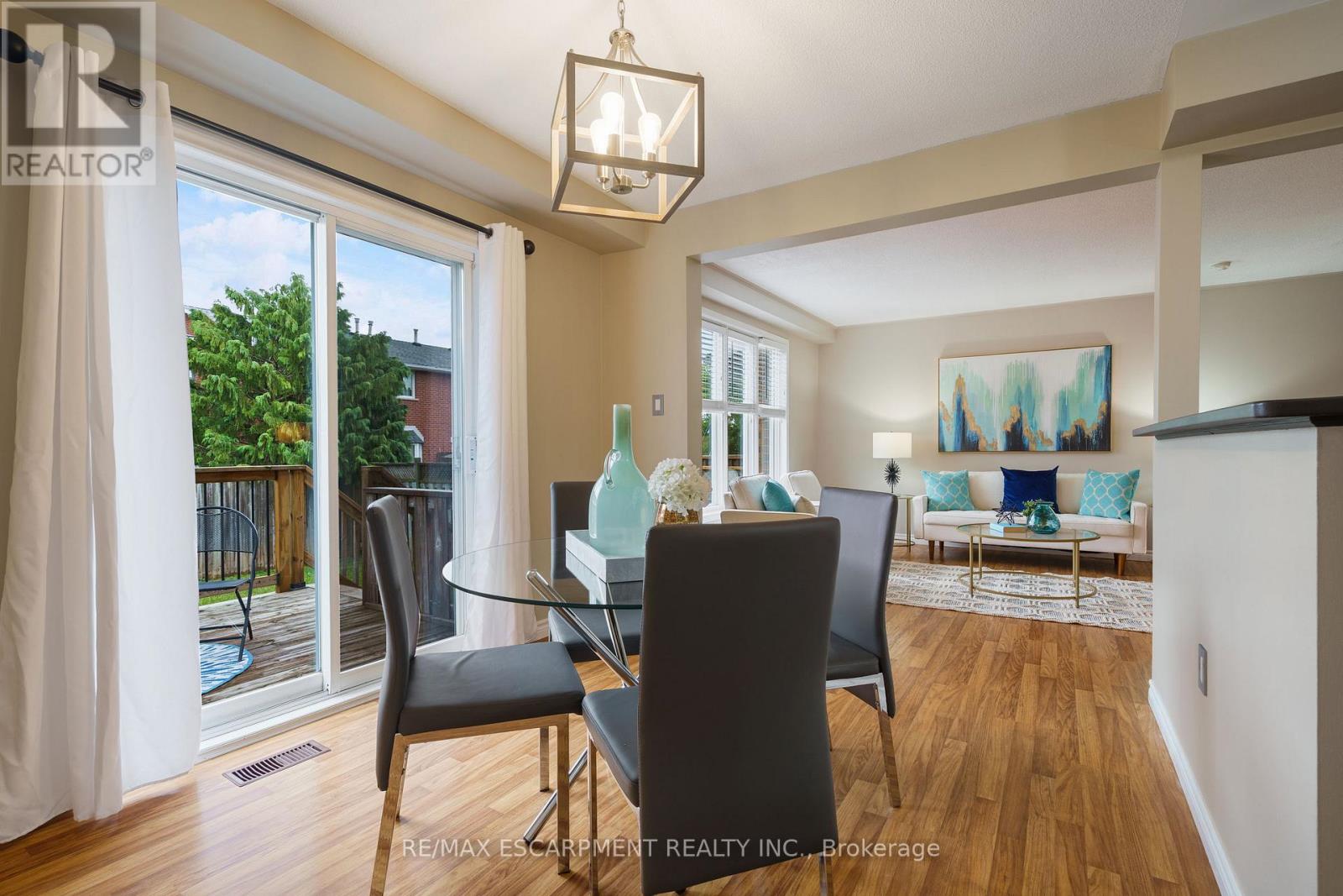 This beautifully maintained 3-bedroom, 3-bathroom freehold NO MAINTENANCE FEES townhome is located in highly sought-after Lower Stoney Creek and offers a rare double-car garage with inside entry, garage door opener, and double driveway. Inside, you'll find a bright open-concept living and dining area that flows into the updated kitchen, complete with a large breakfast bar-perfect for family time and entertaining. The main floor features newer laminate flooring, and the dining room opens through sliding doors to a lovely two-tier deck with a gas BBQ hookup and a fully fenced backyard. Upstairs, there are two bedrooms plus a full main bath, along with a private principal suite on its own level, featuring a 2-piece ensuite and two large closets. The additional bedrooms also offer generous closet space. The finished lower level provides even more living space with a spacious family room, plenty of storage, and a convenient 3-piece bathroom with a separate shower. The home has been freshly painted, and the exterior showcases well-kept landscaping-making it completely move-in ready. All of this in a quiet, family-friendly location, close to schools, parks, shopping, churches, and with easy access to the highway. Property is virtually staged. (id:64974)