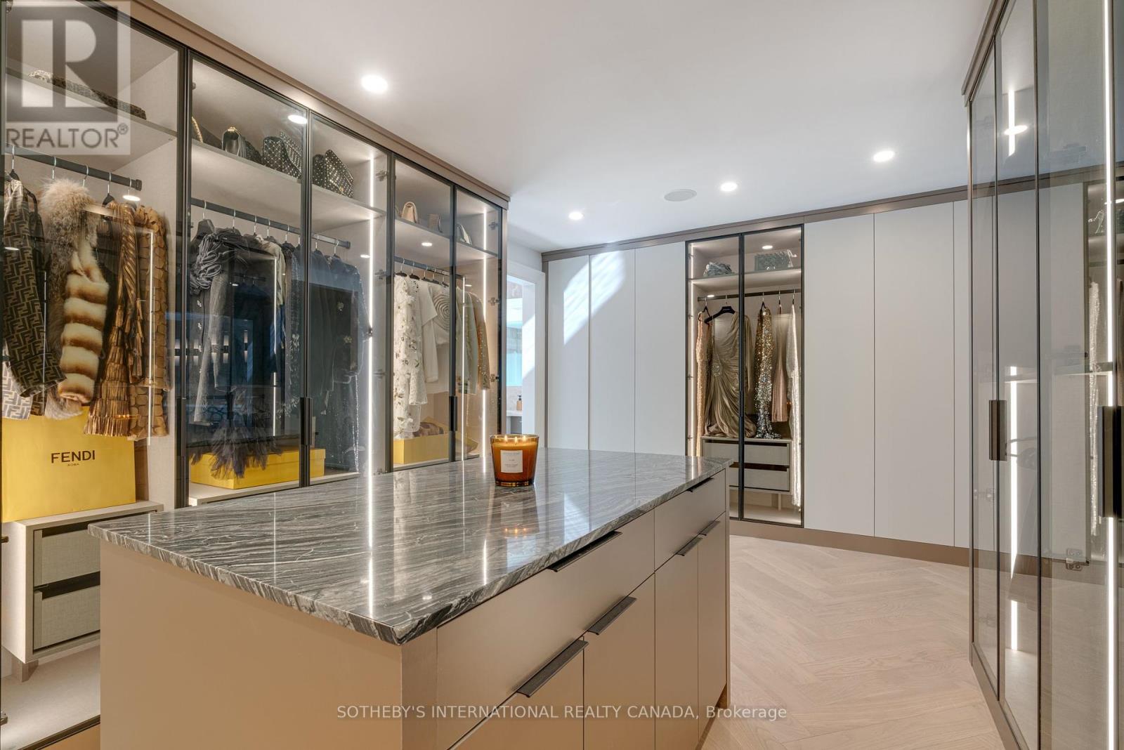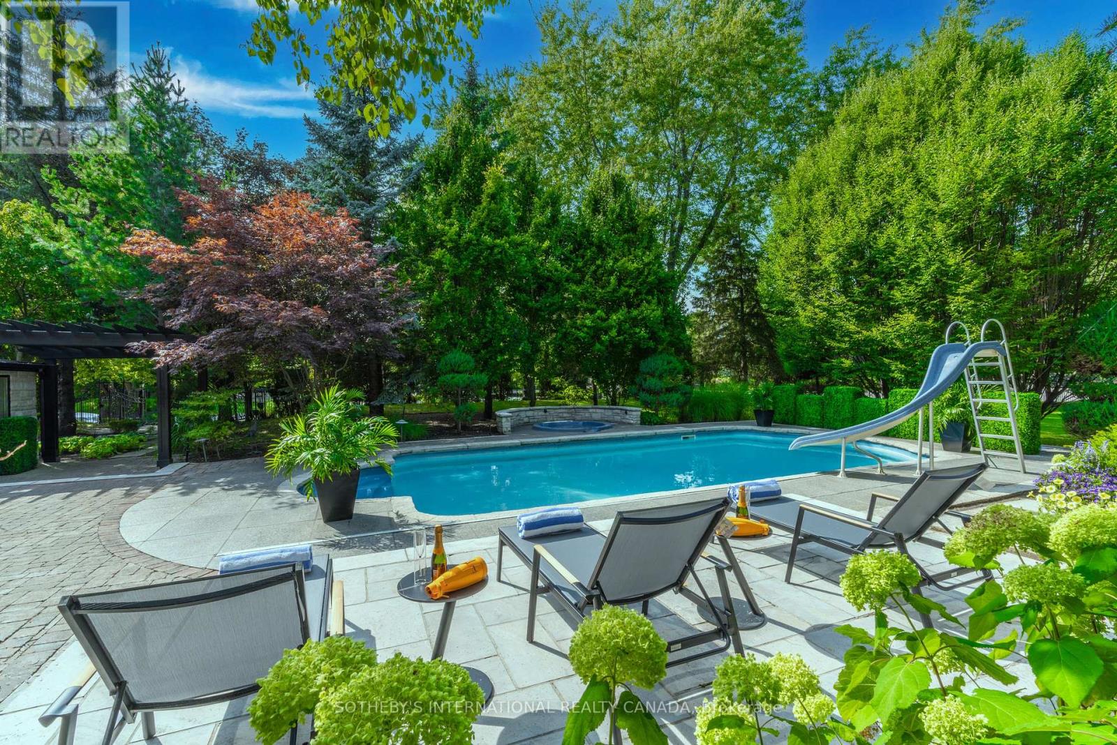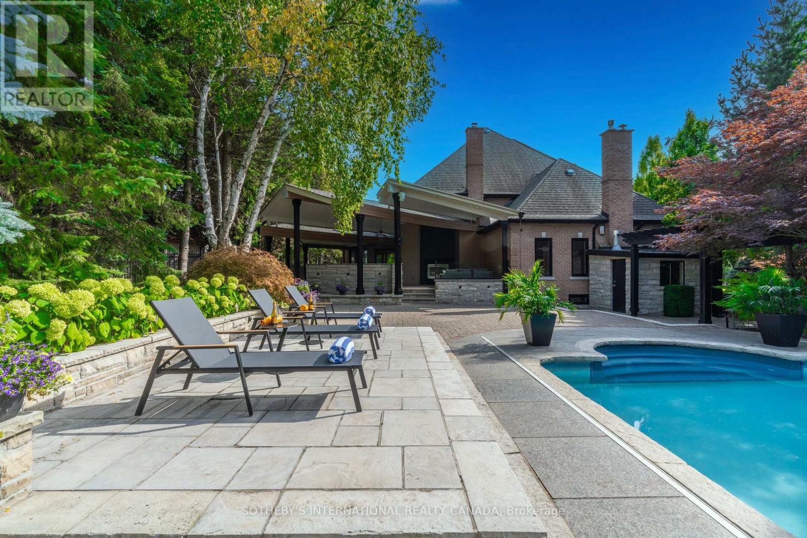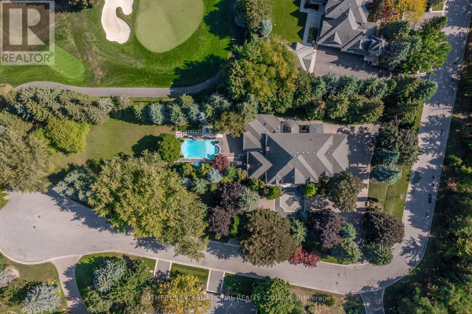 Fully renovated, this 5+1-bedroom, 8-bathroom transitional estate backs onto holes 6 and 7 of the prestigious National Golf Course in Woodbridge. Set on a private 1+ acre lot with dual-gated entrances, intricate stonework, professional landscape lighting, mature trees, and striking black glass doors at both the entrance and garages, the property blends quiet elegance with secure living. Inside, refined craftsmanship is showcased through slab stone finishes, marble fireplaces, and a grand reception entrance with a 3-storey floating staircase. The residence offers: A primary suite with a Fendi Casa inspired walk-in closet and spa-like bath, ensuite baths and built-in closets in every upper-level bedroom; 3+1 kitchens and 2 laundry rooms for ultimate convenience; a wellness area with heated floors, change room, powder room and contemporary spa-shower plus direct pool access. Media and games rooms, sauna, home gym (or nanny's suite), and a dedicated space for a customized panic room. The resort-style backyard is designed for entertaining with an inground pool, covered loggia with outdoor kitchen and fireplace, dining and seating areas, and open, park-like grounds perfect for growing an organic vegetable garden or children's play. Parking for 15 vehicles includes a 3-car garage with lift-ready capacity. Move-in ready before Christmas, this estate combines contemporary luxury, privacy, and security - perfect for the discerning buyer. *Some pictures are virtually furnished. (id:64974)