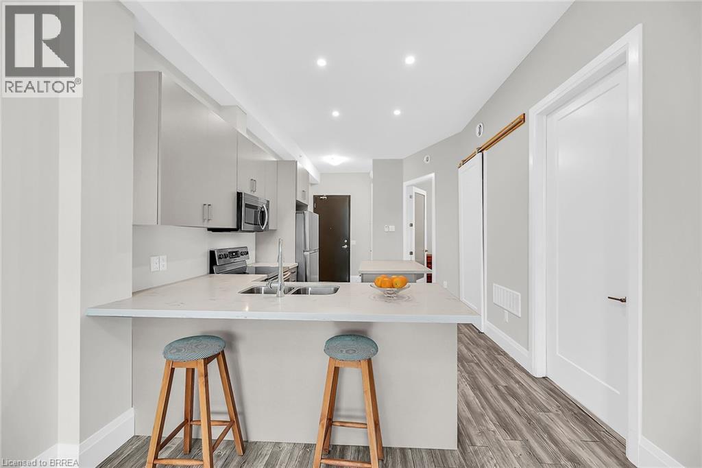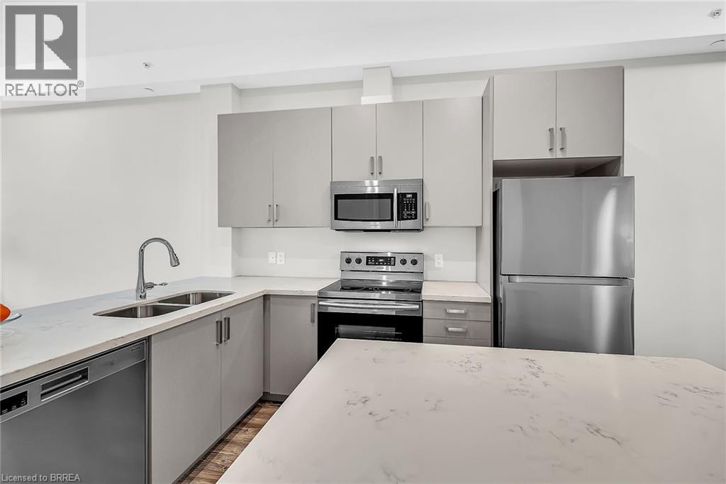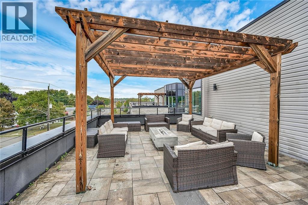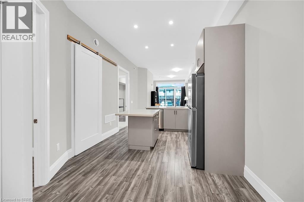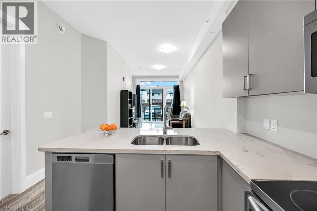 LIFE MADE EASY!!! Situated just blocks away from the picturesque Grand River and some of the finest hiking trails, the Lofts on Morrell offers modern living in a charming location close to many restaurants, access to the 403, the hospital and much more. Everything you need is handily located within this Stylish condo complex with many modern and tasteful conveniences. This spacious unit is bright and cheery with the floor to ceiling windows and patio doors to your private patio. You can also entertain on one of 2 Rooftop patios equipped with a Community BBQ and a lovely lounge/party room available to book for private functions. Amenities Galore. This unit with impressive 10ft. ceilings & 8 ft doors has an open concept LR/Kitchen design, 2 bedrooms, 4pc bath, in-suite laundry behind a sliding barn door and was recently professionally painted and cleaned throughout and ready for you to move in immediately. New furnace installed Oct 2025 & A/C replaced in 2022. Exclusive parking is conveniently located just outside the rear entrance. (id:64974)