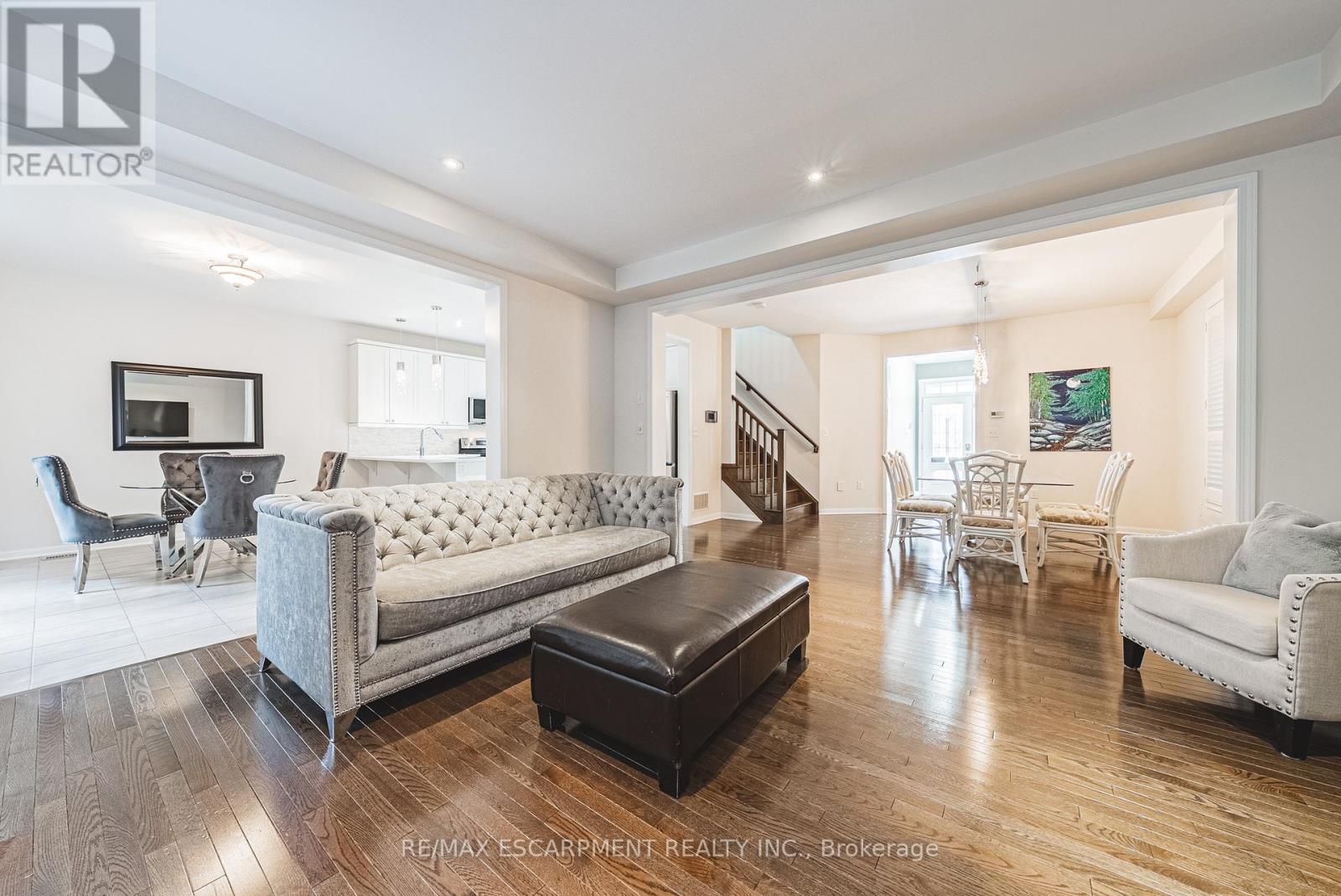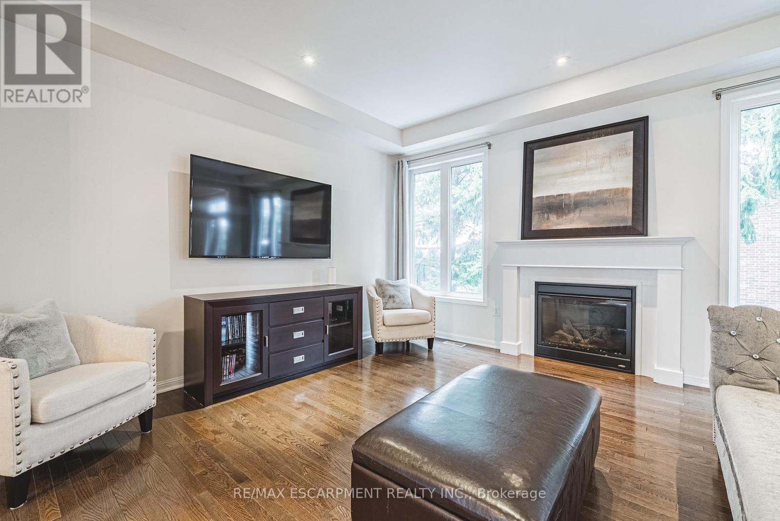 Spectacular 4-bedroom home with walk-out basement, ideally located across from a park and within walking distance to schools. This beautifully designed residence features a sleek, open-concept layout with impressive kitchen including quartz countertops, stainless steel dishwasher and microwave, elegant marble backsplash, breakfast bar, kitchen dining area with patio doors to balcony, extended upper shaker cabinetry, full-wall pantry, pot drawers and a lazy Susan-perfect for both everyday living and entertaining. This family friendly home also offers a separate formal dining area, adding versatility and charm and open to the impressive great room showcasing coffered 9-foot ceilings, smooth finishes, rich dark-stained hardwood floors, and an abundance pot lighting, creating a refined, magazine-worthy ambiance. The welcoming foyer features a custom niche seating area and the main floor also includes a guest powder room. Enjoy this carpet free home with hardwood flooring & ceramic throughout the first and 2nd floors. The fully finished basement showcases laminate flooring, 4 piece bath, office, spacious Rec room with walk-out to the rear yard and ample storage. The second level boasts four generously sized bedrooms, including a luxurious primary suite with a spa-inspired ensuite featuring a glass shower, soaker corner tub, and elegant finishes. This 2nd floor also provides a second full bathroom and spacious laundry room for every day convenience. Close to all Ancaster has to offer, including shopping, restaurants, golf courses and more. Room sizes approximate. (id:64974)