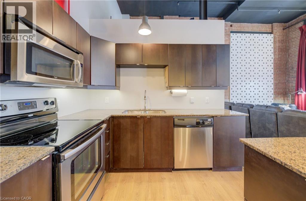 MODERN LOFT LIVING! Welcome to this stunning loft, where soaring 16ft ceilings and expansive windows create a bright, airy ambiance. Featuring polished concrete floors, exposed brick, ducts, pipes, and iron columns, this space seamlessly blends original character with modern sophistication. Set within a 1910 fabric weaving factory stylishly converted into loft-style residences, Unit #112 offers over 1,250 sqft of thoughtfully designed living space. This one-bedroom plus den unit includes two full bathrooms, with the upper primary suite featuring a private ensuite. The kitchen is a chef’s dream, boasting an eat-in island, granite countertops, under-cabinet lighting, custom cabinetry, and stainless steel appliances. Above the den, a unique loft space—currently used as a gym—offers endless possibilities, from a cozy reading nook to a creative retreat. Additional conveniences include in-suite laundry, a private front door entry, one outdoor parking space, and a storage unit. Building amenities include a gym and party room. Perfectly located just steps from downtown, enjoy locally roasted coffee, boutique shops, the library, and a leisurely walk across the Grand River Pedestrian Bridge. You’ll also find Gaslight and Spruce Park mere minutes away. Experience the perfect blend of history, charm, and modern living—this loft is truly one of a kind! (id:64974)