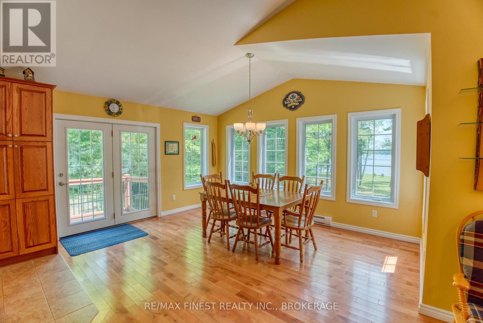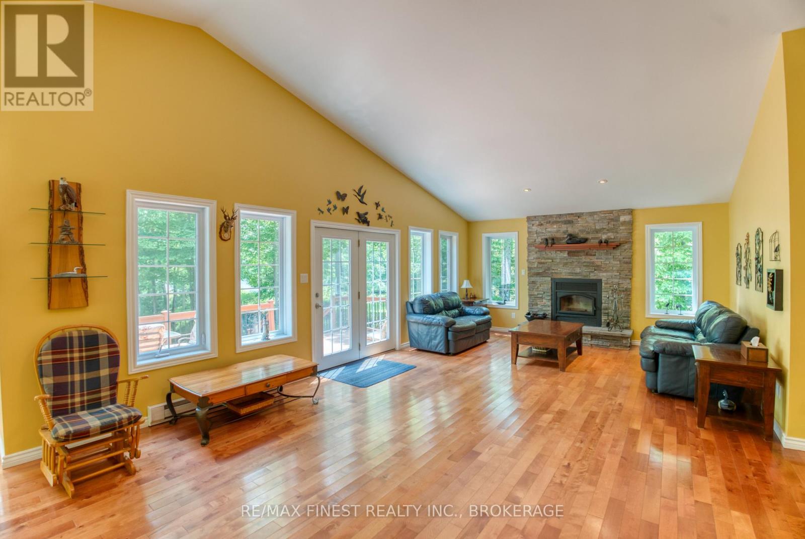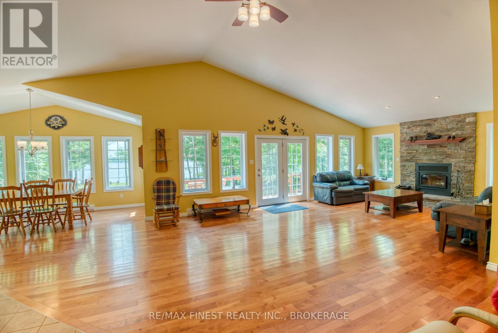 Welcome to beautiful and unique waterfront offerings on Bobs Lake - where space, privacy, and true four-season living come together. Built in 2009, this well-designed home or cottage was made for year-round use, not just summer weekends. The open-concept main level features vaulted ceilings, a custom stone fireplace, and large windows that draw your attention straight to the lake. With four generously sized bedrooms and two full bathrooms all on one level, it's perfectly suited for hosting family and friends without compromise. The full walk-out basement is a blank canvas - whether you envision additional living space, a recreation area, or a private guest suite, the opportunity is already built in. Step outside and the property separates itself. Set on over 6 acres with an expansive, level lakeside lawn, this is the kind of land that's becoming increasingly hard to find. The shoreline stretches an incredible 960 feet, offering fantastic privacy, multiple waterfront settings, and endless potential to shape the property into exactly what you want it to be. South-facing views mean all-day sun across the water - from quiet morning coffees to long summer evenings at the shoreline. And this isn't just a summer escape. In warmer months, enjoy boating, swimming, and exploring one of the largest inland lakes in the region. When winter arrives, the setting transforms - perfect for snowmobiling, ice fishing, and quiet weekends by the fire. With easy, year-round access just off a municipal road, this is a property you can truly use in every season. Located between the villages of Sharbot Lake and Westport, you have convenience when you need it - and complete privacy when you don't. Opportunities like this - combining acreage, significant shoreline, and a newer build - are rare on Bobs Lake. (id:64974)