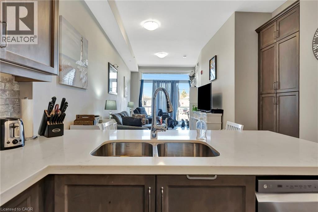 Experience effortless modern living in this stunning ground-floor suite featuring 2 bedrooms and 2 bathrooms. Designed with both comfort and style in mind, this contemporary home offers soaring ceilings, an open-concept layout, and a sun-filled living space perfect for entertaining or unwinding. The sleek kitchen flows seamlessly into the bright living area and out to your spacious private balcony—ideal for morning coffee or evening relaxation. Enjoy the convenience of in-suite laundry, all appliances included, and two dedicated parking spaces—an incredible bonus rarely found. Residents also have access to exceptional amenities, including two expansive BBQ patios perfect for gatherings and outdoor dining. Perfectly located near the Grand River, Rotary Bike Park, Wilkes Dam, Brantford General Hospital, and an array of restaurants and (id:64974)
