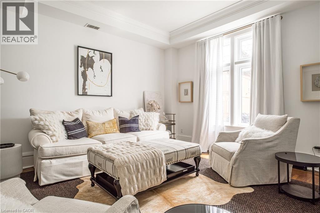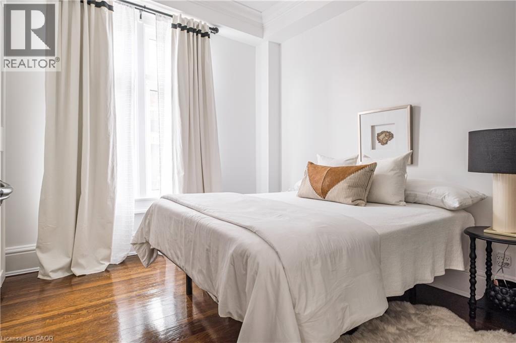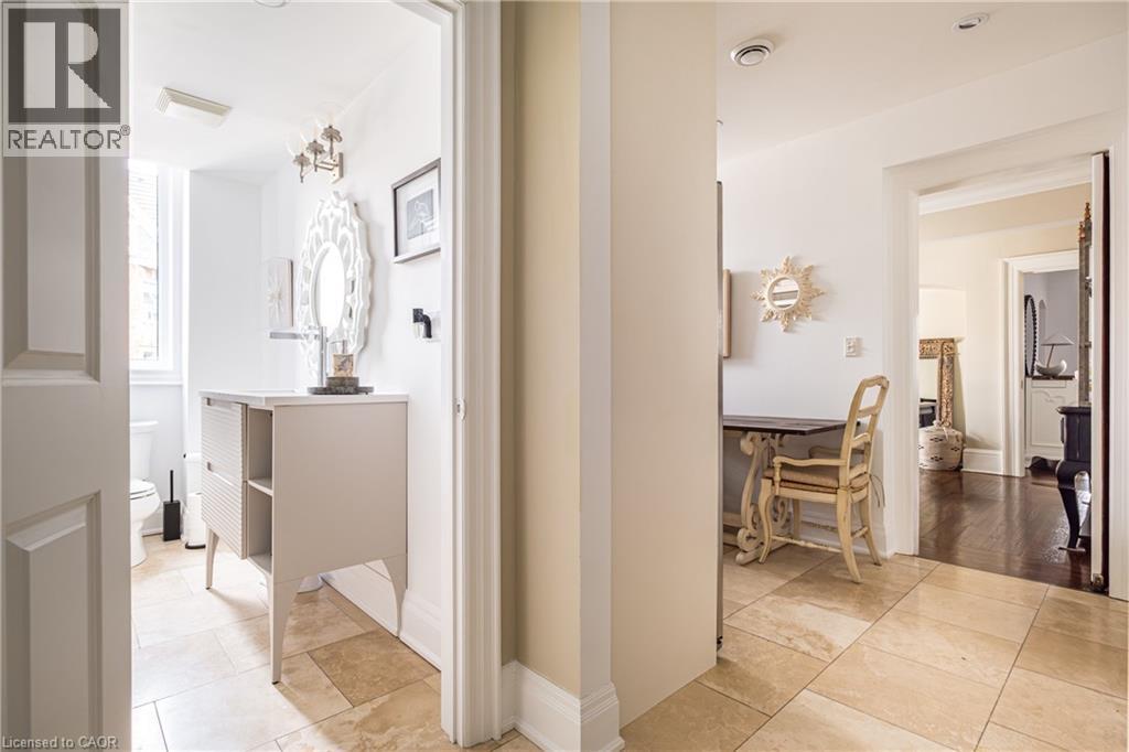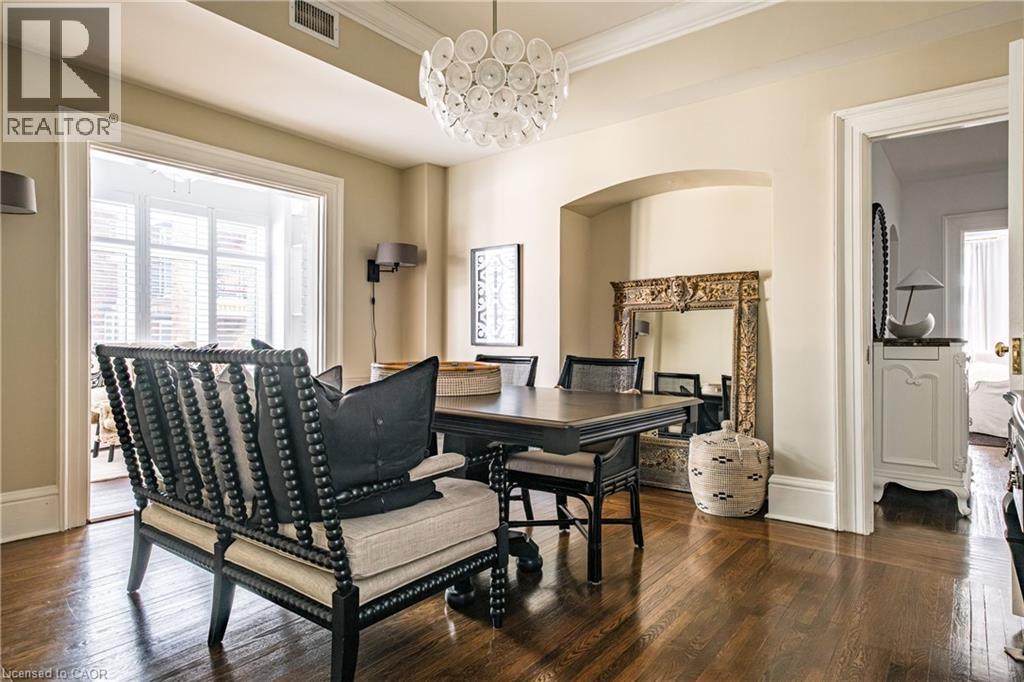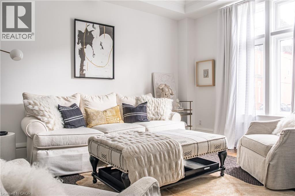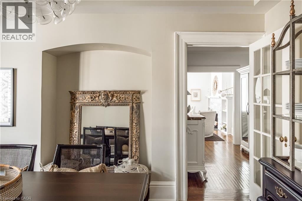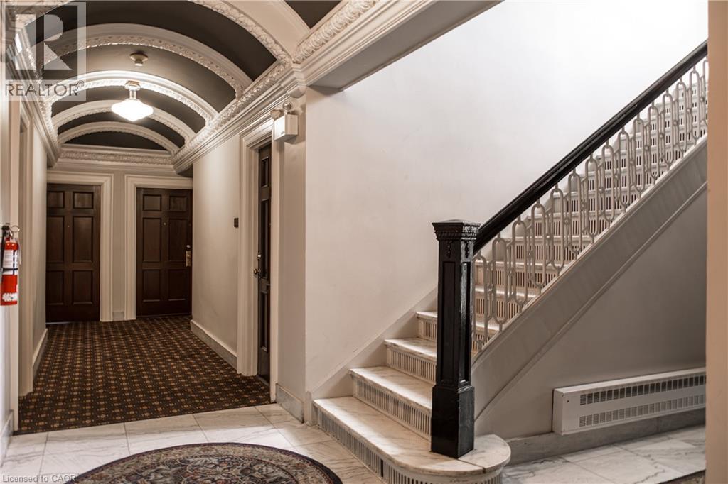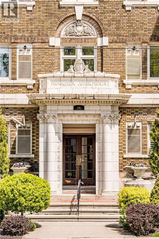 Welcome to the historic “Herkimer Apartments”, one of Hamilton’s most prestigious condo conversions, located in the heart of the Durand neighbourhood. Designed by renowned architect William Palmer Witton and built in 1915, this landmark was once the pinnacle of luxury living, featuring marble staircases, ornate moldings, steam heating, and Canada’s first elevator and central vac system. It remains Ontario’s last standing building with a terracotta portico. Today, Herkimer Apartments continues to captivate with 23 exquisite condo’s including this stunning 1,728 sq ft unit, which retains its original floorplan and offers two separate entrances. Inside, you'll find gleaming dark hardwood floors, soaring high ceilings, 10” baseboards, crown molding, and elegant finishes throughout. The original servant’s door, steps into a discreet back entry with storage, a stunning 2-piece bath, laundry, and utility room. The bright, spacious kitchen features granite countertops, stainless steel appliances, butler pantry station, and original swinging door leading to the formal dining room, ideal for hosting dinner parties and family gatherings. An adjacent sunroom features built-in bookcases and is the perfect space for a den or home office. The formal front entrance invites you into a spacious hallway and elegant living room featuring a fireplace with stunning Carrara marble surround and built-in bookshelves and the perfect place to relax or entertain. The bedroom wing boasts a newly renovated 4-piece bath with marble floors and two spacious bedrooms, including the primary with walk-in closet. Residents have access to a rooftop terrace with panoramic city views to enjoy. Updates incl furnace (2020) washer & dryer (2019) both bathrooms (2019). Just steps from St. Joseph’s Hospital, Locke Street S, parks, trails, GO Station and Hwy 403 access makes this is an extraordinary opportunity for the sophisticated buyer seeking a home with timeless elegance and historical significance. RSA. (id:64974)