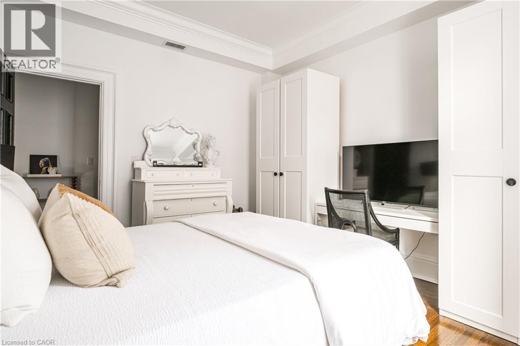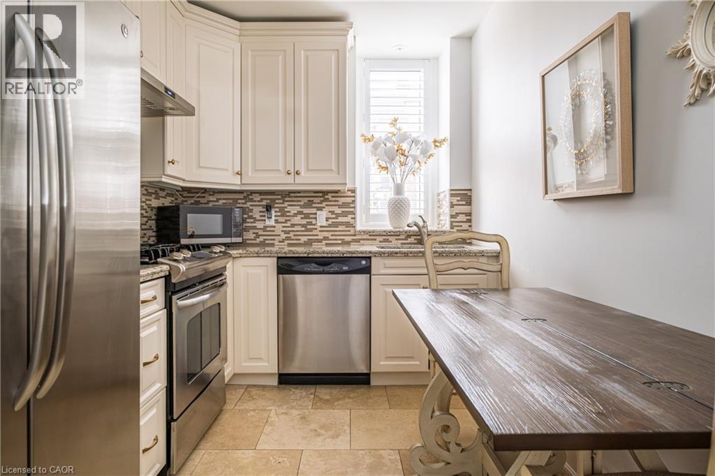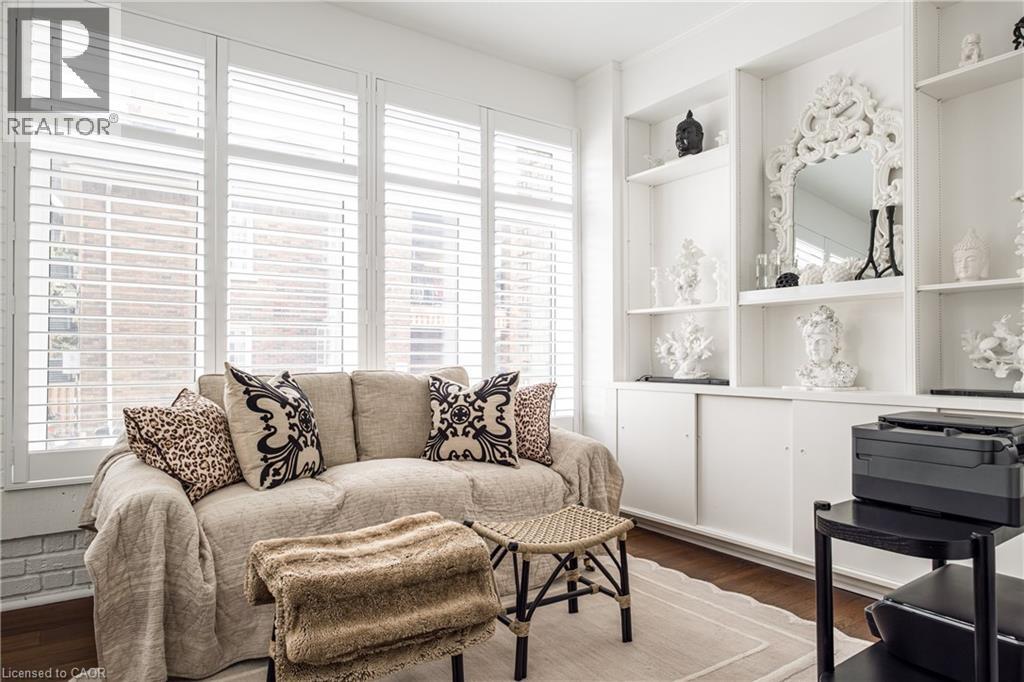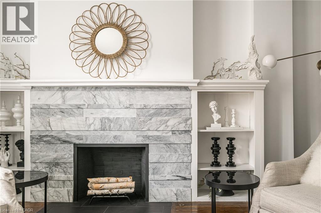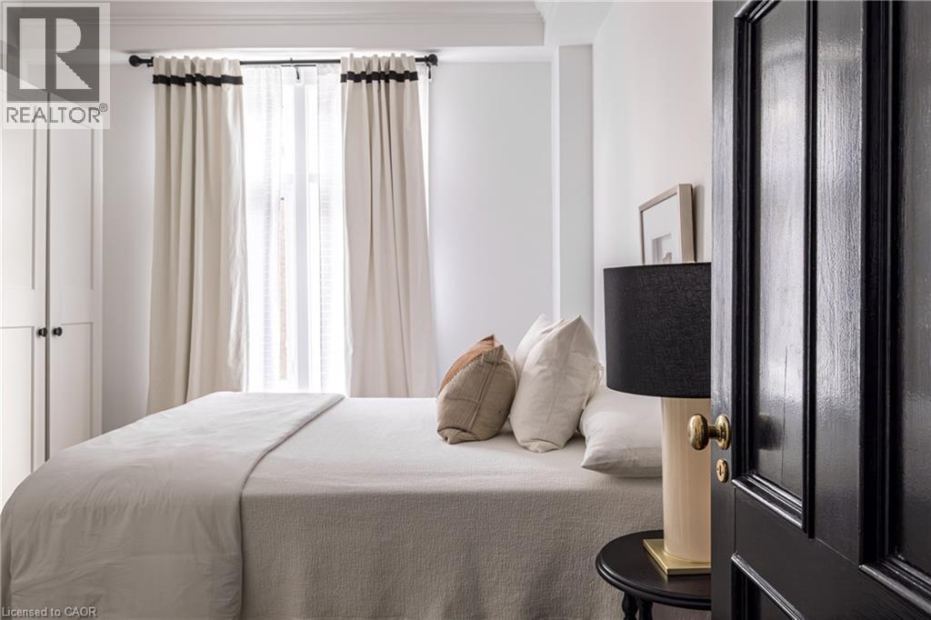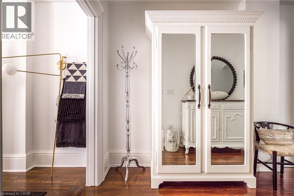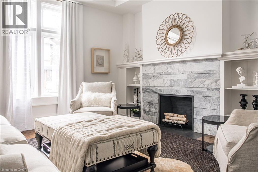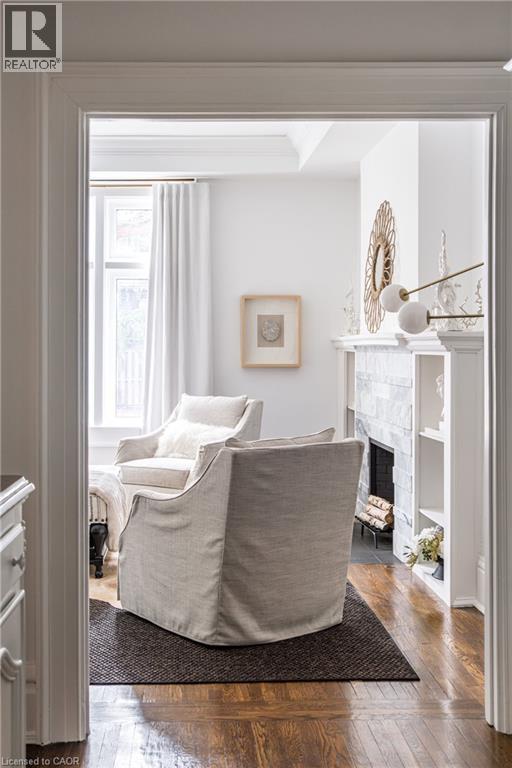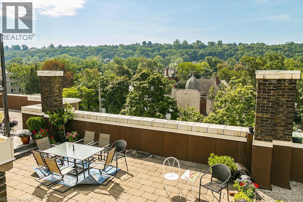 Welcome to the historic “Herkimer Apartments”, one of Hamilton’s most prestigious condo conversions, located in the heart of the Durand neighbourhood. Designed by renowned architect William Palmer Witton and built in 1915, this landmark was once the pinnacle of luxury living, featuring marble staircases, ornate moldings, steam heating, and Canada’s first elevator and central vac system. It remains Ontario’s last standing building with a terracotta portico. Today, Herkimer Apartments continues to captivate with 23 exquisite condo’s including this stunning 1,728 sq ft unit, which retains its original floorplan and offers two separate entrances. Inside, you'll find gleaming dark hardwood floors, soaring high ceilings, 10” baseboards, crown molding, and elegant finishes throughout. The original servant’s door, steps into a discreet back entry with storage, a stunning 2-piece bath, laundry, and utility room. The bright, spacious kitchen features granite countertops, stainless steel appliances, butler pantry station, and original swinging door leading to the formal dining room, ideal for hosting dinner parties and family gatherings. An adjacent sunroom features built-in bookcases and is the perfect space for a den or home office. The formal front entrance invites you into a spacious hallway and elegant living room featuring a fireplace with stunning Carrara marble surround and built-in bookshelves and the perfect place to relax or entertain. The bedroom wing boasts a newly renovated 4-piece bath with marble floors and two spacious bedrooms, including the primary with walk-in closet. Residents have access to a rooftop terrace with panoramic city views to enjoy. Updates incl furnace (2020) washer & dryer (2019) both bathrooms (2019). Just steps from St. Joseph’s Hospital, Locke Street S, parks, trails, GO Station and Hwy 403 access makes this is an extraordinary opportunity for the sophisticated buyer seeking a home with timeless elegance and historical significance. RSA. (id:64974)