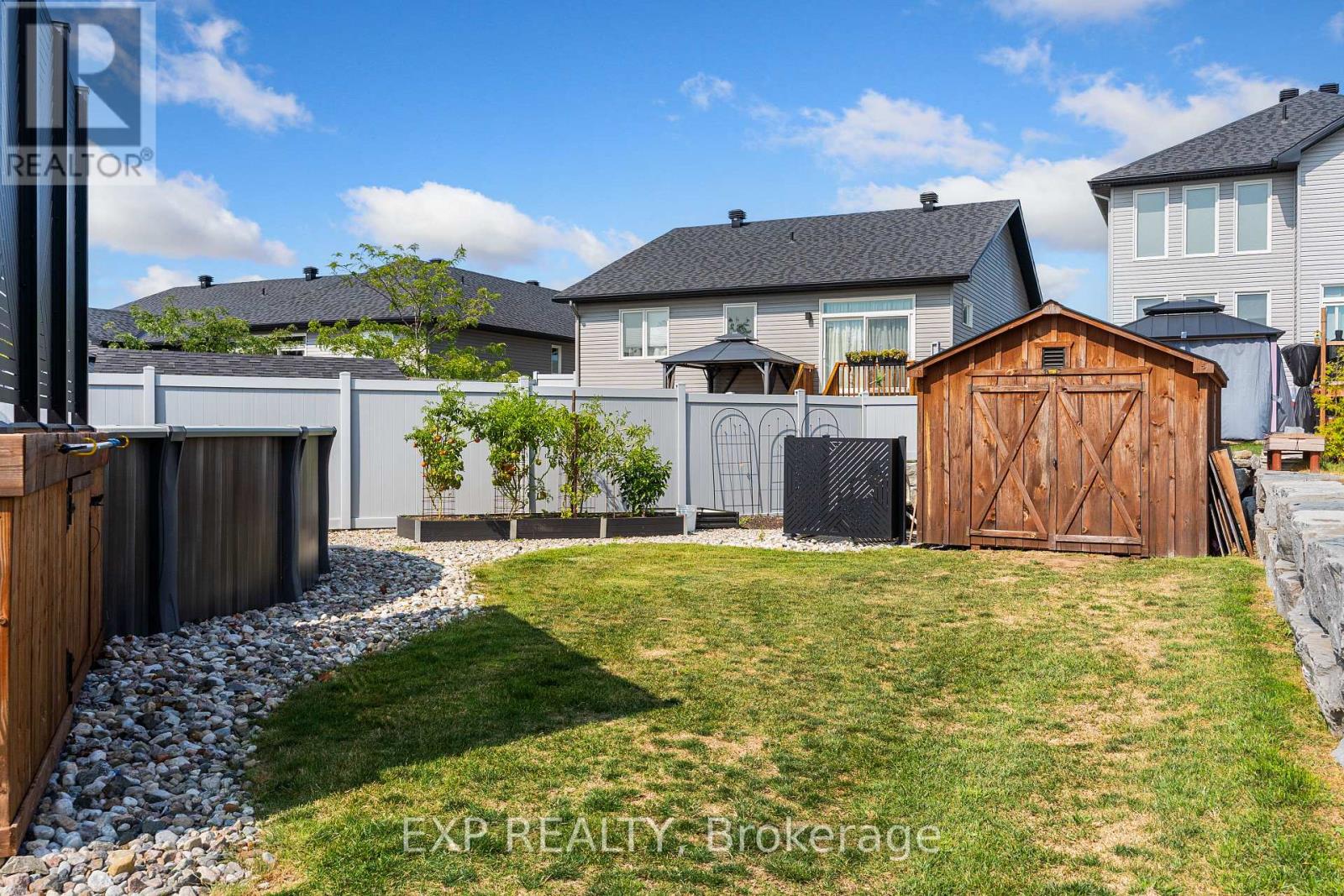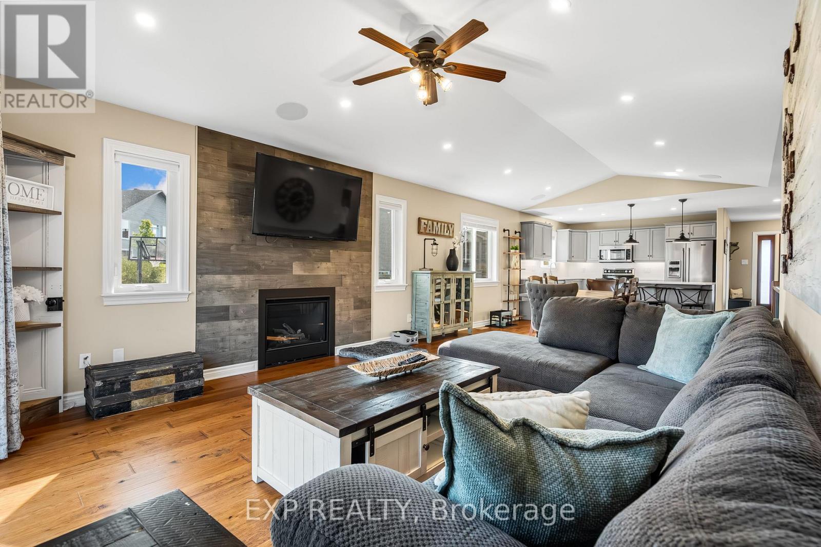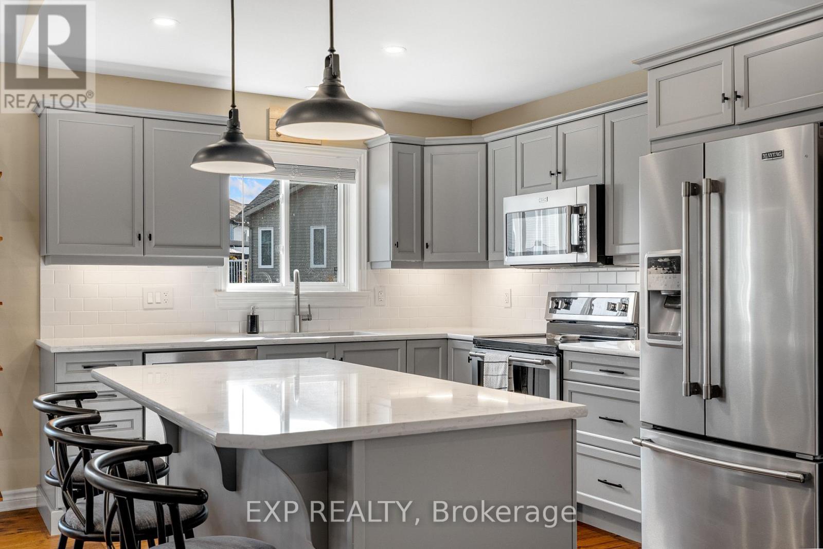Experience luxury living in Mill Run, Almonte with this exceptional 4-bedroom, 3-bath bungalow, perfectly nestled on an expansive pie-shaped lot. Constructed in 2019, The McIntosh welcomes you with a striking front entrance and tiled foyer featuring ample closet storage and a stylish sliding barn door. A spacious front office, bathed in natural light, provides the perfect workspace or reading nook. Step into the heart of the home in a stunning Deslaurier-designed kitchen complete with granite countertops and premium stainless-steel appliances, seamlessly flowing into an open-concept dining and living room. Gather by the modern gas fireplace or enjoy effortless indoor-outdoor entertaining with 8 feet patio doors leading to multi-level decks and a backyard oasis. The main level boasts elegant hardwood barn-style flooring, laundry/mudroom with extra storage, two large kids bedrooms, and a crisp family bath. Also on the main floor is your private primary suite, a true retreat with generous proportions, a walk-in closet, and a spa-inspired ensuite. The finished basement extends the living space with a bright family room warmed by an additional fireplace, a fourth bedroom, full bath, and abundant storage solutions including an area for a gym. Parking is never an issue with an insulated and heated double garage plus a triple-wide, six-vehicle driveway. Enjoy a backyard designed for every lifestyle: a paved sports/basketball area, versatile decks for summer dining, a shaded patio, a salt-water heated above-ground pool, plus mature gardens and handy storage shed. This thoughtfully designed home blends everyday comfort with standout style. Located only minutes from Almonte's vibrant core of shops & restaurants & amenities. This home provides the perfect balance of modern living and small-town charm. Don't miss your opportunity to make it yours. Schedule your private tour today. (id:64974)