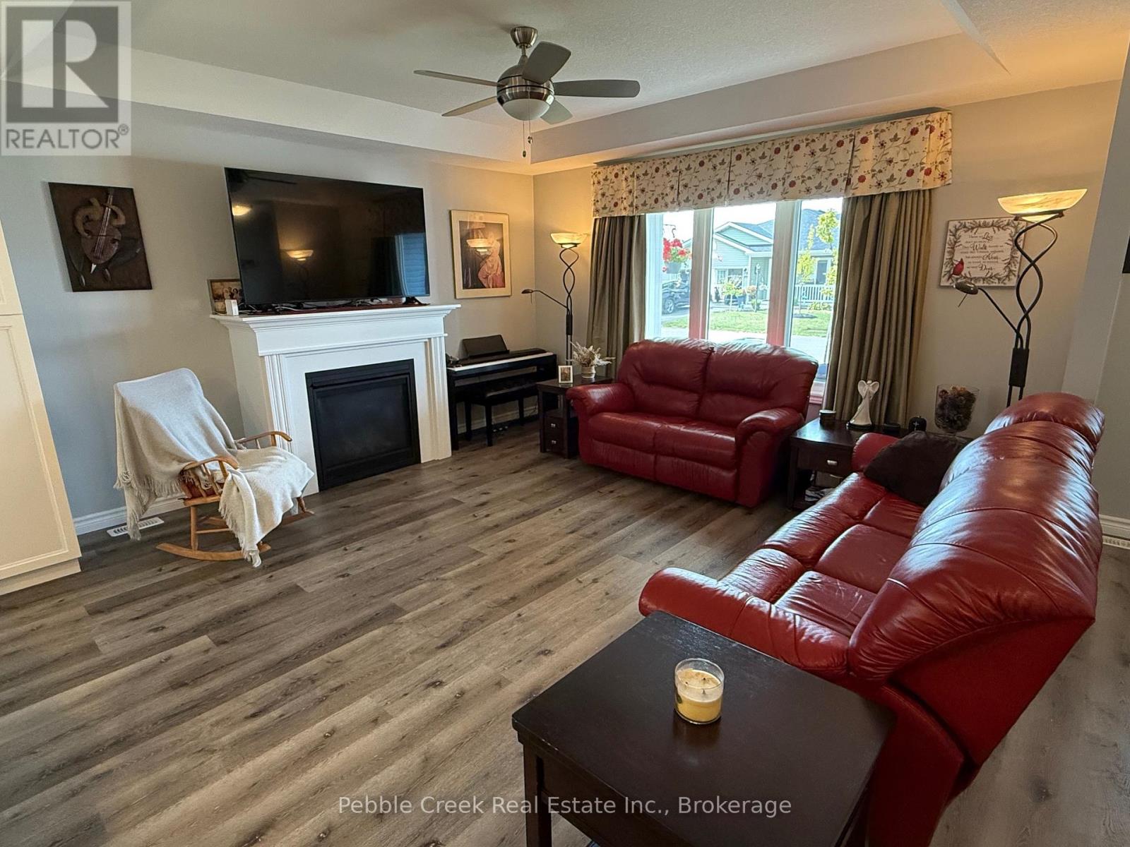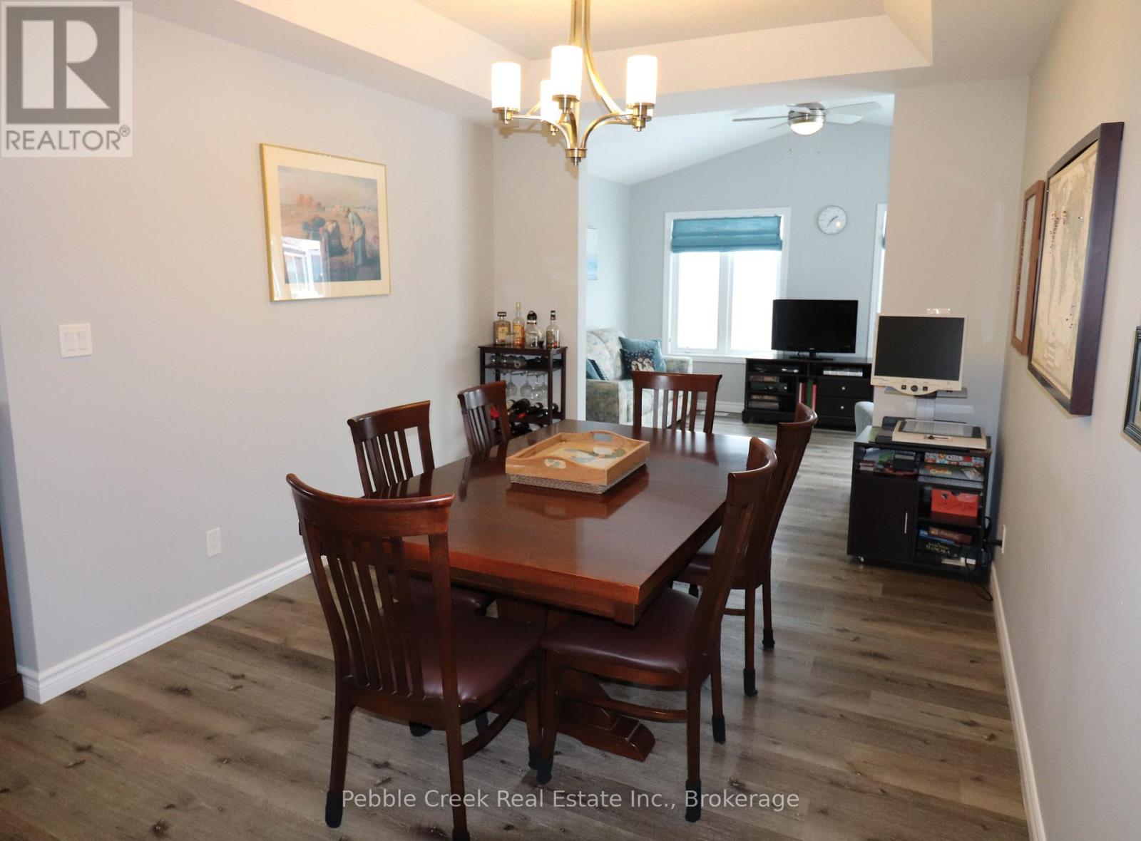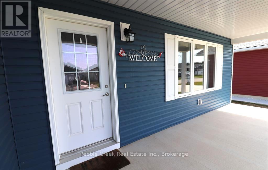 Welcome to an amazing lifestyle! Imagine living along the shores of Lake Huron, close to Goderich with its historic town square and abundance of shopping, fantastic golf courses and your own private community recreation center with indoor pool, library and entertainment facilities. This very popular Cliffside B with Sunroom model features nearly 1600 sq ft of living space and a long list of upgrades! Once you step inside this beautiful home, you will be impressed with the spacious open concept, living room with gas fireplace and tray ceiling! The adjacent kitchen offers an abundance of cabinets with oversized center island, pots and pan drawers, pantry, corner turntable and upgraded appliances. The dining room also sports a tray ceiling and the cozy sunroom has a vaulted ceiling and patio doors leading to the extended size composite deck with privacy screen at the end. There's also a large primary bedroom with walk-in closet and 3 pc ensuite bath and a spacious guest room with 4pc bath right beside. Additional features include kitchen pantry and extended height cabinets as well as upgraded light fixtures. Also located throughout the home are custom blinds which are sure to impress! The home offers plenty of storage options as well with an attached 2 car garage, lots of closets and a full crawl space underneath! Situated in The Bluffs at Huron land lease community, just a few streets back from the lake and rec center, this home is a must see for anyone considering moving to this upscale adult subdivision! Bonus 6 appliances included! (id:64974)