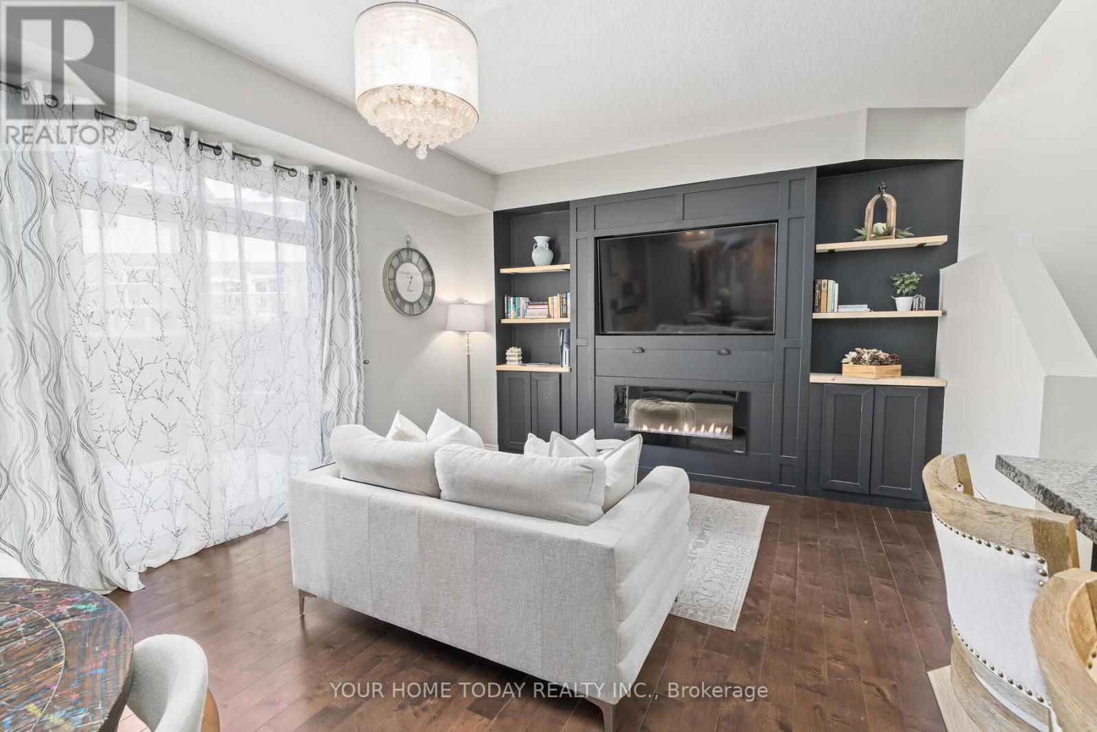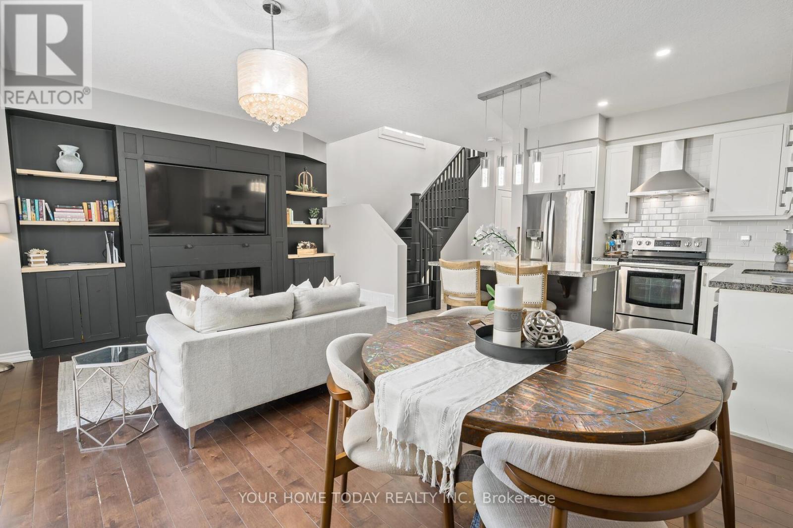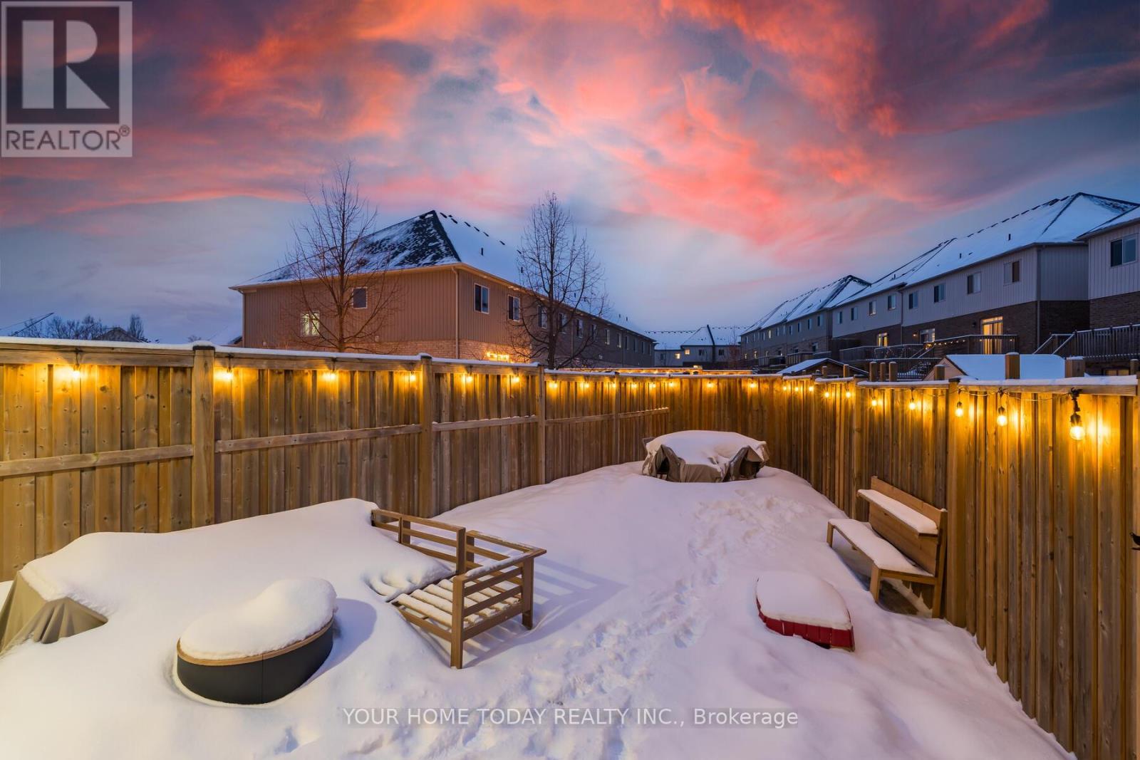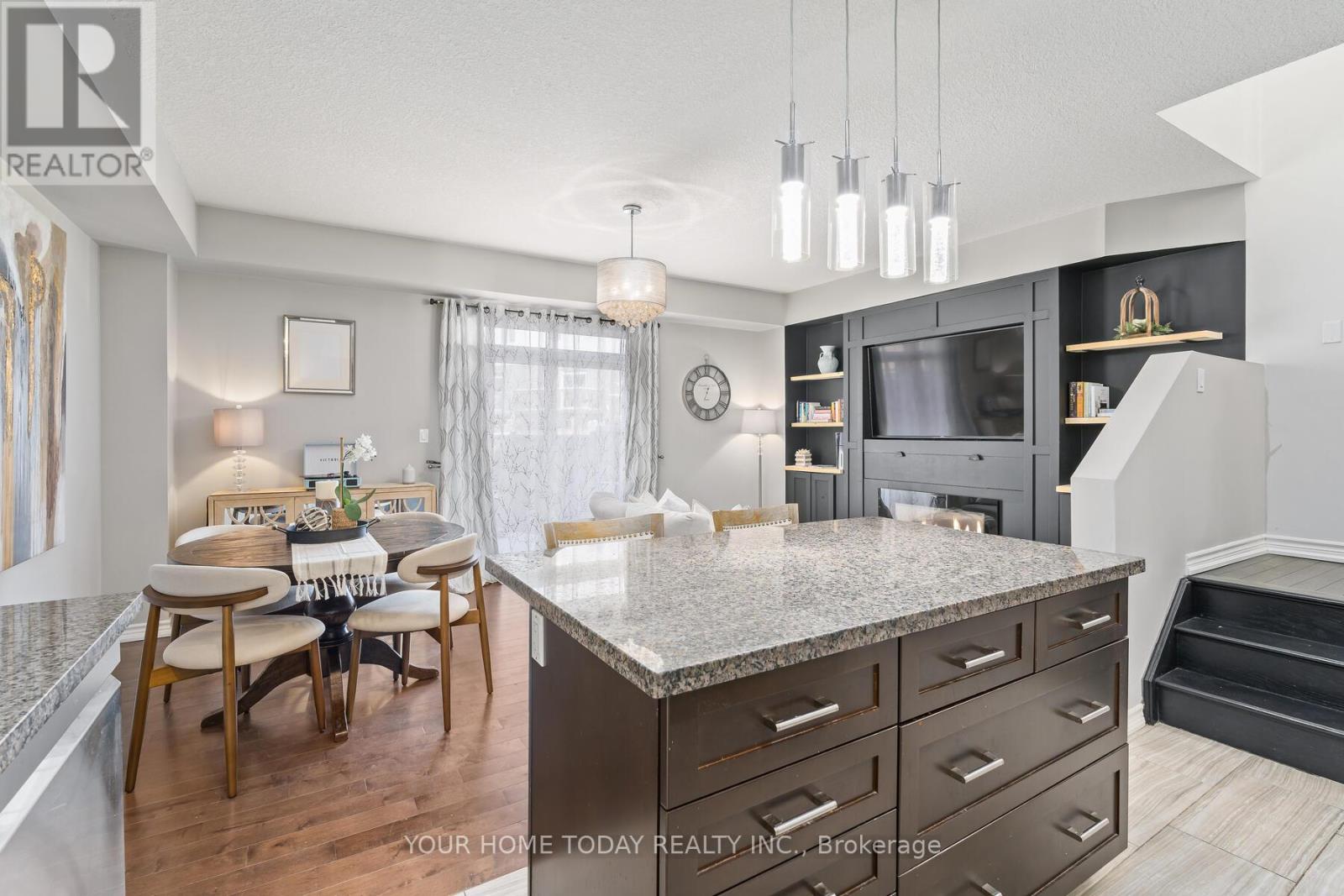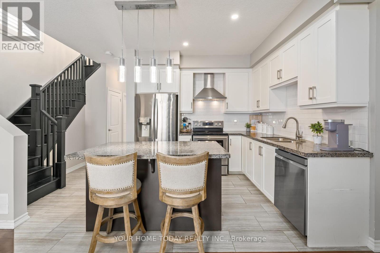 Situated in Guelph's highly desirable east end, this exceptional end unit townhome is set in a quiet family-oriented neighbourhood just minutes from schools, parks, library and picturesque trails. Enjoy the convenience of nearby amenities, the proximity of Guelph University and effortless access to major commuter routes. An inviting covered porch and professionally installed, all season, Gemstone lighting welcome you into the bright, open-concept main level where a thoughtfully designed floor plan makes everyday living and entertaining a delight. The living room showcases an eye-catching built-in wall unit with a toasty electric fireplace, open shelving and practical storage along with a convenient walkout to the yard. The adjoining dining area and kitchen add to the open vibe. The stunning kitchen serves as the heart of the home, showcasing beautiful two-tone cabinetry, a generous island with seating and sleek granite countertops - a perfect blend of style and functionality. A chic powder room completes this level. A lovely wood staircase leads to the upper level where the primary suite offers a walk-in closet and a beautifully finished 3-piece ensuite bath. Two additional bedrooms share a stylish 4-piece bathroom. The convenience of second-floor laundry with built-in cabinetry is a bonus. The finished lower level extends the living space with a cozy rec room featuring pot lights and laminate flooring while still providing ample storage and utility space. Rough-ins for a 3-piece bathroom and wet bar are a bonus! The fenced yard is almost maintenance free with large patio area (almost 90% of yard) providing the perfect outdoor entertaining space. Parking for three vehicles (one in garage, two in driveway) completes this impressive offering. (id:64974)