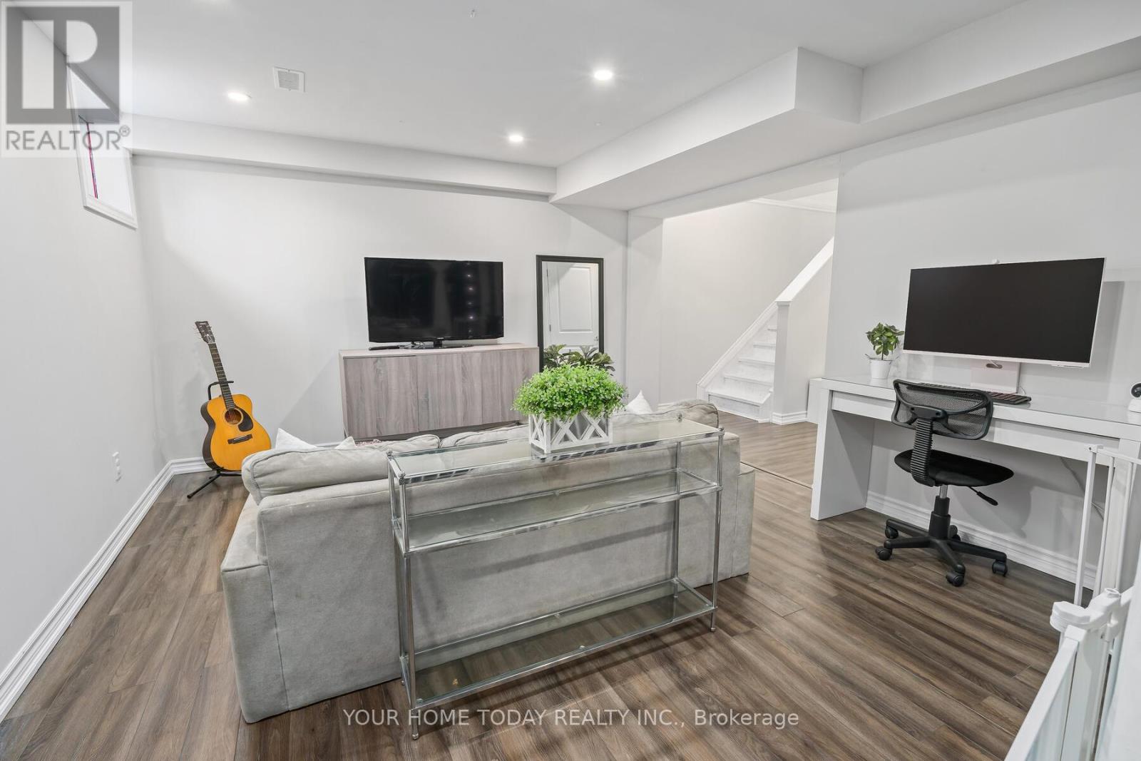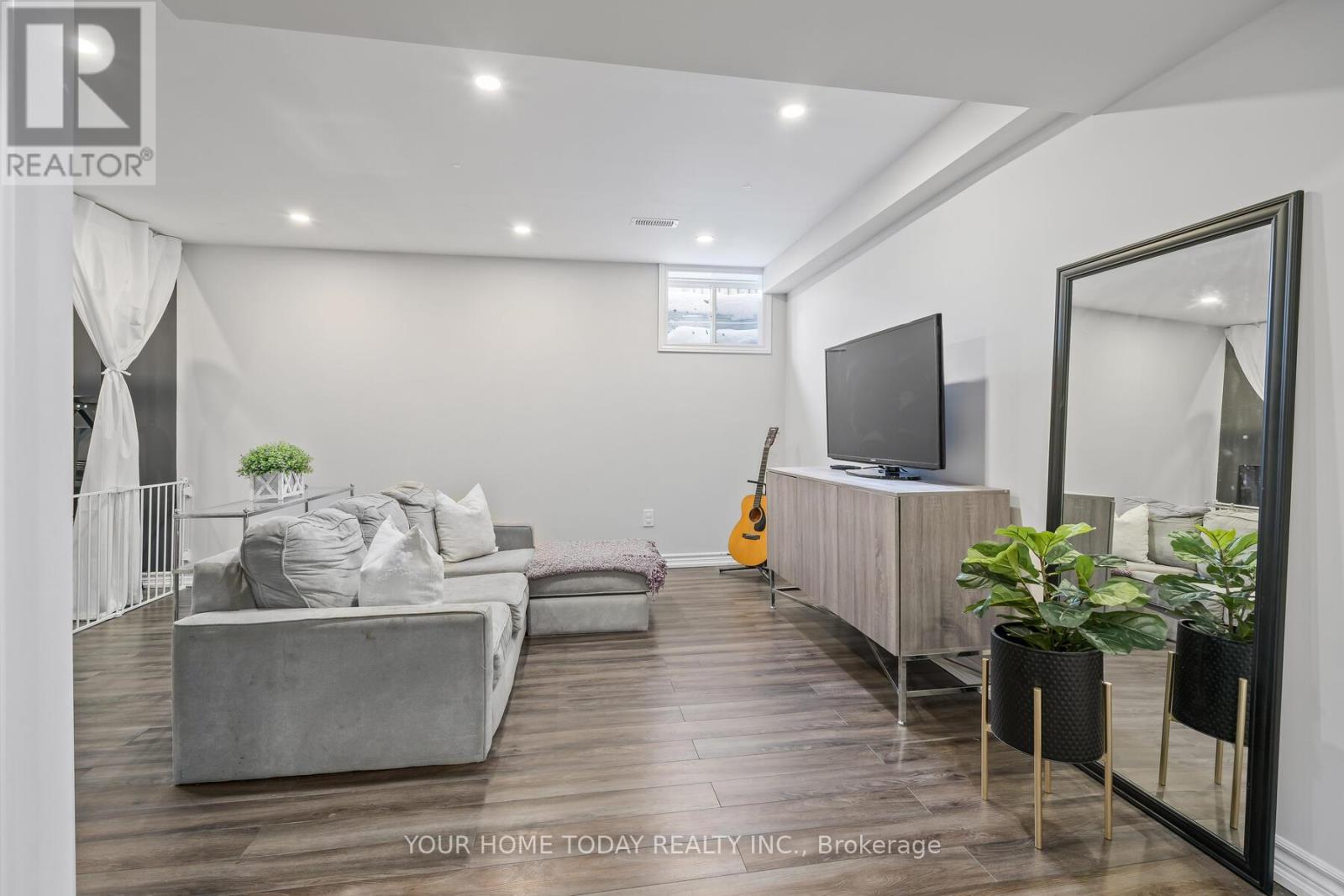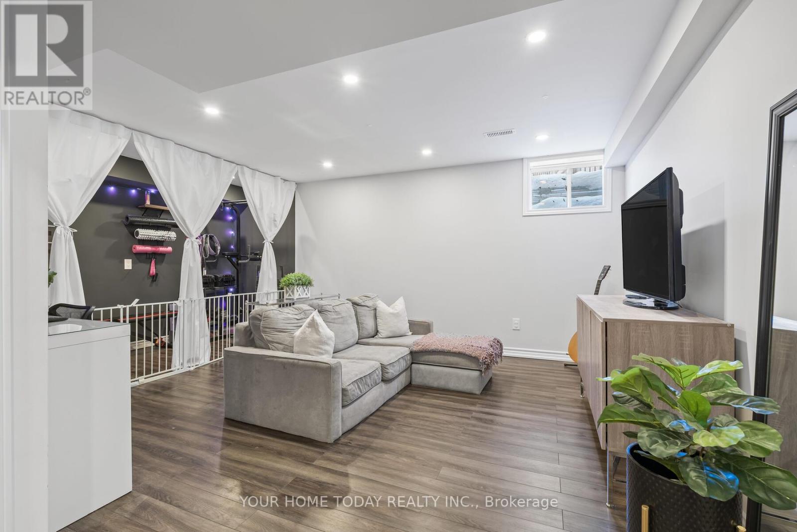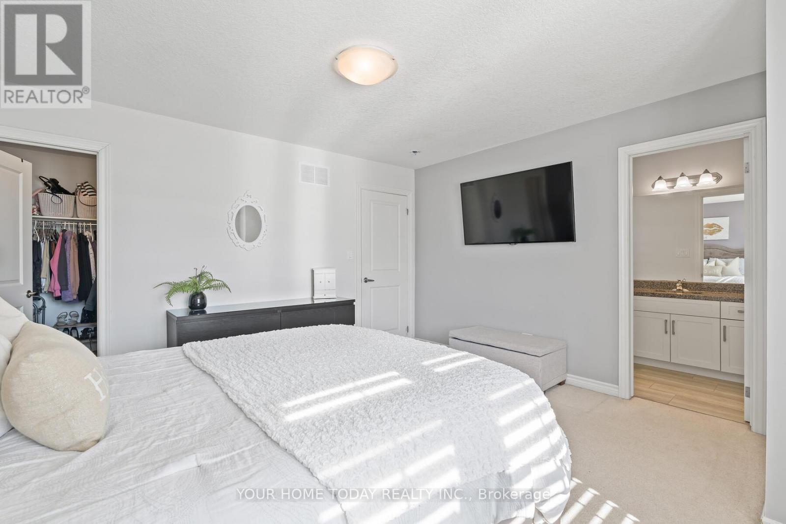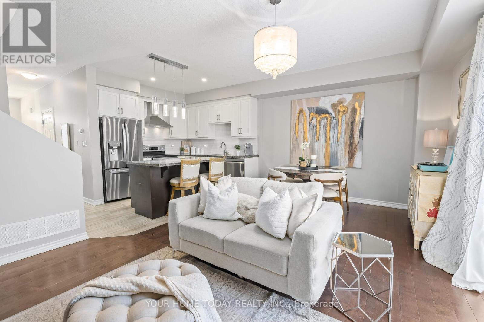 Situated in Guelph's highly desirable east end, this exceptional end unit townhome is set in a quiet family-oriented neighbourhood just minutes from schools, parks, library and picturesque trails. Enjoy the convenience of nearby amenities, the proximity of Guelph University and effortless access to major commuter routes. An inviting covered porch and professionally installed, all season, Gemstone lighting welcome you into the bright, open-concept main level where a thoughtfully designed floor plan makes everyday living and entertaining a delight. The living room showcases an eye-catching built-in wall unit with a toasty electric fireplace, open shelving and practical storage along with a convenient walkout to the yard. The adjoining dining area and kitchen add to the open vibe. The stunning kitchen serves as the heart of the home, showcasing beautiful two-tone cabinetry, a generous island with seating and sleek granite countertops - a perfect blend of style and functionality. A chic powder room completes this level. A lovely wood staircase leads to the upper level where the primary suite offers a walk-in closet and a beautifully finished 3-piece ensuite bath. Two additional bedrooms share a stylish 4-piece bathroom. The convenience of second-floor laundry with built-in cabinetry is a bonus. The finished lower level extends the living space with a cozy rec room featuring pot lights and laminate flooring while still providing ample storage and utility space. Rough-ins for a 3-piece bathroom and wet bar are a bonus! The fenced yard is almost maintenance free with large patio area (almost 90% of yard) providing the perfect outdoor entertaining space. Parking for three vehicles (one in garage, two in driveway) completes this impressive offering. (id:64974)