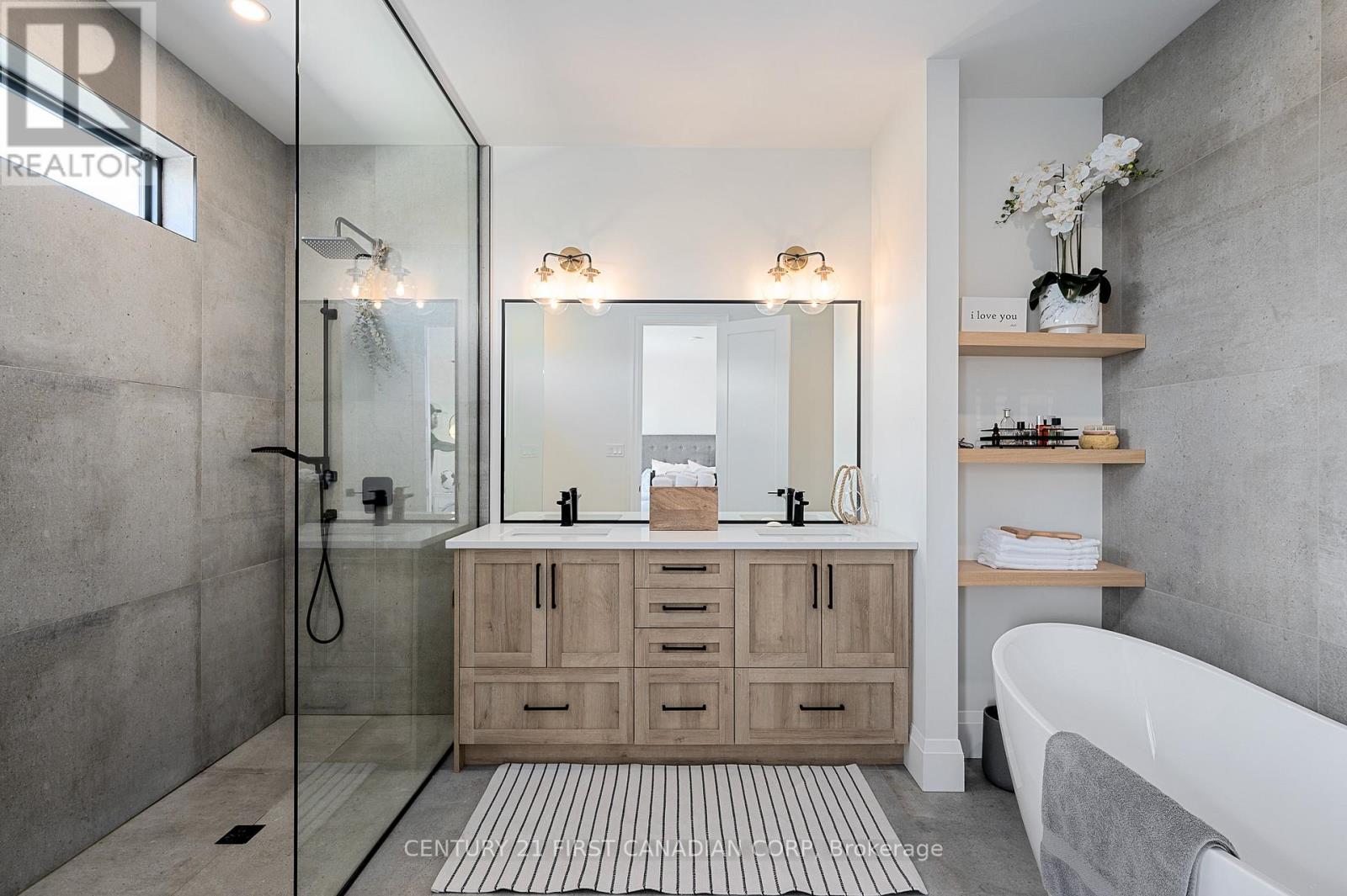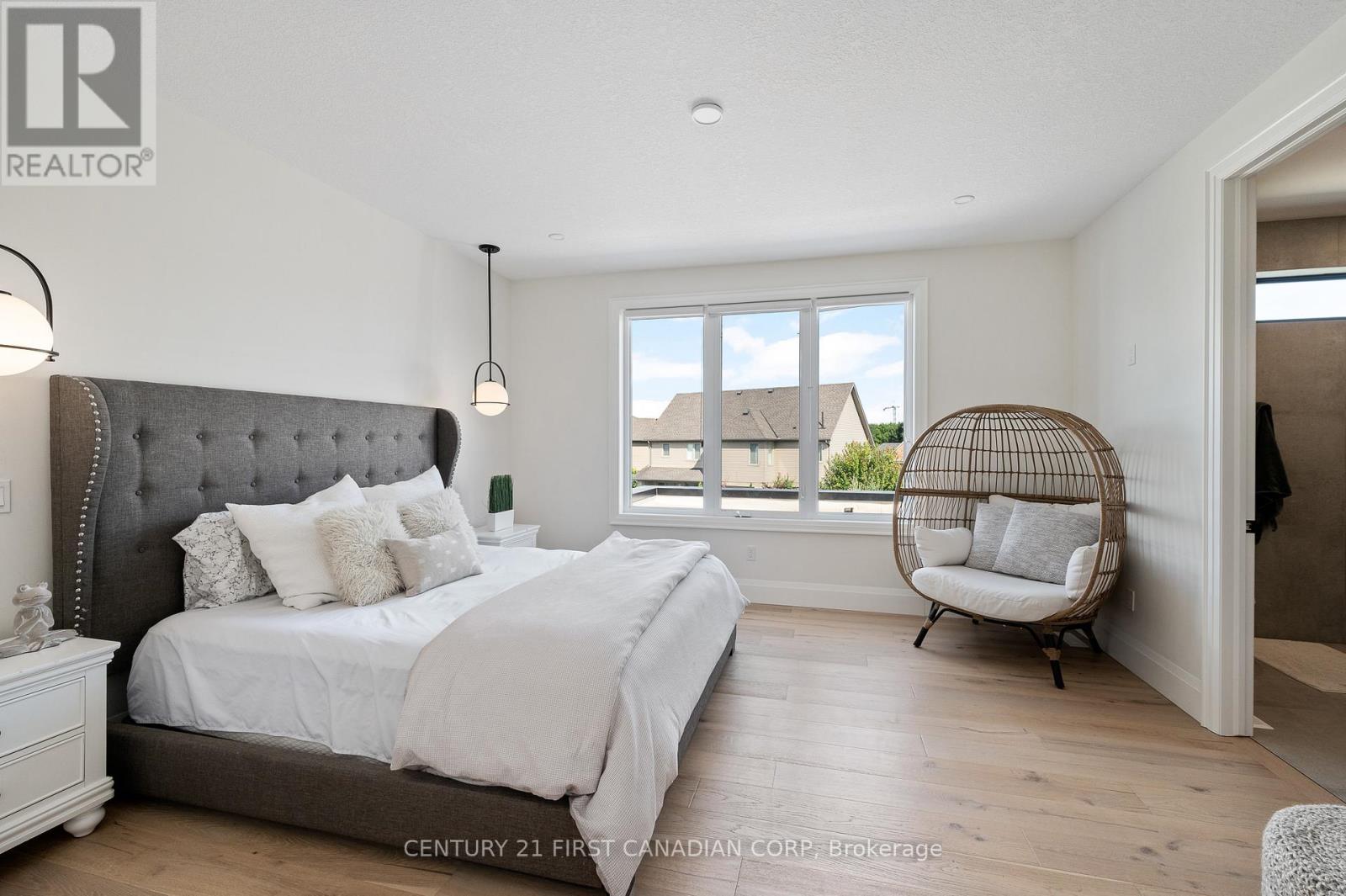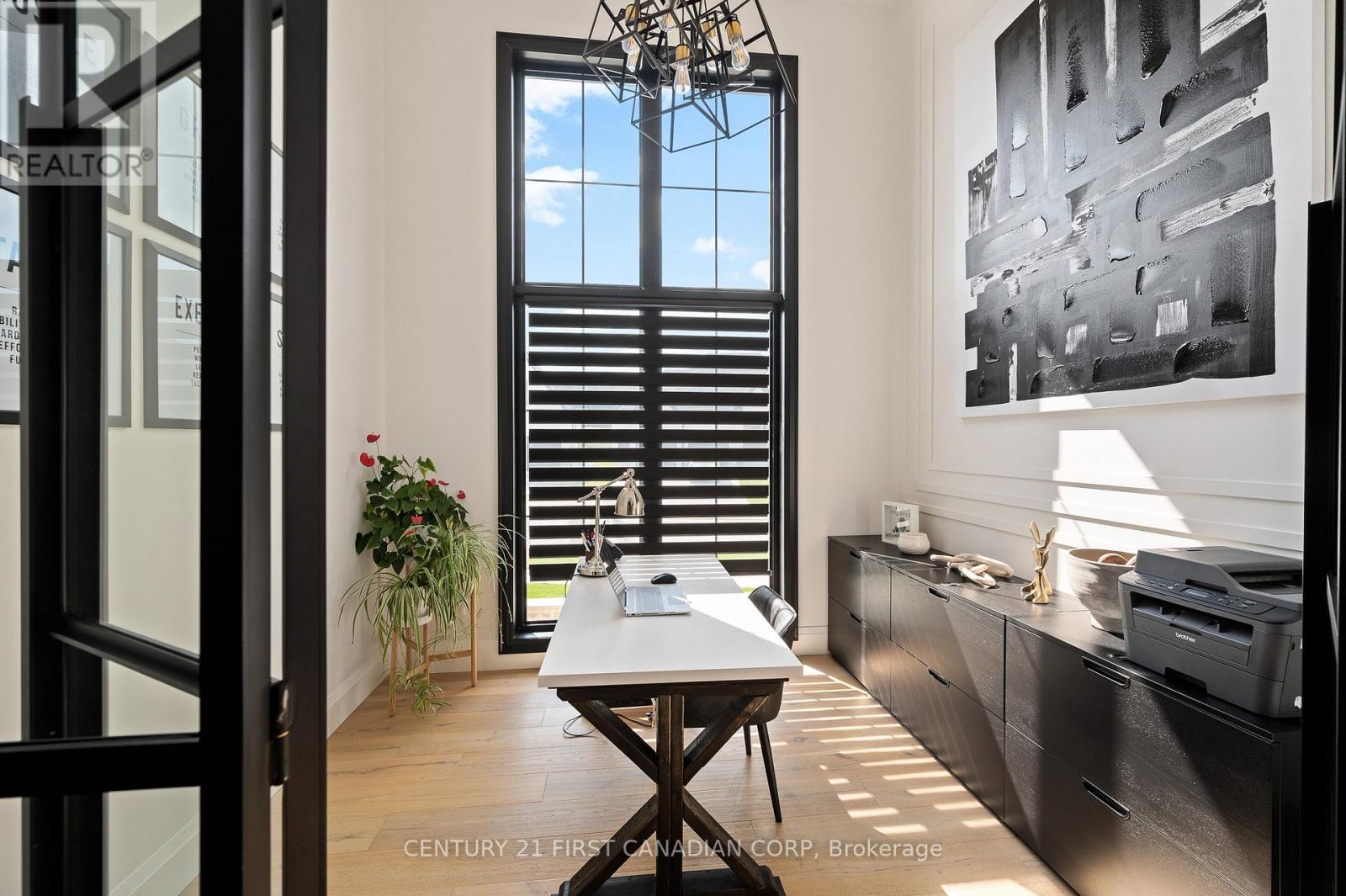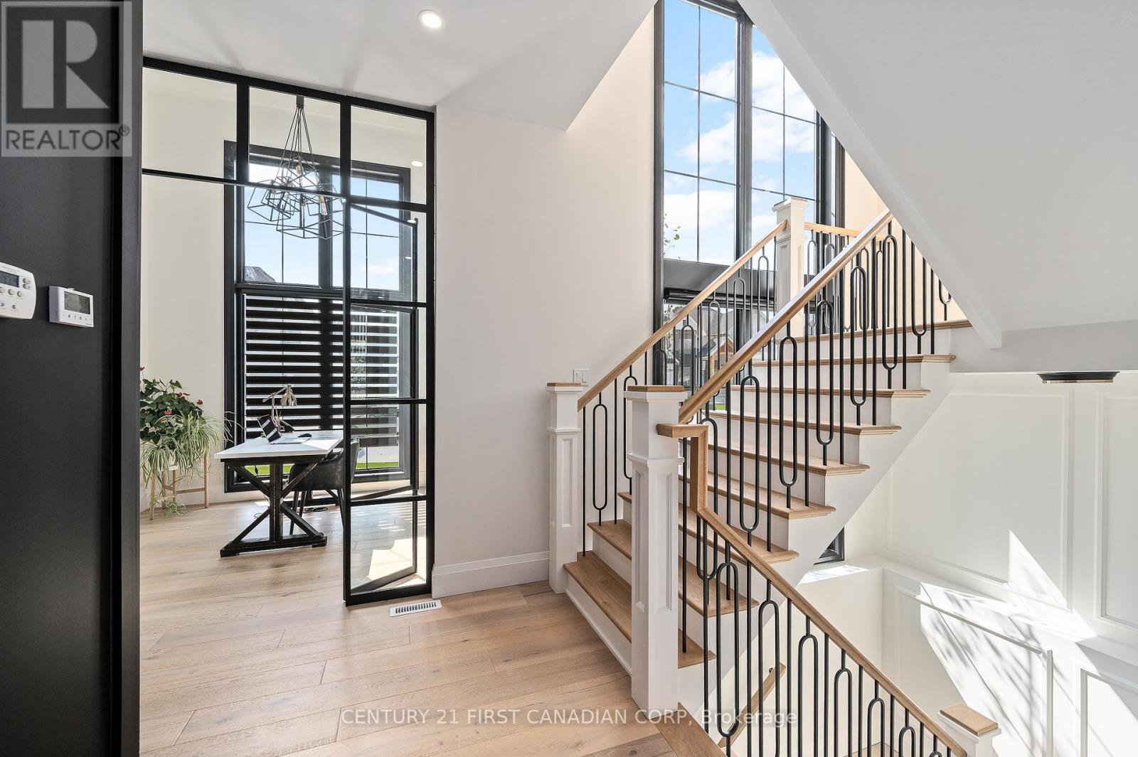Royal Oak Homes proudly presents The Hinsdale II, a striking TO BE BUILT two-storey home in the prestigious Sunningdale Crossings community in North London showcases timeless curb appeal with a blend of stone and modern accents, highlighted by soaring rooflines and sleek architectural details. A series of perfectly placed windows flood the interior with natural light while creating a bold exterior statement. The inviting front entry is framed by warm lighting and elegant fixtures, leading into a thoughtfully designed layout inside. Dual garage doors with matching transom windows enhance both functionality and style, while the stone façade paired with dark trim gives this home an upscale, contemporary European-inspired feel. The main floor offers a huge living area, dining room, and kitchen, highlighted with arched walkways to a pantry and mudroom. A private office on the main floor provides the perfect space for working from home or managing household tasks. The upper level is home to all four bedrooms, including a generous primary suite with a luxurious 5-piece ensuite. A convenient laundry room completes the upstairs, designed to make daily routines easier. Thoughtfully designed with the perfect placement of windows throughout the home including along the staircase. The Hinsdale II is filled with natural light, creating a warm and inviting atmosphere in every space. Enjoy quick access to parks, scenic trails, top-rated schools, shopping, and major highways. More plans and lots are available. Photos are from previous models for illustrative purposes; each model differs in design and client selections. (id:64974)