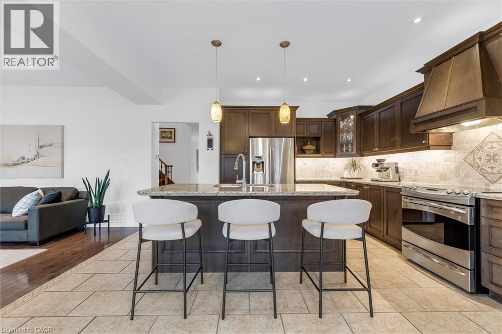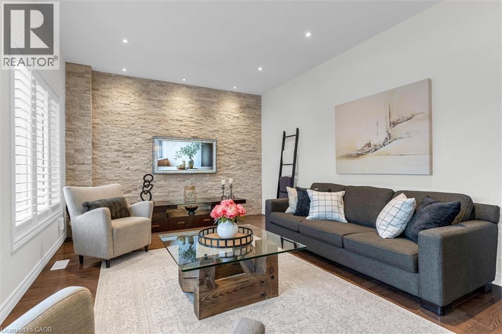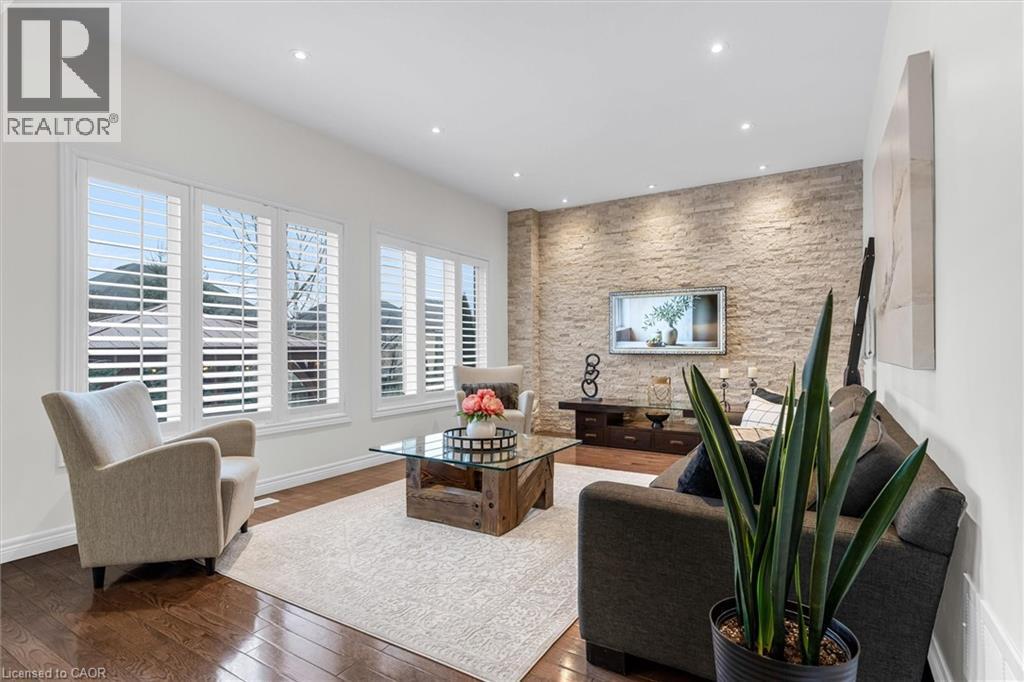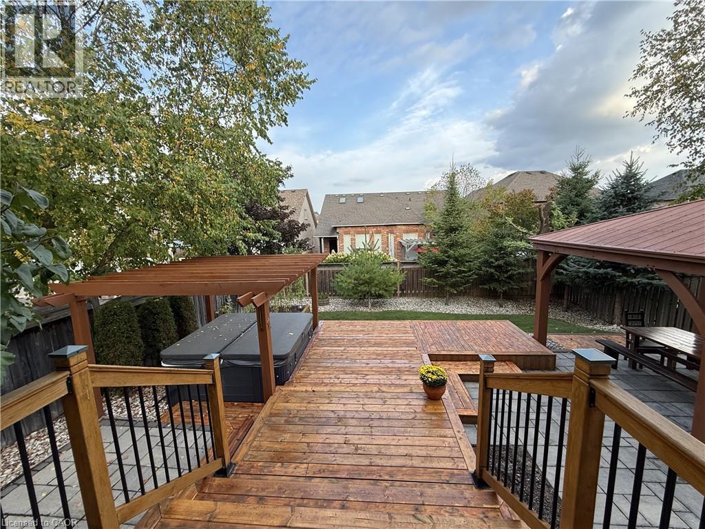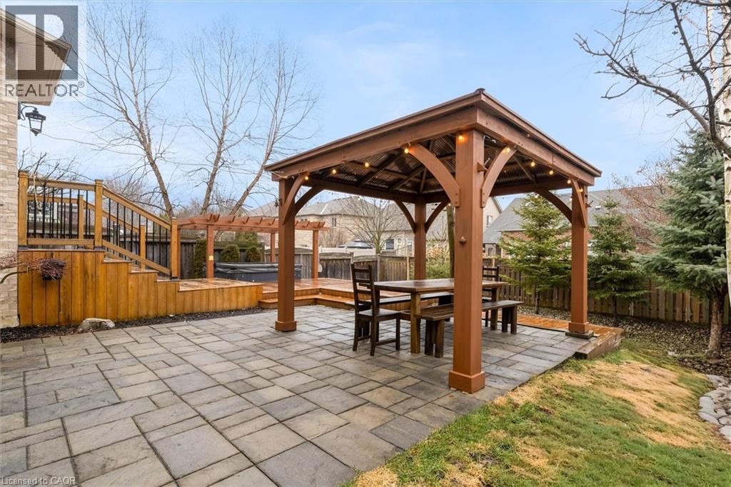 Located on a quiet street in a desirable Dundas neighbourhood, this remarkably maintained home is just steps from conservation trails and close to Dundas Valley Golf & Curling Club. The main floor features 9 ft ceilings, a spacious living room with a striking real stone feature wall, and large windows that fill the space with natural light. The bright and spacious dining area can comfortably host both small and large gatherings. The gourmet kitchen offers maple cabinetry, granite countertops, stainless steel appliances, and a large island with sink and seating - perfect for everyday living and entertaining. The main level also includes a powder room with a real stone feature wall, a laundry room, and inside entry to the double car garage. French doors lead to a generous deck featuring a hot tub covered by a pergola, along with a separate large stone patio with a gazebo - ideal for outdoor entertaining. The professionally landscaped front yard and pool-sized backyard include mature trees, a vegetable garden, and multiple seating areas. An enclosed side yard provides space for a future shed or additional equipment storage. The upper level offers four bedrooms and two full bathrooms, including a spacious primary bedroom with a 4-piece ensuite, soaker tub, and large glass shower. Enjoy being just steps from Dundas Valley Conservation Area and the Bruce Trail. Updates include: Roof (2025), Furnace (2026), Washer & Dryer (2025), Garage Door Opener (2025), Hot Tub Heater (2025). Nothing to do - Just Move In. (id:64974)