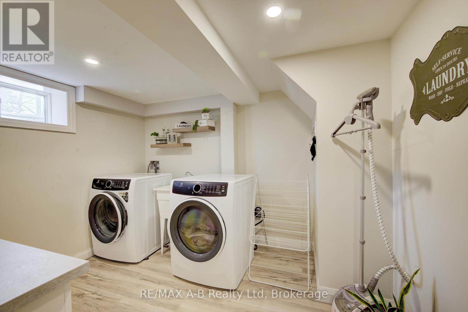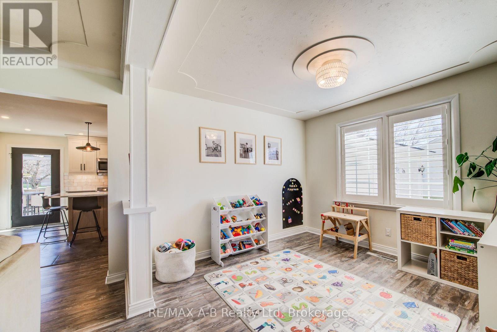 From the moment you walk into this completely renovated home you will fall in love with this bright and airy home. The kitchen is the centre of the home and offers an 8 ft island, upgraded cabinetry, 3 ft pantry, stunning bar area with floating shelves and farmhouse lighting. Lots of pull-out drawers, pull out garbage/recycling caddy. The living room offers a large window, built in electric fireplace, built in cabinets and bench seating. The dining area is currently used as a playroom and offers many different options such as home office, dining room, toy room, etc. California shutters on living and dining room windows complete the look. Two large bedrooms offer lots of space, both have 2 windows and the second bedroom has built in closet system with pull out drawers. The basement is finished to include a family room, bedroom, bath and wet bar area ~ perfect for an in-law suite/teenager/etc. There is a large laundry room with built in cabinets and countertop. This home sits on a large park like lot and offers a gazebo, a shed and an oversized one car garage. There is a deck off of the kitchen, patio stones to the lovely flowerbeds, fire pit ~ perfect for outdoor gatherings! Call today to view this lovingly renovated home. (id:64974)