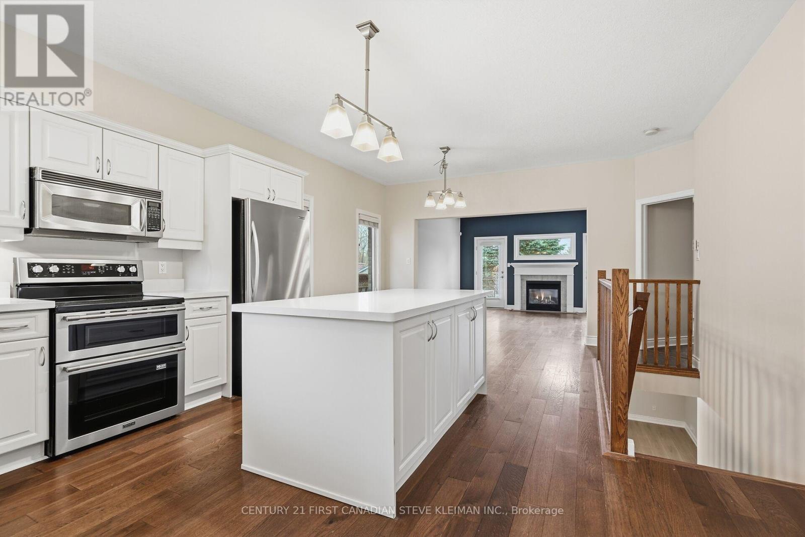 North London solid brick bungalow with double garage under $800K - a rare find. This impressive home stands out from the moment you arrive, featuring a large covered wrap-around front porch and excellent curb appeal. The fully fenced backyard is a private retreat with multi-tiered decks overlooking lush gardens & three mature trees. With no rear neighbours, the yard offers exceptional privacy. The welcoming front entrance features a stylish door assembly with sidelights & a transom window, leading into a spacious, bright foyer with ceramic flooring. Inside, you'll appreciate the soaring 9' ceilings & the impressive oversized quartz kitchen island with storage on two sides & seating overhang. Quartz continues through the kitchen with a matching quartz backsplash. The kitchen features quality appliances including Maytag double oven, stainless steel dishwasher & KitchenAid fridge. The dining area easily accommodates a large family-sized table. Hardwood floors carry into the great room where a gas fireplace & transom window create a bright and inviting space. The oversized primary suite features a large bedroom, jetted tub ensuite & walk-in closet with organizer. Hardwood flooring continues into the second bedroom. A big bonus is the separate main floor laundry room complete with Maytag front-load washer & dryer, countertop workspace & built-in storage. A solid oak railing leads to the finished lower level where you will find hard surface flooring, a spacious family room & a bedroom with cheater ensuite. The bathroom features a large tiled walk-in shower & stylish vanity. Even with the finished space there is still plenty of unfinished storage. . Freshly painted & move-in ready, this quiet street location is within walking distance to Sunripe Market. You will be impressed! (id:64974)