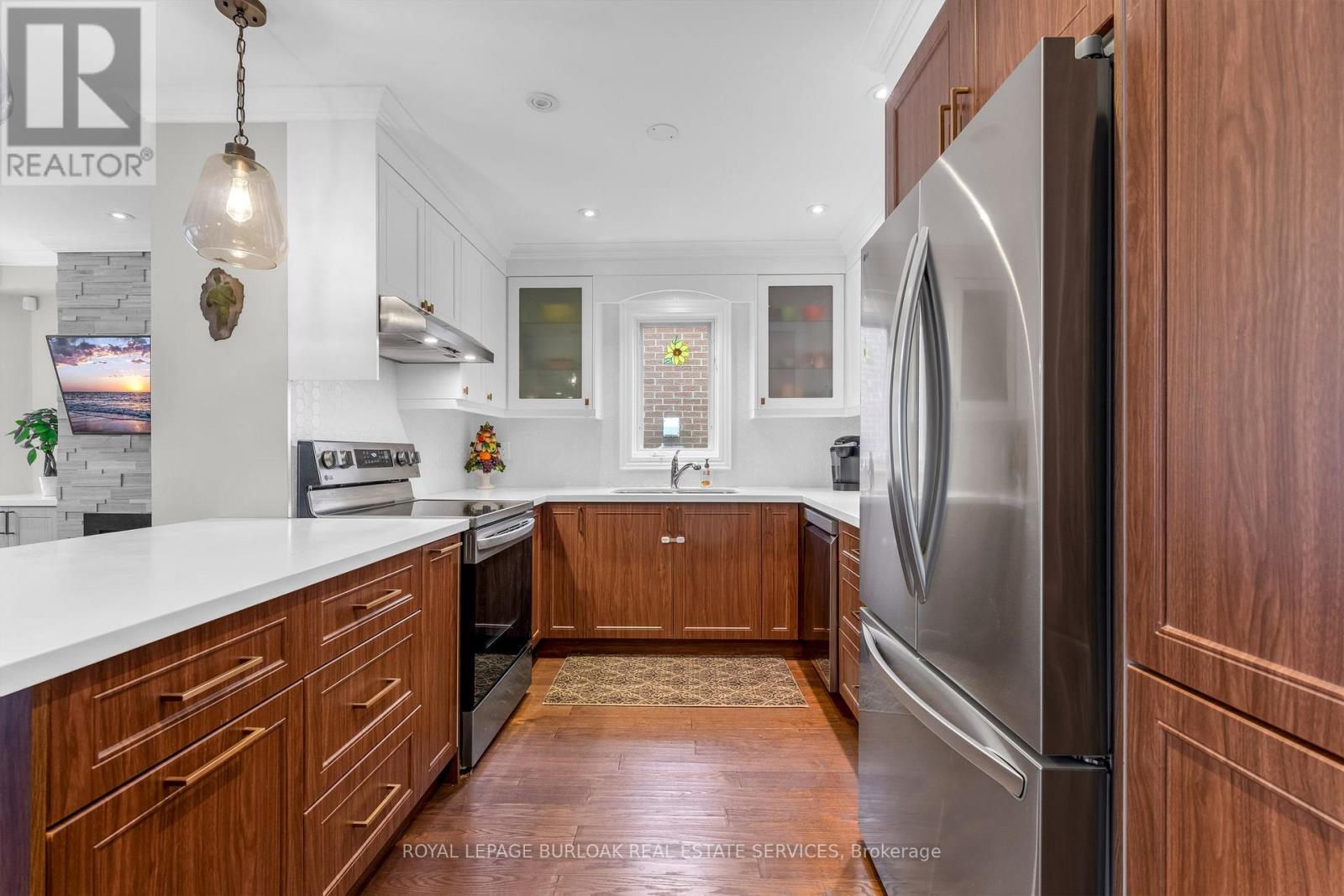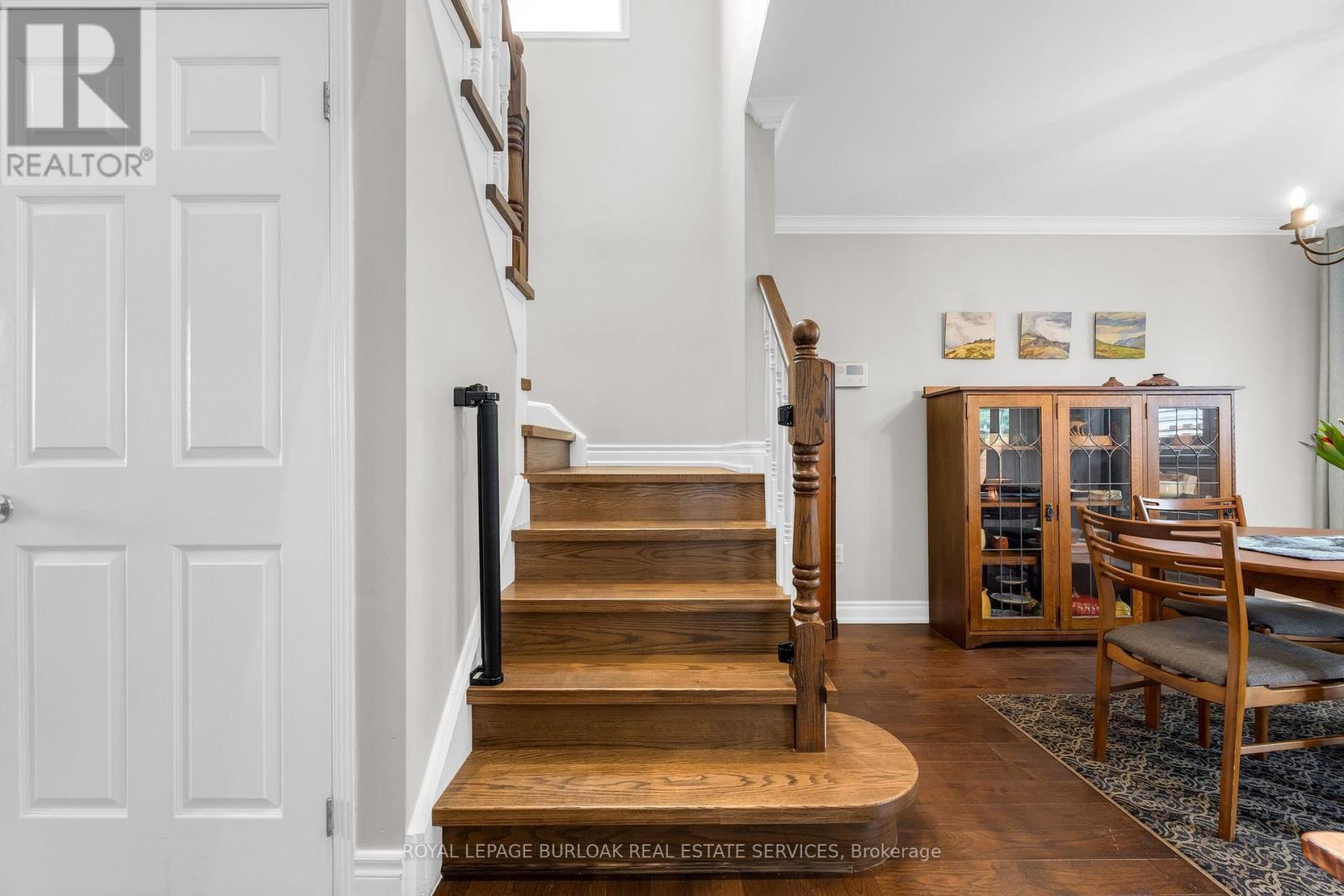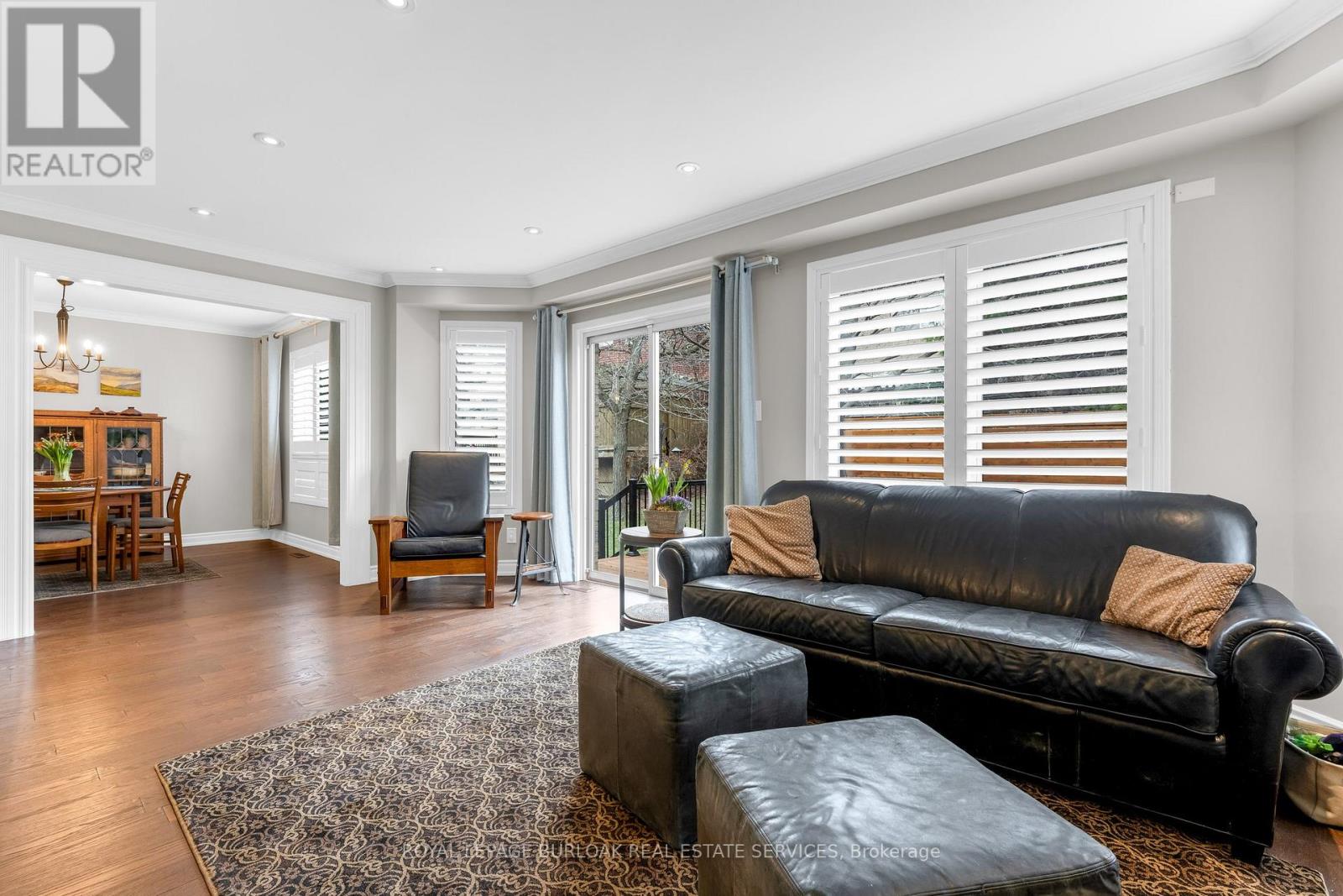 Prepare to fall in love with this beautifully updated 3+1-bedroom 2.5 bathroom detached home, complete with a double car attached garage & inside entry in the highly desirable Tyandaga Oaks community! From the moment you arrive, the charming stone steps & inviting curb appeal sets the tone! Step inside to an impeccably maintained home exquisitely appointed with tasteful décor & California shutters throughout offering a light-filled, cohesive ambiance that radiates timeless elegance & refined sophistication! This home truly offers open concept living at its finest! The stunning kitchen flows seamlessly into the family room creating the perfect space for everyday living & effortless entertaining! At the same time, the partially separated dining room offers just the right balance for hosting more intimate dinners or special occasions! The heart of the home features hickory hardwood floors, pot lights with dimmers & a cozy gas fireplace with stone feature wall creating a warm & inviting atmosphere! The bright living space with custom built-ins & large windows is filled with natural light & designed for comfort. The chef-inspired kitchen boasts quartz countertops, stainless appliances & custom cabinetry with soft-close drawers that are both beautiful & functional. Upstairs, retreat to your spacious primary suite with walk-in closet & ensuite complemented by two additional bedrooms & updated main bath. The fully finished lower level adds incredible flexibility with a large family room, 4th bedroom & separate laundry room! Perfect for guests, a growing family, or a home office setup. Listen to the birds, watch deer pass by, enjoy the sunsets & unwind in a truly peaceful, nature-filled environment, right at your front doorstep overlooking green space!The private backyard deck is ideal for summer entertaining and relaxing evenings! Located just minutes to parks, the Bruce Trail, Golf Course, shopping & QEW this home offers the perfect blend of tranquility & convenience! (id:64974)