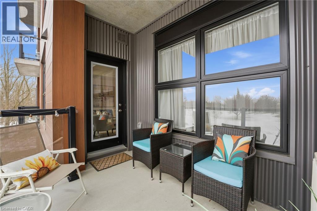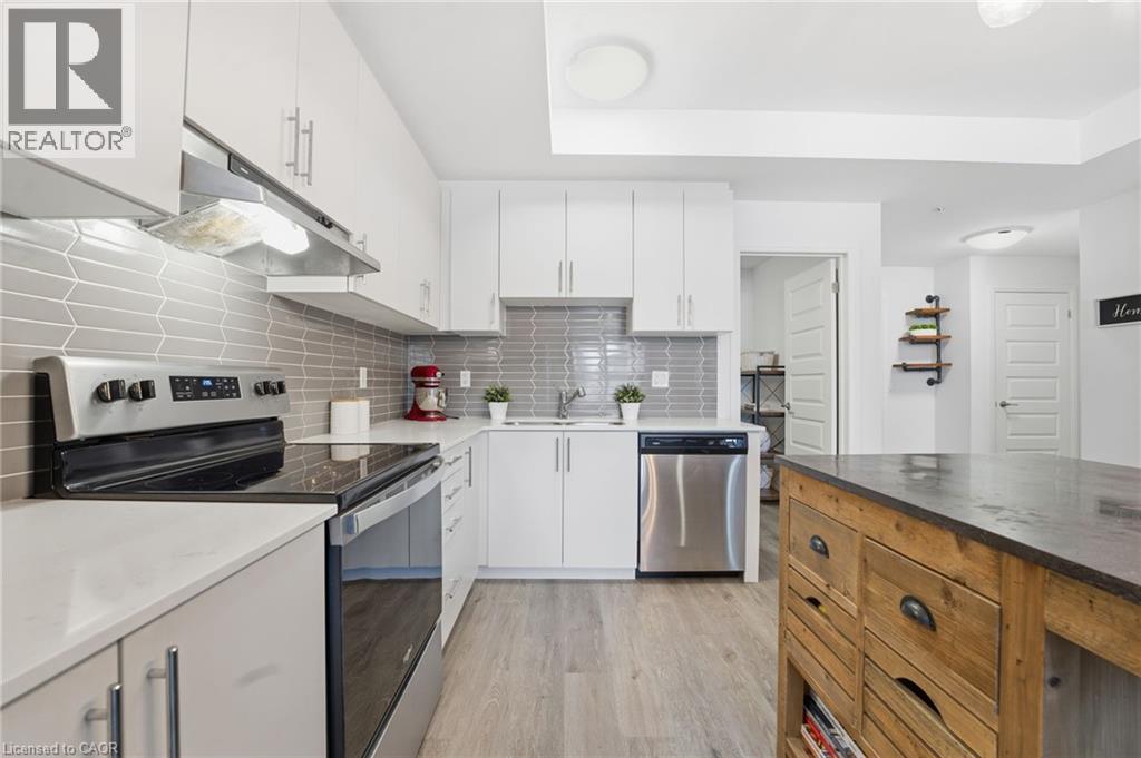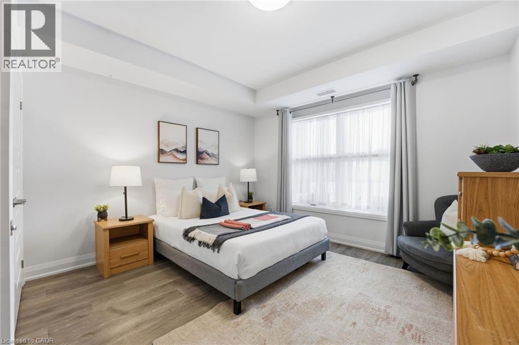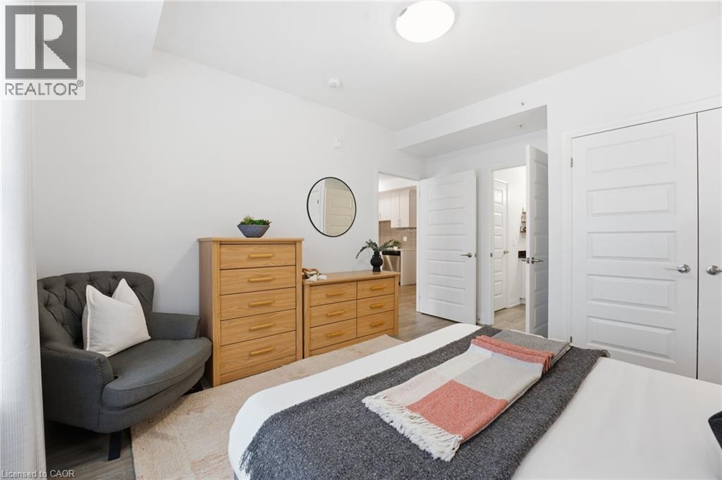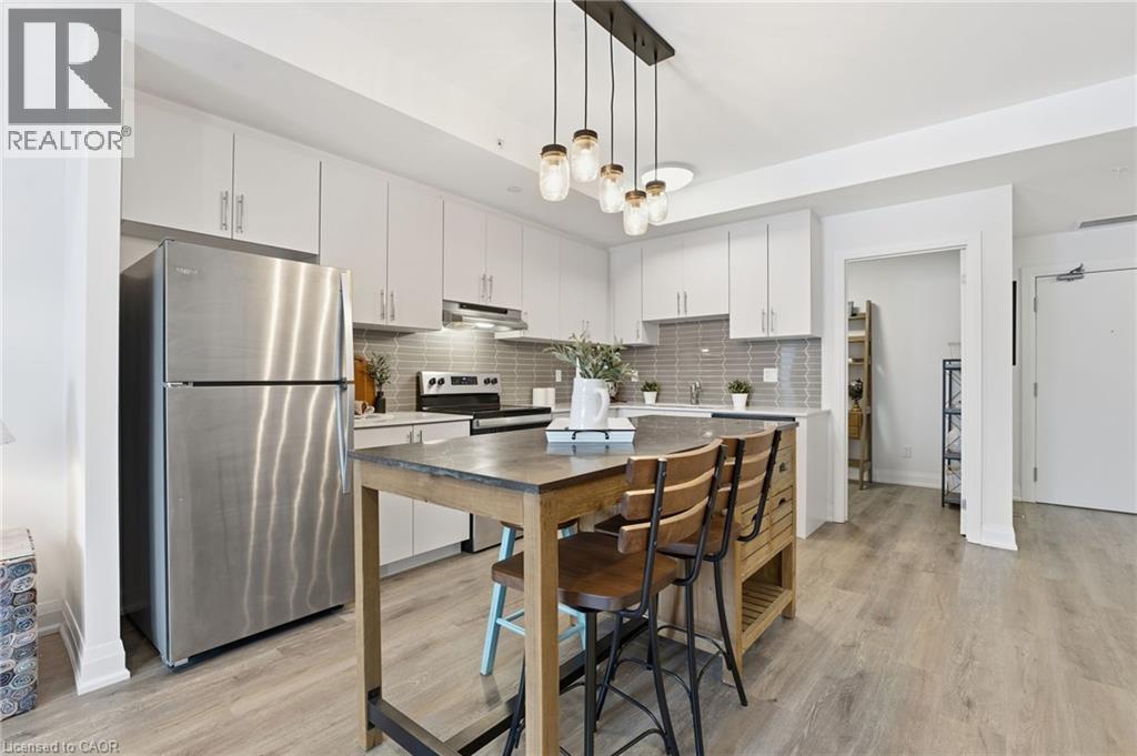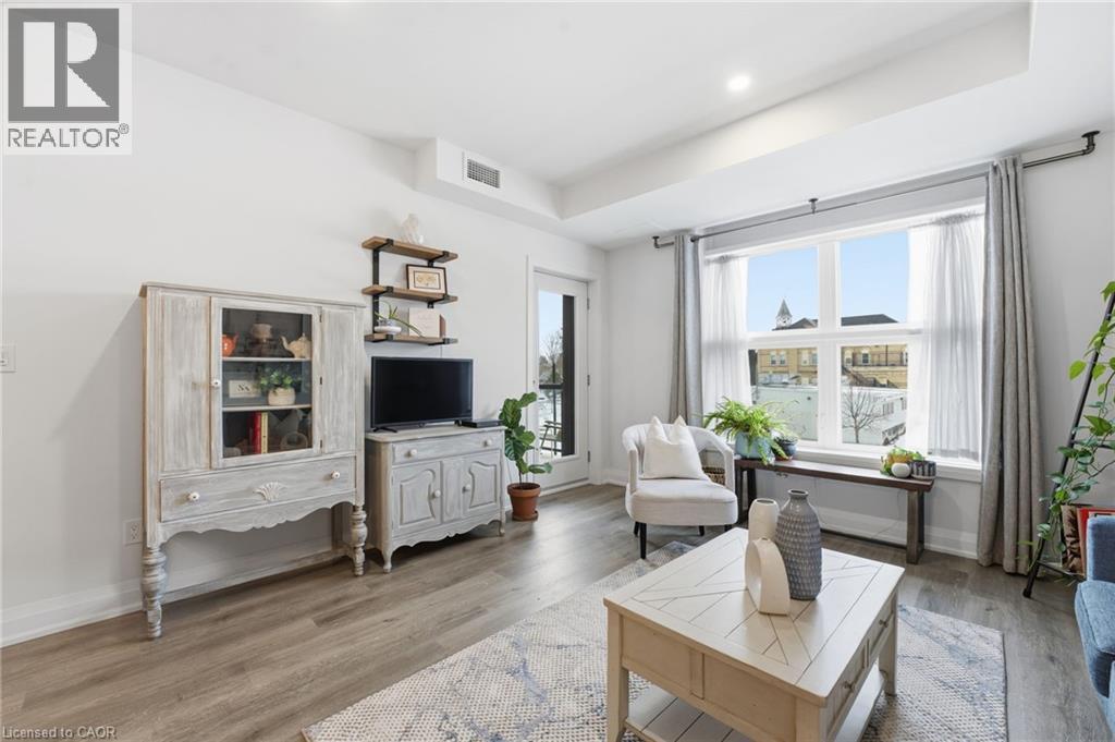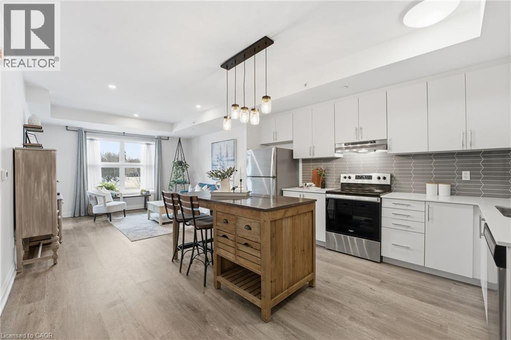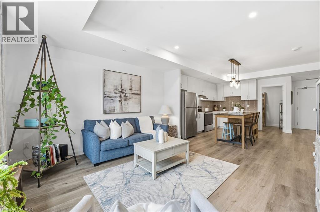 Welcome to condo living in Ayr at Piper’s Grove! This modern mid-rise community offers an ideal opportunity for first-time buyers, downsizers, or savvy investors looking for a low-maintenance lifestyle in a growing, well-connected town. This bright and spacious suite features 1 bedroom plus a versatile den, 1 bathroom, and 885 sq ft of thoughtfully designed living space, along with a private 84 sq ft balcony - perfect for enjoying your morning coffee or unwinding at the end of the day. The open-concept kitchen, dining, and living area is flooded with natural light and showcases contemporary finishes throughout. The kitchen is both stylish and functional, featuring sleek white cabinetry extending to the ceiling, a neutral backsplash, quartz countertops and a striking designer lighting over the dining area. The primary bedroom offers convenient access to the 4-piece bathroom, creating a comfortable and efficient layout. Additional highlights include luxury vinyl plank flooring throughout and in-suite laundry for everyday convenience. Residents enjoy a secure building entrance with intercom system, as well as a welcoming main-level amenity room complete with a kitchenette and washroom - ideal for gatherings or entertaining. One parking space is included. Located at the end of Gibson Street in downtown Ayr, Piper’s Grove is just steps from parks and walking trails and offers easy access to Cambridge, Kitchener, Paris, Brantford, and Woodstock. Combining modern finishes, smart design, and a friendly community atmosphere, this is condo living at its best. (id:64974)
