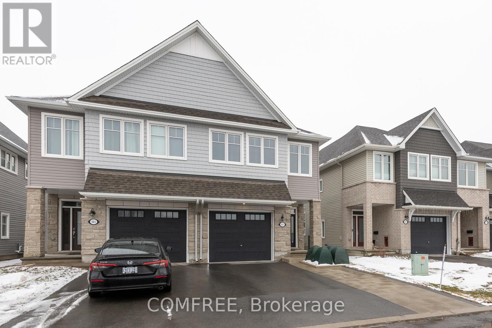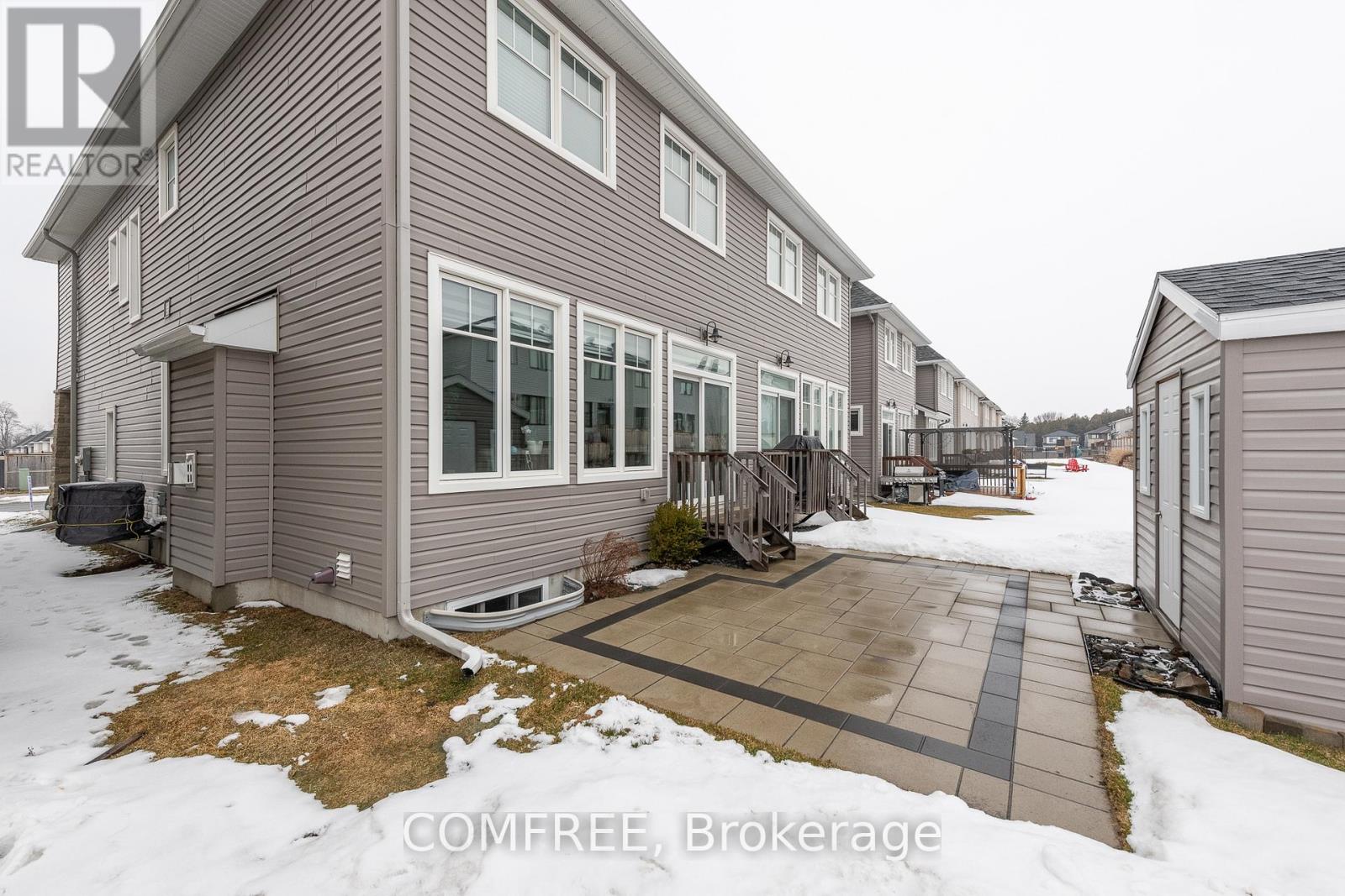 This sought after community of cardinal creek Orleans home is a semi-detached Folkstone model at 2,155 Sq Ft with stone frontage offering bright open layout with modern hardwood flooring throughout the main level with 9 foot ceiling. Large windows with zebra blinds fill the home with natural light. The open-concept main floor is anchored by a modern kitchen featuring quartz countertops throughout with a large centre island seating, includes stainless steel appliances, ample cabinetry, and a large pantry flowing seamlessly into the living room and dining area. A cozy gas fireplace adds warmth and definition to the space. For added comfort also equipped with central A/C. The upper level includes 3 spacious bedrooms, with a well appointed primary suite with huge walk-in closet, a sitting area and a large luxurious ensuite complete with a large soaker tub and separate shower and 2 sinks. Convenient second floor laundry with tub and cabinetry which includes washer and dryer and a main bathroom complete the upper level. The professionally finished basement provides additional living space ideal for family room, home theatre, home office or gym, along with a large storage room. The backyard offers a 10x10 custom built shed with a no maintenance interlock patio. The driveway is widened by interlock which is wide enough for 4 vehicles including garage. Landscaping in the front and backyard. The oversize garage with 10 ft wide garage door offers easy entry with garage door opener and lots of room for storage. A 2 minute walk to a park which includes a splash pad, skating rink and community building. Close to shopping, schools and short commute to LRT. Future school close by. (id:64974)