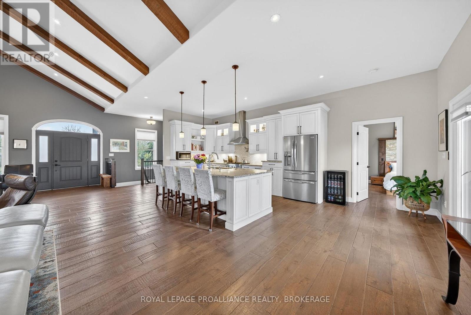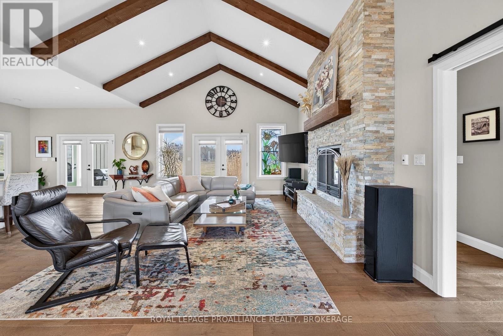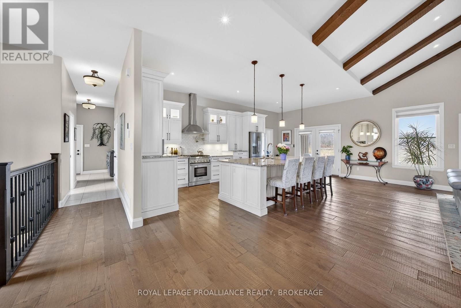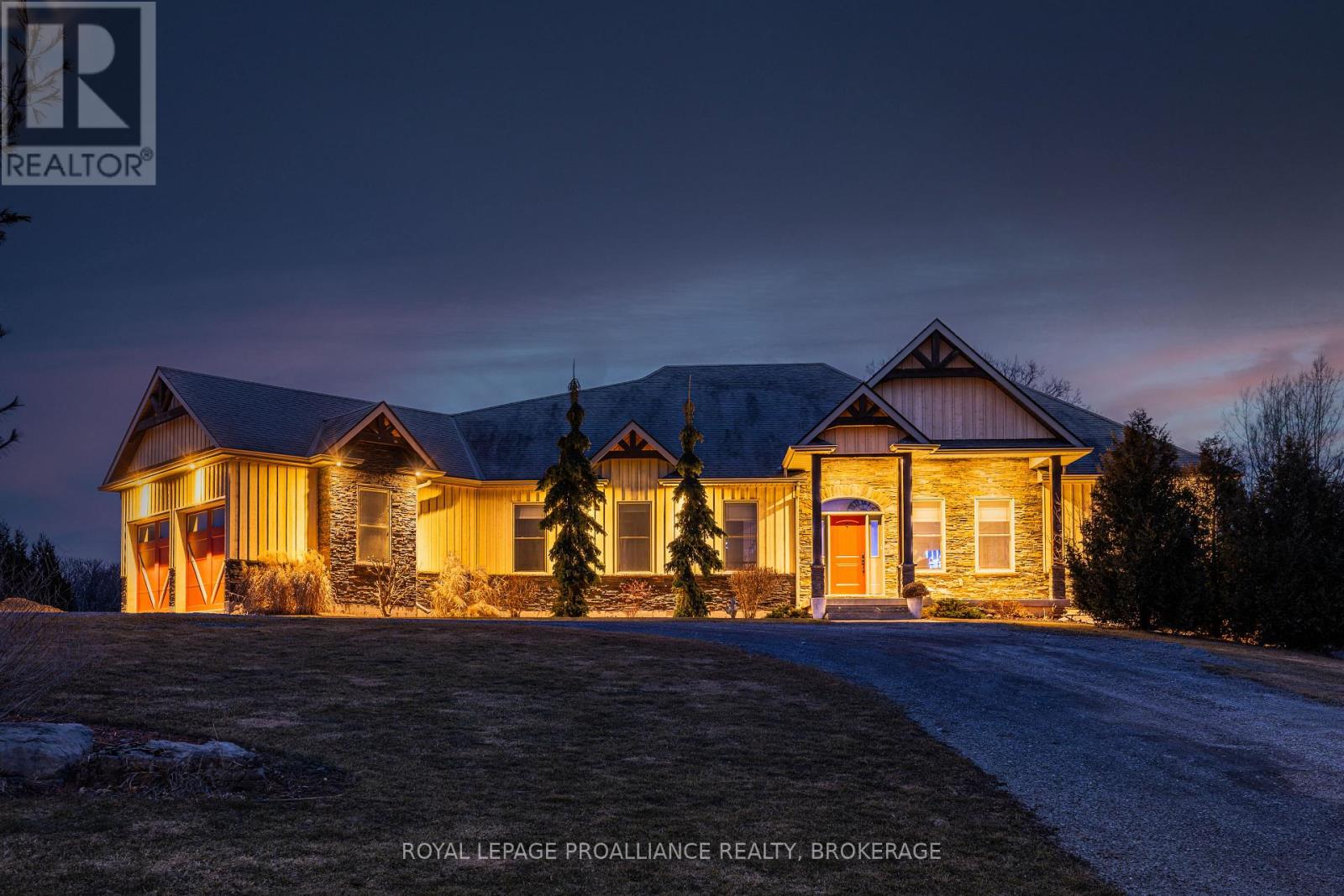 Welcome to this exquisite custom-built board-&-batten & stone bungalow, perfectly perched on a private, elevated lot in the exclusive executive enclave of Hearth Stone Ridge Estates. Exuding luxurious rustic charm, the open-concept main floor boasts soaring vaulted ceilings with exposed wood beams, rich hardwood floors, & a magnificent floor-to-ceiling stone fireplace. The chef's dream kitchen features gleaming granite counters, an oversized breakfast bar island, a pull-out pantry, & a premium gas stove complete with a convenient pot filler. Retreat to the primary suite showcasing a cozy built-in window seat, a custom headboard, a massive walk-in closet with more built-ins, & a gorgeous ensuite bath with his-&-hers sinks. Two additional spacious bedrooms & a 4-piece bath complete the main sleeping quarters, while a stylish mudroom offers laundry, more granite counters, a conveniently located 2-piece powder room, & inside entry to the oversized double-car garage with an excellent storage. The fully finished walk-out basement is an entertainer's paradise, offering an enormous rec room, cold storage, a large bonus bedroom, a beautifully tiled 3-piece bath with a touch-lit mirror, & an acoustically resilient games room complete with an included pool table. Step outside from multiple access points to the private covered interlock stone patio equipped with a virtually new Napoleon BBQ with gas hook up & take the flagstone path to warm up by the firepit. Enjoy the rare financial benefit of natural gas heating combined with rural well & septic, plus the everyday convenience of central vac. Experience the perfect blend of country tranquility & high-end executive living! (id:64974)
