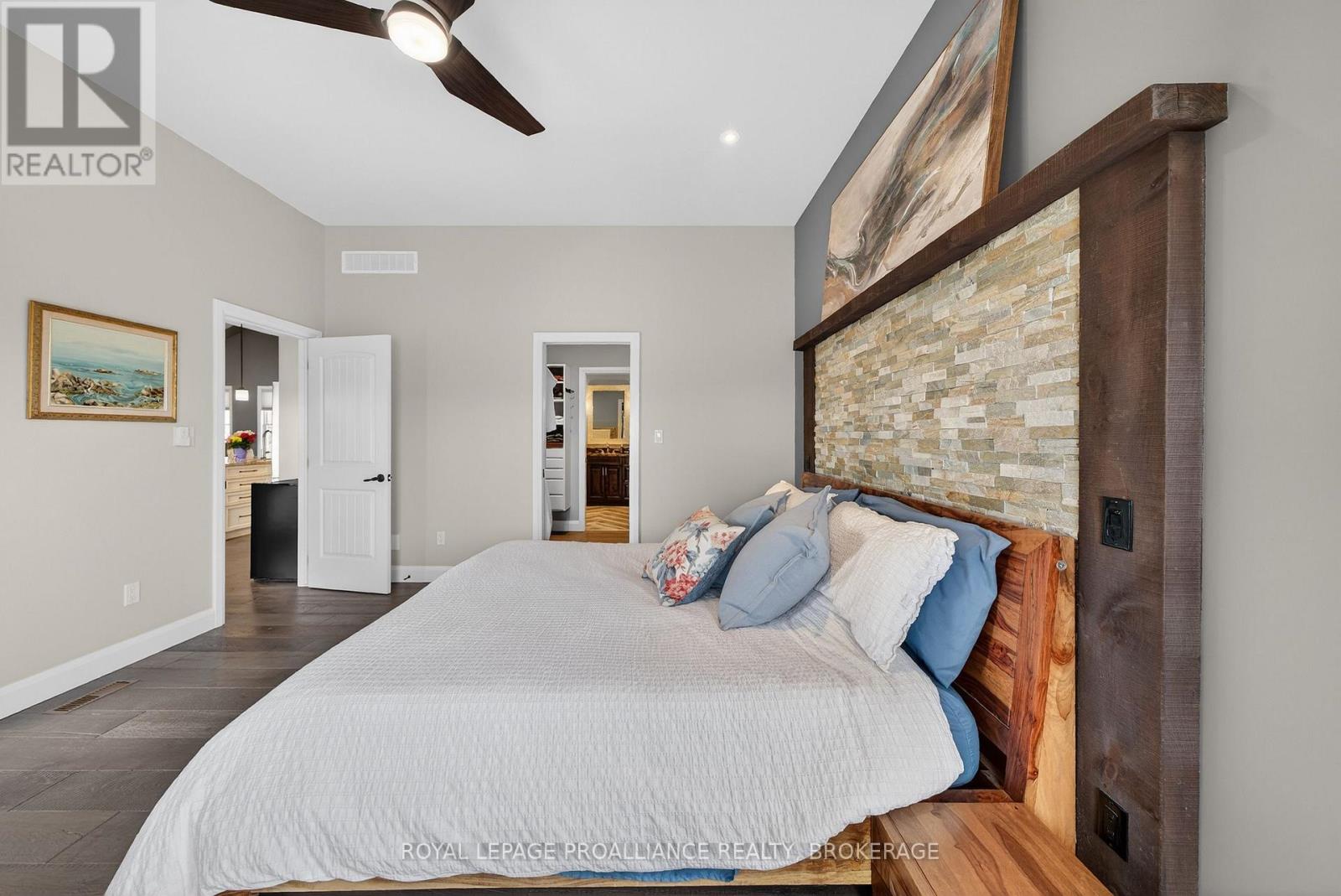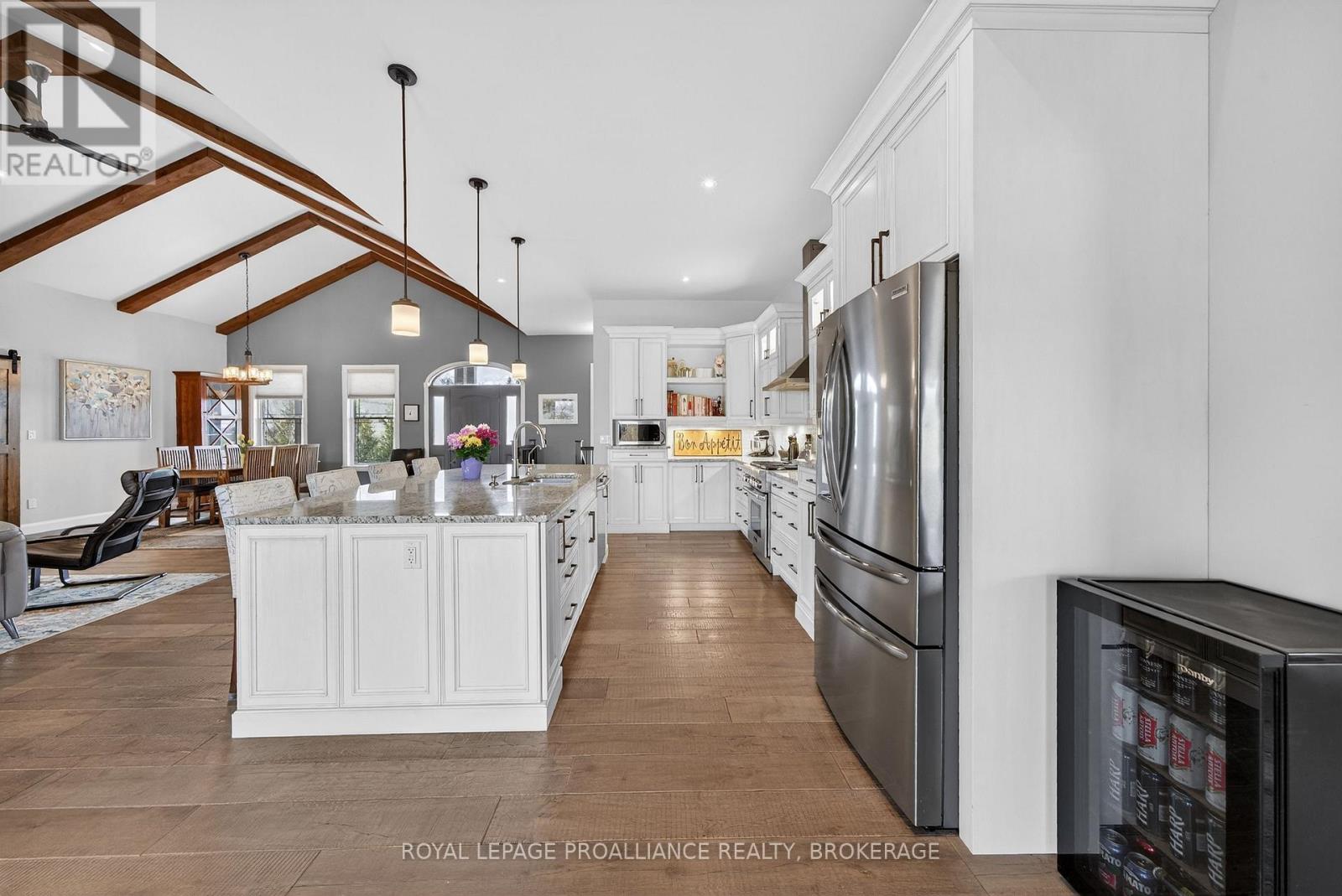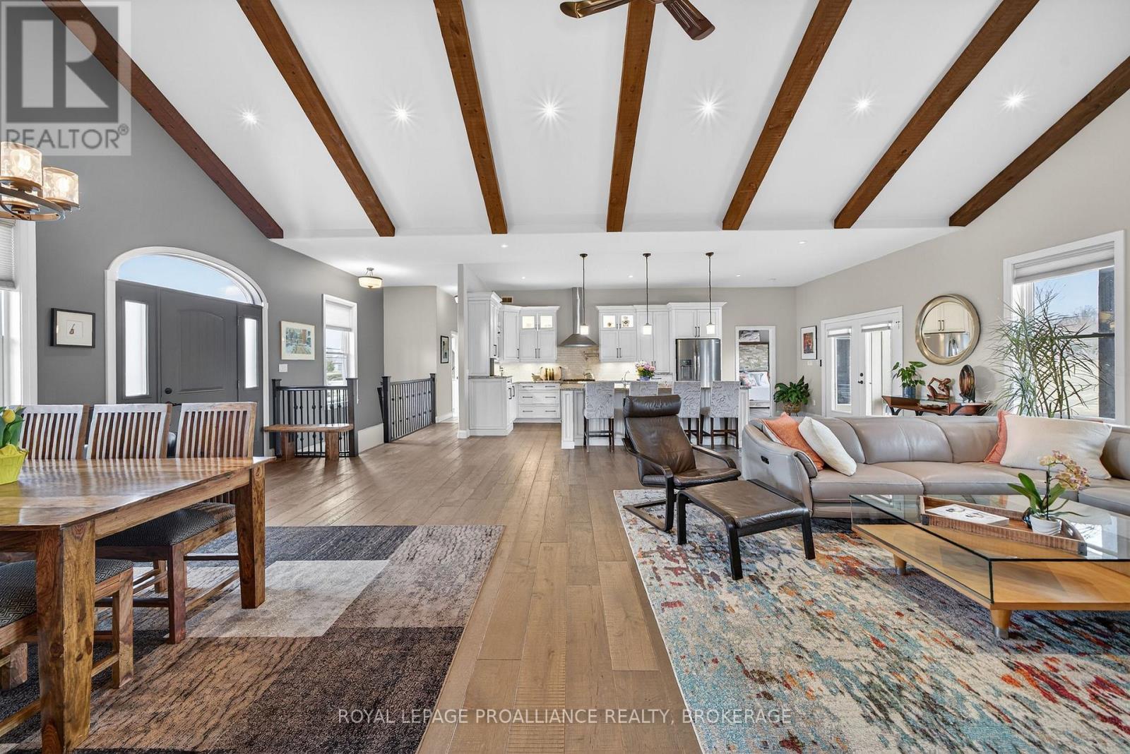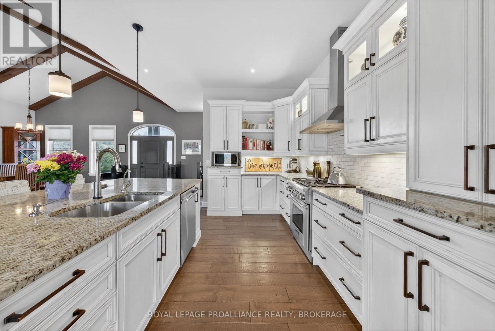 Welcome to this exquisite custom-built board-&-batten & stone bungalow, perfectly perched on a private, elevated lot in the exclusive executive enclave of Hearth Stone Ridge Estates. Exuding luxurious rustic charm, the open-concept main floor boasts soaring vaulted ceilings with exposed wood beams, rich hardwood floors, & a magnificent floor-to-ceiling stone fireplace. The chef's dream kitchen features gleaming granite counters, an oversized breakfast bar island, a pull-out pantry, & a premium gas stove complete with a convenient pot filler. Retreat to the primary suite showcasing a cozy built-in window seat, a custom headboard, a massive walk-in closet with more built-ins, & a gorgeous ensuite bath with his-&-hers sinks. Two additional spacious bedrooms & a 4-piece bath complete the main sleeping quarters, while a stylish mudroom offers laundry, more granite counters, a conveniently located 2-piece powder room, & inside entry to the oversized double-car garage with an excellent storage. The fully finished walk-out basement is an entertainer's paradise, offering an enormous rec room, cold storage, a large bonus bedroom, a beautifully tiled 3-piece bath with a touch-lit mirror, & an acoustically resilient games room complete with an included pool table. Step outside from multiple access points to the private covered interlock stone patio equipped with a virtually new Napoleon BBQ with gas hook up & take the flagstone path to warm up by the firepit. Enjoy the rare financial benefit of natural gas heating combined with rural well & septic, plus the everyday convenience of central vac. Experience the perfect blend of country tranquility & high-end executive living! (id:64974)