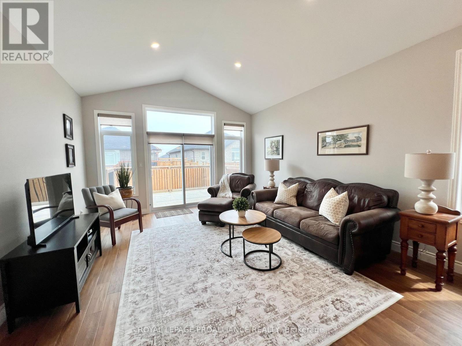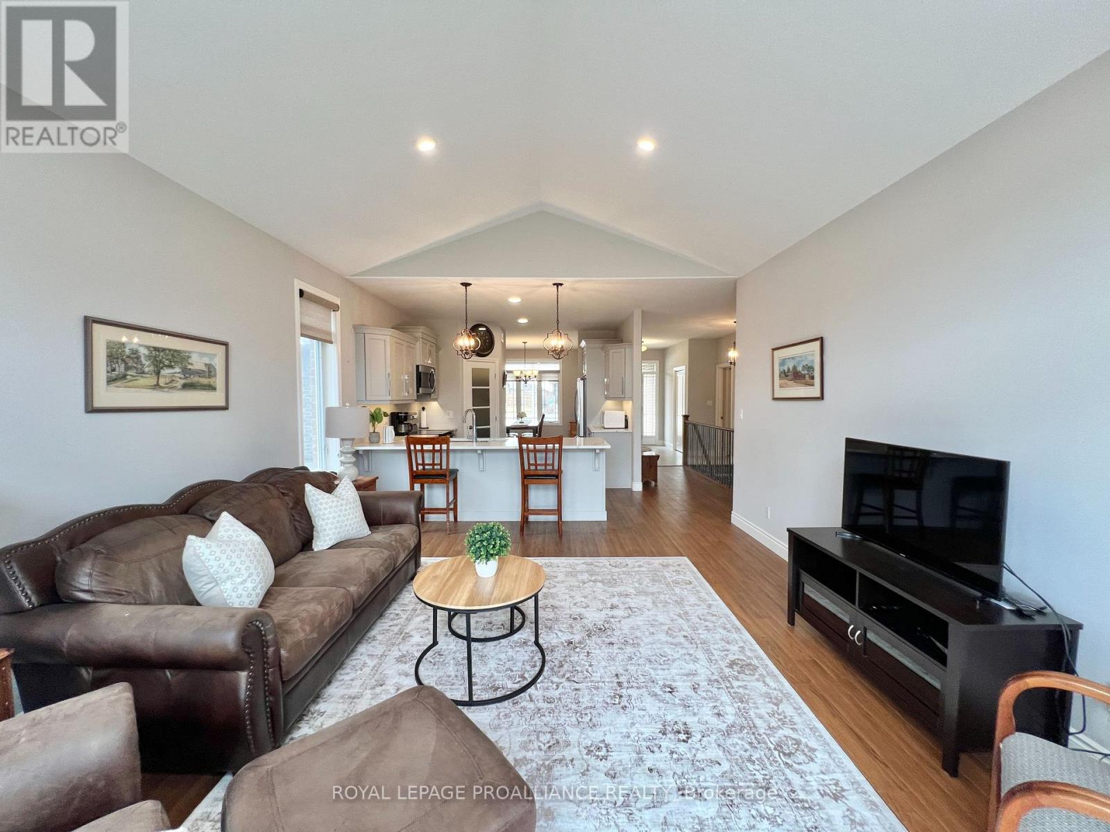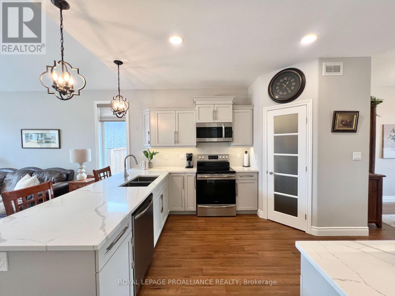 This immaculate all-brick bungalow, built in 2019 by Devanco Homes, is located in one of Belleville's most sought-after family neighbourhoods and shows like new from top to bottom. Step inside to a bright and welcoming foyer, with a front dining room framed by a large window that fills the space with natural light. The open-concept main living area is perfect for both everyday life and entertaining, featuring a vaulted ceiling in the living room and seamless flow into the kitchen. The kitchen features neutral cabinetry, quartz countertops, stainless steel appliances, a corner pantry, and a large island ideal for gathering with family and friends.The main level offers two bedrooms, including a spacious primary retreat with a walk-in closet and a private three-piece ensuite with a glass-tiled shower. A full four-piece bathroom completes the level. Downstairs, the fully finished basement-builder completed-continues the modern, like-new feel with a generous rec room, two additional spacious bedrooms, and another full four-piece bathroom. It's perfect for guests, hobbies, or flexible living space. Outside, enjoy a charming covered front porch, a double garage, and patio doors from the living room to the backyard deck, ideal for relaxing or entertaining on sunny days. Thoughtful details throughout include hardwood flooring on the main level, warm-toned laminate in the lower level, custom window coverings, and finishes that have been meticulously maintained...yes, I know people always say that, but this one really is! Settlers Ridge Estates offers wide lots, quiet streets, scenic walking paths, parks, and easy access to all shopping and amenities, combining comfort, convenience, and a lifestyle you'll love. (id:64974)