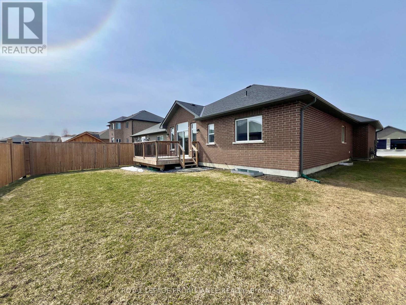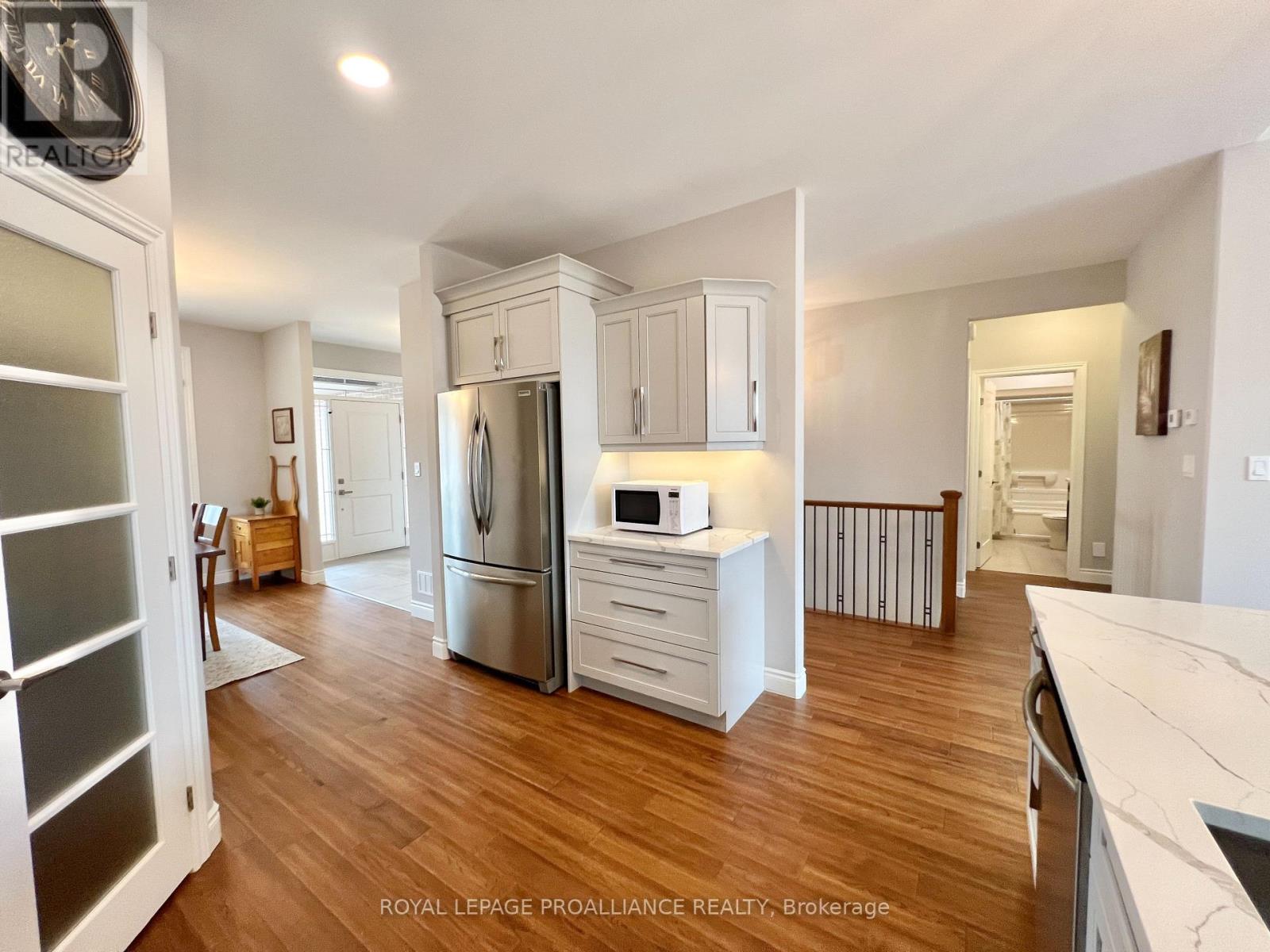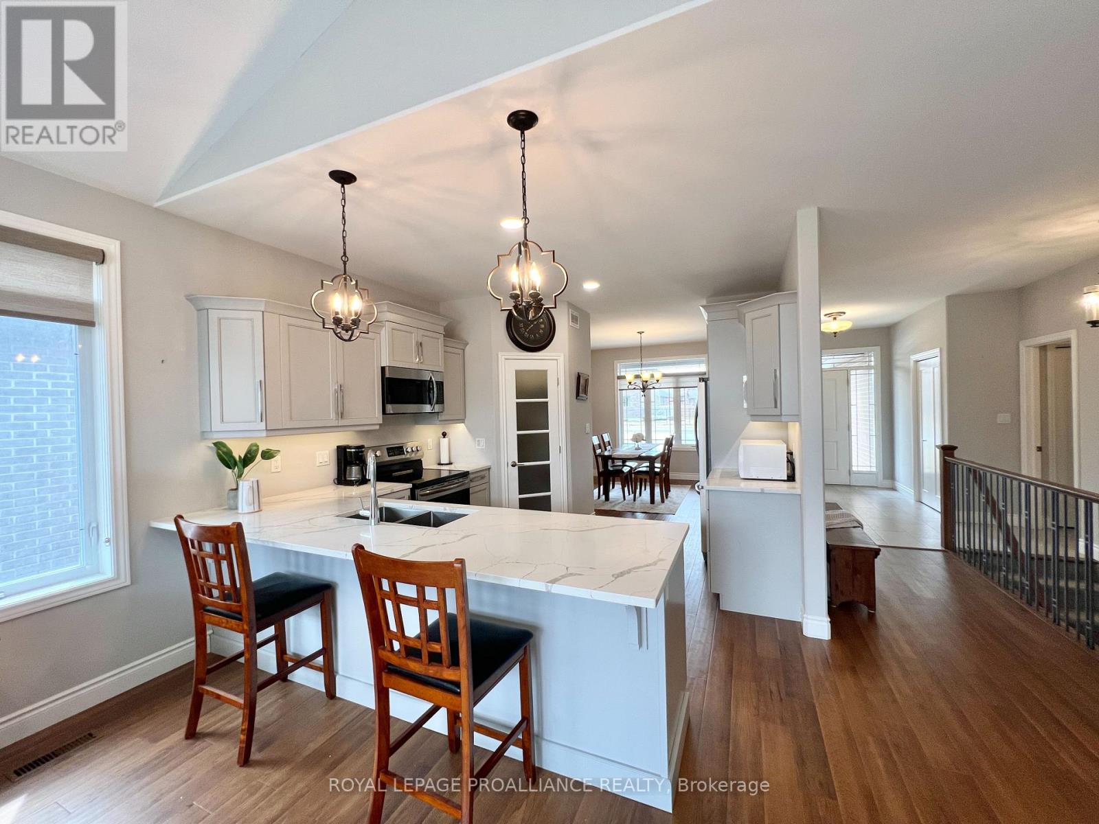 This immaculate all-brick bungalow, built in 2019 by Devanco Homes, is located in one of Belleville's most sought-after family neighbourhoods and shows like new from top to bottom. Step inside to a bright and welcoming foyer, with a front dining room framed by a large window that fills the space with natural light. The open-concept main living area is perfect for both everyday life and entertaining, featuring a vaulted ceiling in the living room and seamless flow into the kitchen. The kitchen features neutral cabinetry, quartz countertops, stainless steel appliances, a corner pantry, and a large island ideal for gathering with family and friends.The main level offers two bedrooms, including a spacious primary retreat with a walk-in closet and a private three-piece ensuite with a glass-tiled shower. A full four-piece bathroom completes the level. Downstairs, the fully finished basement-builder completed-continues the modern, like-new feel with a generous rec room, two additional spacious bedrooms, and another full four-piece bathroom. It's perfect for guests, hobbies, or flexible living space. Outside, enjoy a charming covered front porch, a double garage, and patio doors from the living room to the backyard deck, ideal for relaxing or entertaining on sunny days. Thoughtful details throughout include hardwood flooring on the main level, warm-toned laminate in the lower level, custom window coverings, and finishes that have been meticulously maintained...yes, I know people always say that, but this one really is! Settlers Ridge Estates offers wide lots, quiet streets, scenic walking paths, parks, and easy access to all shopping and amenities, combining comfort, convenience, and a lifestyle you'll love. (id:64974)