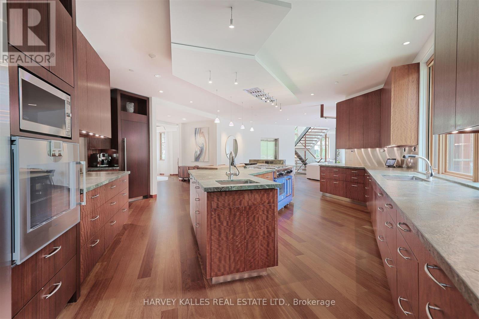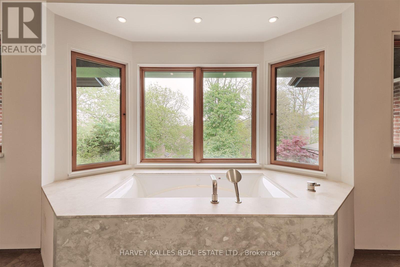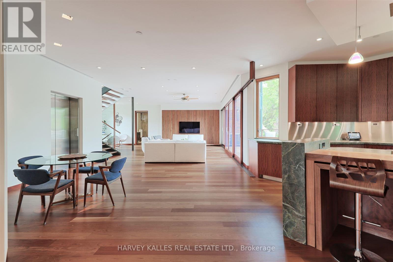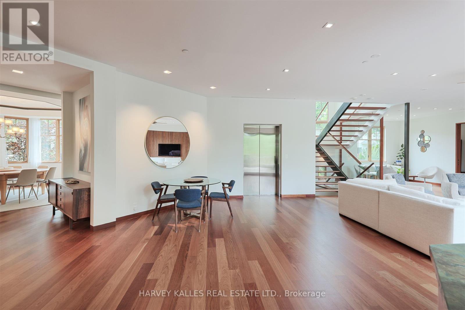 Discover a gem, custom-built as a multi-generational home, offering over 11,000 sq ft of luxurious living space on a rare 125ft double lot at the edge of the Humber Valley in the tree-lined Kingsway neighbourhood. This residence is a statement of contemporary elegance and sophistication, perfect for the discerning family.Inside, experience clean lines and exquisite details that enhance comfortable luxury living, including sound-isolated suites, Jatoba hardwood floors, stunning Persian serpentinite kitchen countertops, and heated stone floors for ultimate comfort.Accessibility is a key feature, with snow melt for the front porch, steps, ramp and driveway, a commercial 4x6 ft elevator, and 4 ft wide hallways to ensure effortless movement throughout the residence.The ground floor features a bright, open-plan living area that seamlessly integrates the chefs kitchen, dining, and living spaces, extending to a partially covered upper deck with a 17ft wide opening. A heated 3-car garage is cleverly positioned at the side of the house.The primary retreat is where luxury meets tranquility, featuring two generous walk-in closets and two ensuites one complete with a massage room and whirlpool tub offering tree-top views. Two additional spacious bedrooms, each with walk-in closets, share a thoughtfully designed bathroom suite with dual sinks, ample storage, and a separate area for added privacy. The oversized fourth bedroom also includes its own ensuite bathroom and walk-in closet, providing comfort and convenience for family or guests.The ground floor bedroom suite with a Juliet balcony offers a perfect retreat for guests.Venture to the finished lower level, where 10+ ft ceilings create a light and airy ambiance.This expansive space features a wide sliding door leading to the lower deck, ideal for entertaining.With multiple entertainment areas, including a stepped home theatre and sprawling park-like backyard, this home is designed for those who appreciate spacious comfort. (id:64974)