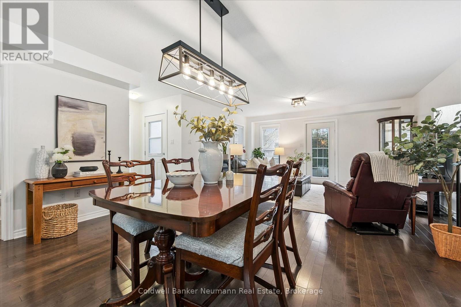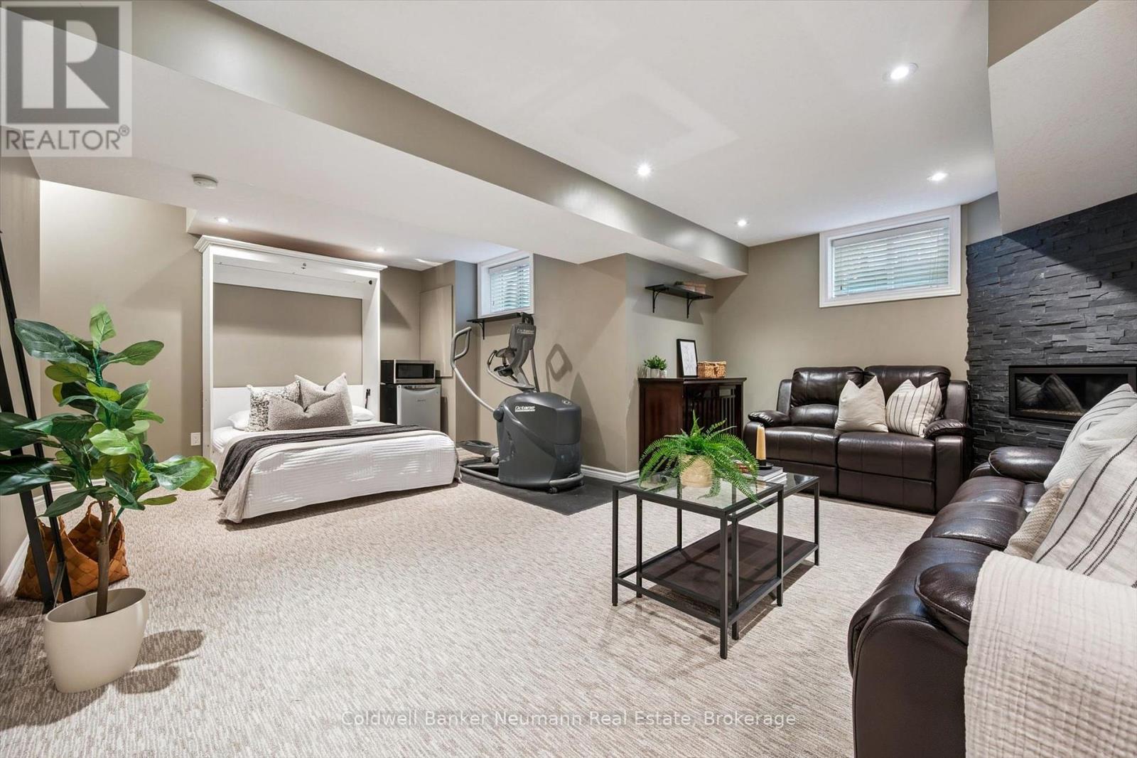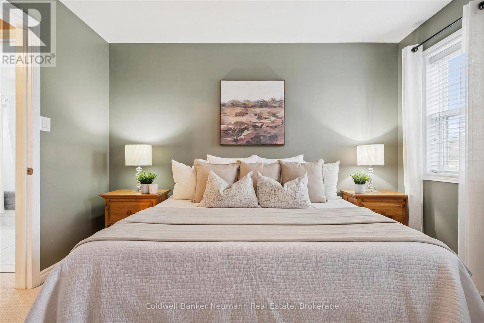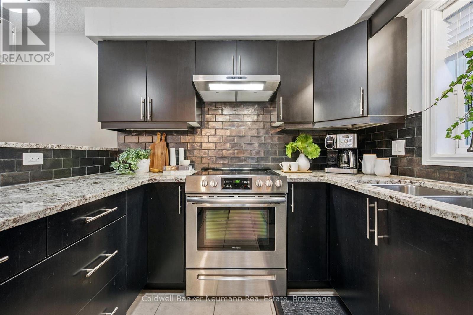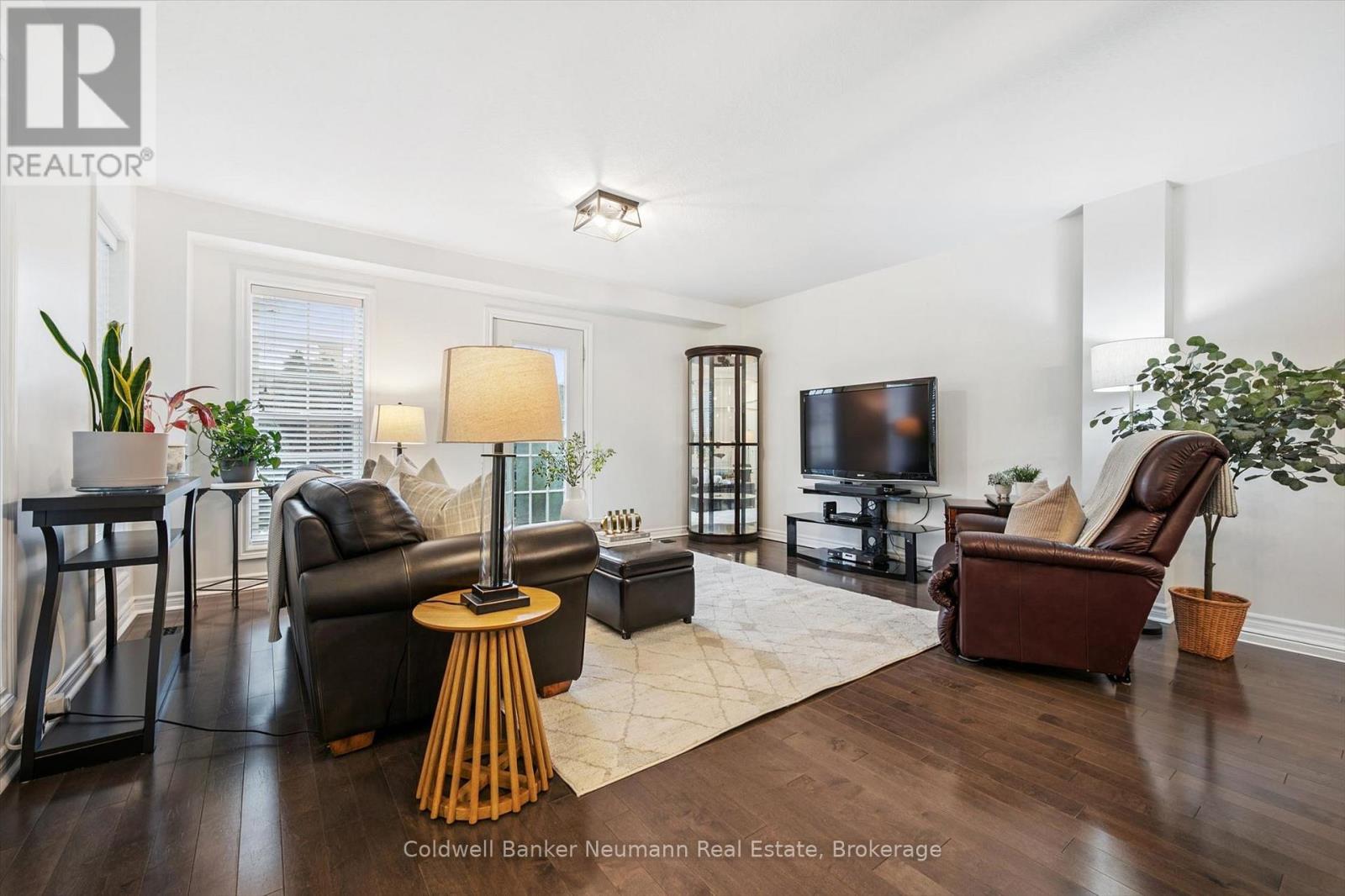 This immaculate 1,310 sq ft townhouse offers a bright, open concept layout and is located within a well maintained, beautifully landscaped complex in Guelph's desirable south end. Enjoy the ease of low maintenance living so you can spend more time in the surrounding trails, parks and amenities. Filled with natural light from large windows, the main level features Maple hardwood and ceramic flooring, a spacious living and dining area, and a walkout to a private patio that includes a gas line for your BBQ. The kitchen is stunning with granite counters, ceramic backsplash, NEW APPLIANCES & lots of countertop space. With 2 bedrooms, a 5 pcs bathroom and a DEN (ideal for a home office), this property is well-suited for families, professionals or investors. The finished basement adds valuable living space and can easily function as a third bedroom or in-law/guest suite, complete with a Murphy bed, cozy gas fireplace, 4 pcs bathroom with heated floors and ample storage. Perfect for extended family living or rental flexibility. Included are 2 PARKING SPOTS, a rare and valuable feature, with potential to rent or provide added flexibility for multi-vehicle households. Additional highlights include central air conditioning, an HRV, sump pump, a covered front porch, plenty of storage throughout and a 2 pcs bathroom on the main level. The furnace and A/C were replaced in 2020 and a new water softener installed in 2023. Located just steps to trails, parks, and top rated schools and within walking distance to grocery stores, restaurants, and entertainment, this home is ideal for families. For investors, the strong location, functional layout, and basement flexibility make it an attractive, low maintenance rental option in a high demand area. Quick access to the 401, Hwy 6 and nearby GO transit makes commuting simple. An excellent opportunity for a wonderful family home or a smart, versatile investment property in a highly convenient, well connected neighbourhood. (id:64974)