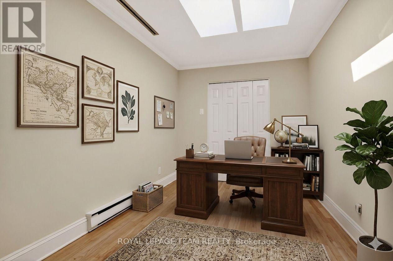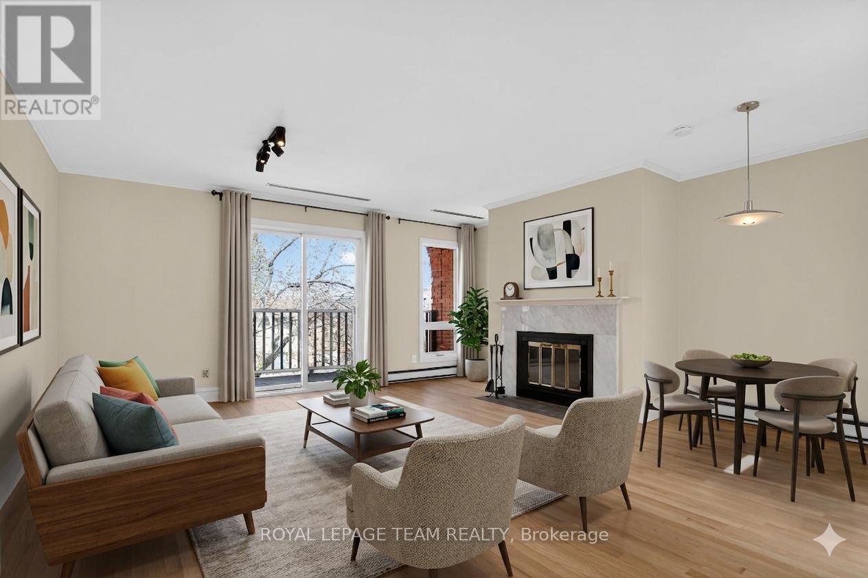Welcome to effortless urban living in the heart of Lower Town Ottawa! This bright and spacious 1-bedroom + den condo offers approximately 1,000 sq. ft. of well-designed, single-level living-perfect for professionals, downsizers, or anyone seeking convenience and comfort. Step inside to discover a stunning brand new kitchen, thoughtfully updated to blend style and functionality. The open-concept living and dining area is ideal for entertaining or relaxing, complete with a cozy wood-burning fireplace that adds warmth and charm. Beautifully refinished hardwood flooring runs throughout, adding a rich, warm feel to the space. Natural light pours into the unit through expansive windows, patio doors, and multiple skylights, creating an inviting and airy atmosphere throughout. Enjoy your morning coffee or unwind in the evening on the private balcony overlooking a quiet street in this quaint, sought-after neighbourhood. The generous primary bedroom features a large closet, while the versatile den-also with ample storage-can easily serve as a home office, guest space, or hobby room tailored to your lifestyle. A full bathroom and convenient in-unit laundry complete the interior. Additional highlights include covered indoor parking and a dedicated locker for extra storage. With unbeatable walking access to shops, restaurants, parks, and all that downtown Ottawa has to offer, this is city living at its finest. Don't miss this exceptional opportunity! (id:64974)