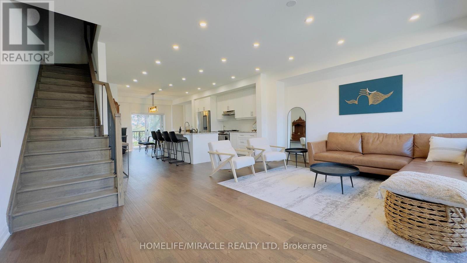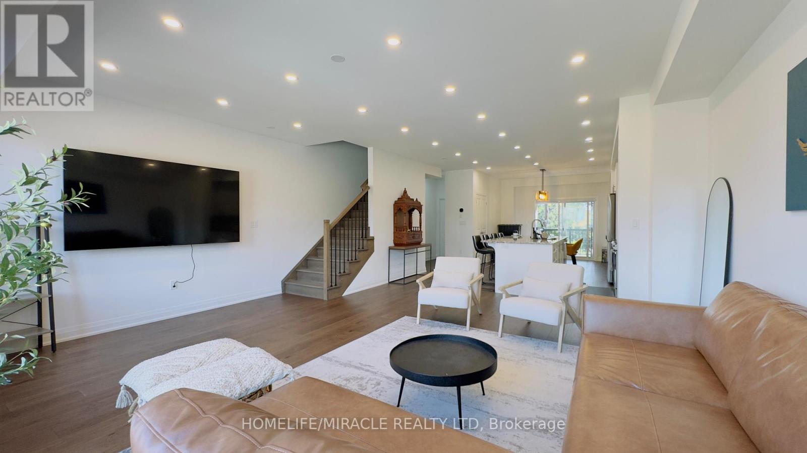 Discover your dream home in the prestigious Trafalgar Square development of Georgetown! This nearly new (1.5 years old) luxury freehold townhome blends contemporary sophistication with practical design, offering the best in comfort & style offering nearly 2000sqft. Ideally located in a highly desirable neighbourhood steps from the golf course, city hall, and backing onto peaceful green space, this home promises both convenience and tranquillity. The "Wildwood" model is the largest interior unit available, featuring an open-concept layout that's bathed in natural light. Enjoy high ceilings, large windows, & an effortless flow from the spacious living area to the gourmet kitchen & dining area-perfect for both everyday living and entertaining. With over $50,000 in premium upgrades, this home includes 3 spacious bedrms, 3 elegant bathrms, and a walk-out den/family rm on the main level that leads to your private backyard. Whether you're unwinding or hosting guests, this home has it all. Don't miss out-schedule your private tour today! Upgrades include: 1. Large Plank Hardwood Flooring throughout the main floor 2. Large upgraded natural stone Island with electrical outlets on both sides & a Large one-compartment stainless steel sink with a premium chrome faucet 3. Premium soft closing hydraulic Kitchen Cabinets with large 4" chrome handles 4. Stone countertops in washrooms with premium Moen Faucets 5. Pot lights (5CT conditions) 2700k to 6000k colour-changing Pot lights as per your mood & weather 6. All Wi-Fi-enabled latest Smart Samsung Appliances for seamless connectivity through smartphone 7. Smart Ecobee Thermostats with Sensors. 8. Brand New Water Softener 9. Hardwired front and back cameras from Defender Guard Security, in addition to the Ecobee Front Doorbell Camera. 10. 4" Large Blackout Zebra Blinds for added privacy throughout 11. Gas hookup for BBQ on the deck 12. Occupancy-activated front passage lights 13. Full motion (Swivel/Tilt) TV wall mount up to 85\ (id:64974)