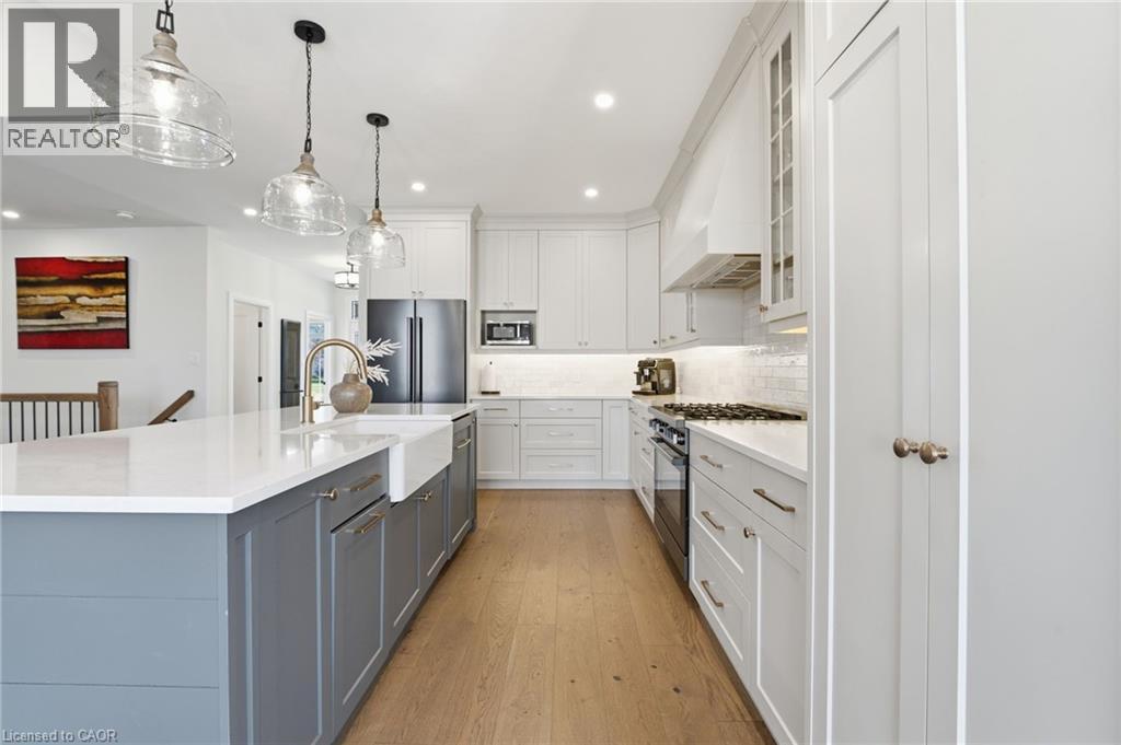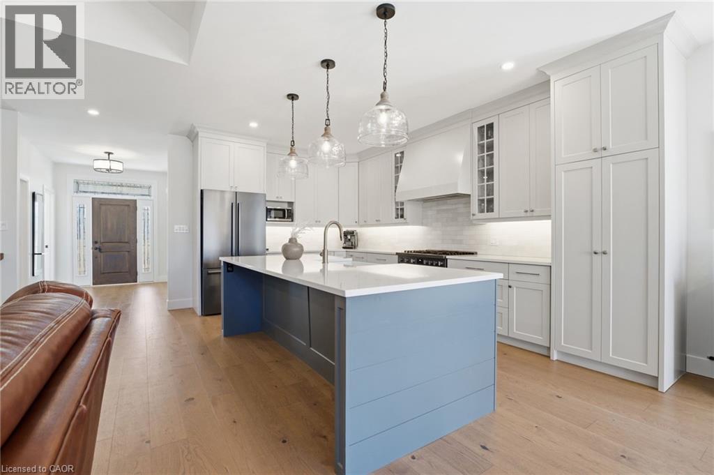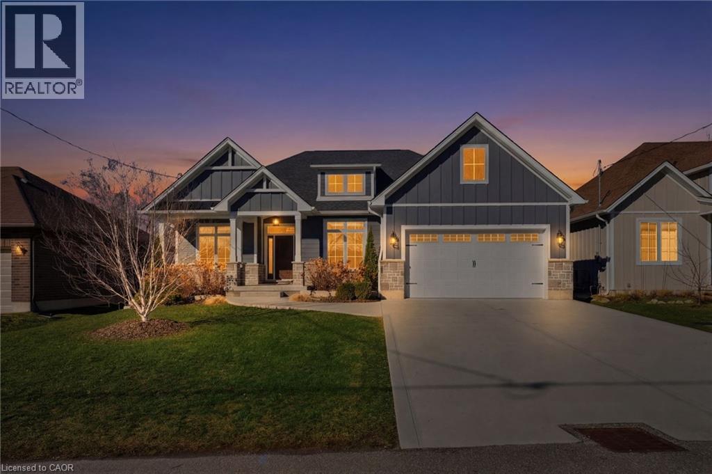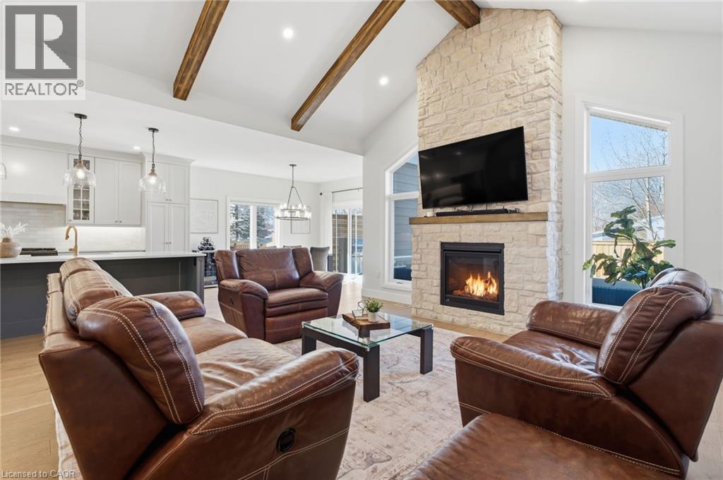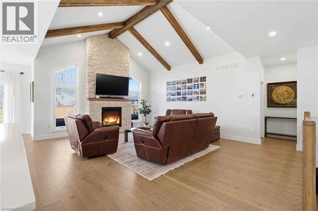 Welcome to 9 East N in charming Port Dover! Built in 2021, this stunning custom home offers nearly 1,900 sq ft of beautifully designed living space on the main level, plus a fully finished basement ideal for extended family or entertaining. The lower level features a second kitchen, additional bedroom, full bathroom, and spacious rec room. Inside, you’ll find hardwood floors throughout and a show-stopping custom kitchen with a massive island that flows into a breathtaking great room. The space is highlighted by a cathedral ceiling, decorative wood beams, and a dramatic floor-to-ceiling fireplace. The main level offers three generous bedrooms and two full bathrooms, including a beautiful principal suite with a spa-like ensuite and a large walk-in closet with built-ins. A spacious laundry/mudroom connects to the oversized garage for everyday convenience. Step outside to enjoy a multi-tier covered deck overlooking the backyard—perfect for relaxing or entertaining. Situated on a quiet street within walking distance to a Catholic elementary school and grocery shopping, this home combines comfort, style, and location. Finished with timeless stone and James Hardie siding, it’s truly beautiful inside and out. (id:64974)