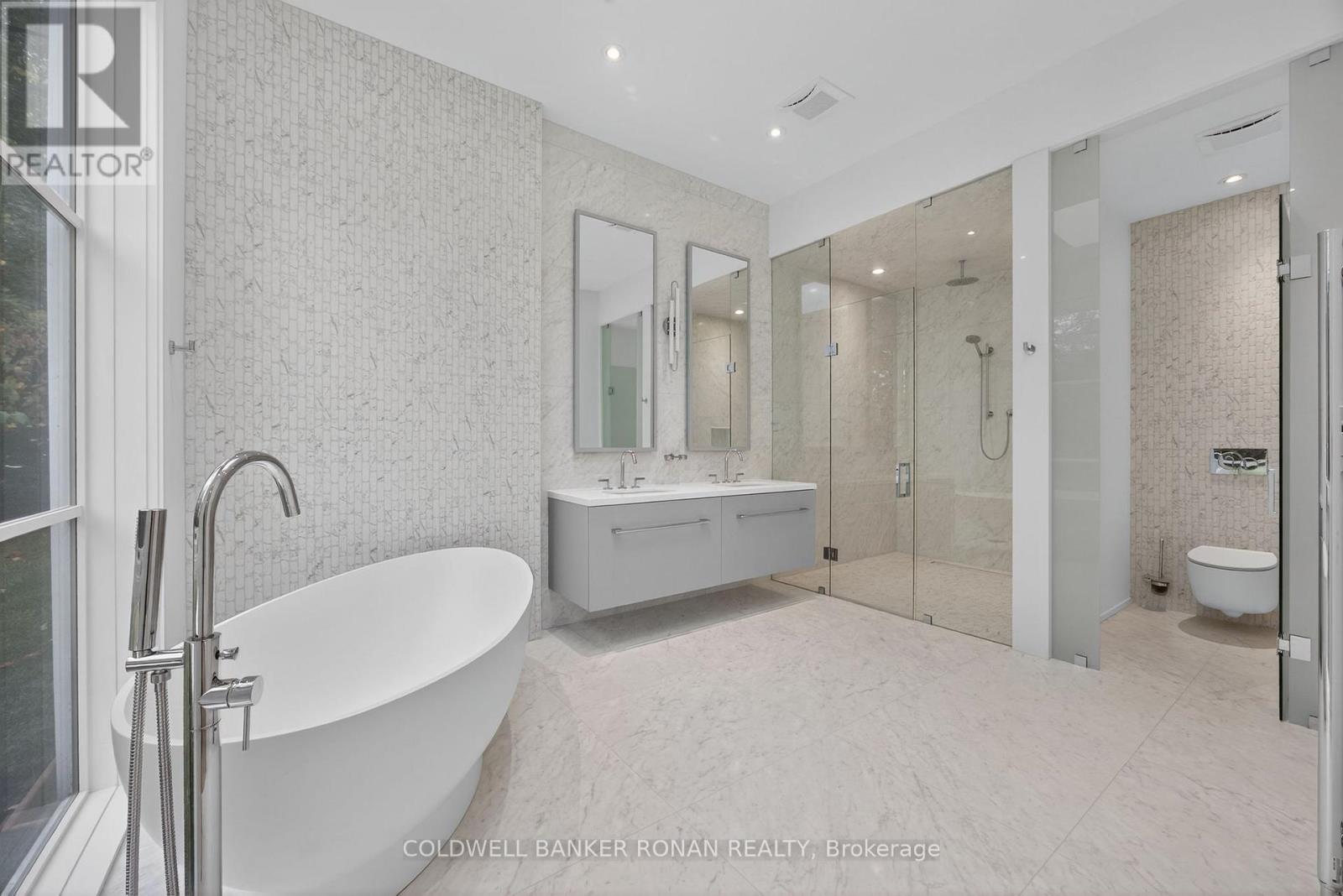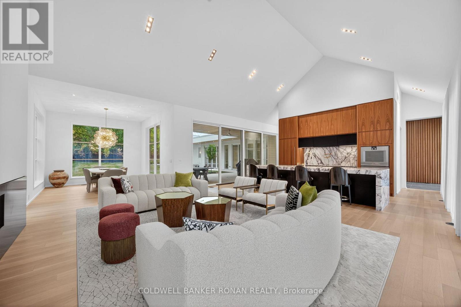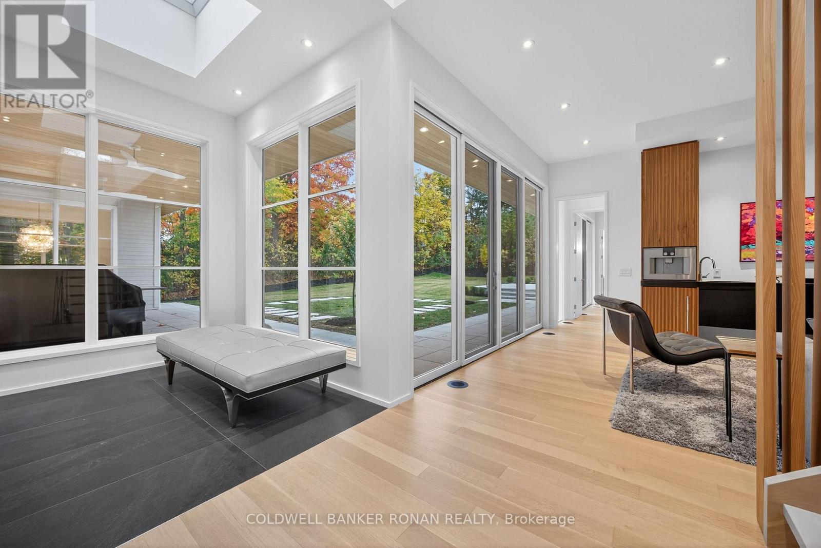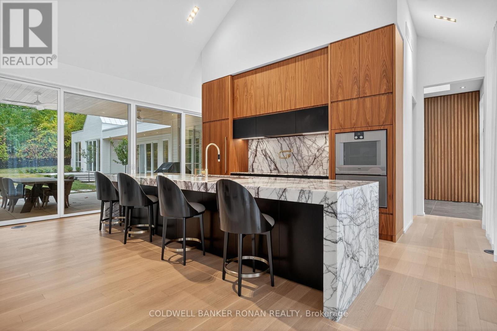 Modern luxury living in this breathtaking Forest View Home, crafted by Georgio Lolos Designs w/ interiors curated by ABella Design Inc. This stunning property is built with an eye for elegance & functionality. Step into the home through a custom wood slatted wall foyer. Six skylights flood the space with natural light. Open riser, Hollywood stairs w/ sleek glass railings lead to a private bedroom retreat over the garage. Specialty lighting highlights the grandeur of the 18-foot A-frame vaulted ceiling in the main living area, creating an inviting ambiance around the 50" gas fireplace clad in black soapstone. The home showcases 6' White Oak flooring throughout for a seamless & warm finish. The powder room impresses w/ a Starck wall-hung toilet, integrated marble sink & an exquisite book-matched Bianco Lasa marble wall. The heart of the home features a dream kitchen, equipped w/ walnut cabinetry, an impressive 14-foot waterfall island & a handcrafted 50' Julien sink. Grey Lilac marble adorns the kitchen & pantry, complemented by full-slab backsplashes. Cooking is elevated w/ a 36' Gaggenau induction cooktop, 30' Gaggenau wall oven, fully integrated 36' Thermidor fridge & Bosch dishwasher. The custom range hood & gold fixtures adds an elegant touch while a wine fridge in the pantry & a wall mounted pot filler over the stove round out the space's luxury. The TV lounge features a built-in Gaggenau coffee maker & beverage fridge, elegantly integrated into custom cabinetry & a sophisticated walnut accent wall. Each bedroom offers an ensuite bathroom & custom closets. Primary ensuite is a private oasis w/ custom wall hung vanity, a luxurious Knief, K-Stone tub, a wall-mounted AeT DOT 20 Italia toilet, an oversized shower towel warmer. Laundry room is carefully designed, with beautiful cabinetry, clothes drying area & a custom dog wash station. A must see property for those seeking a refined yet comfortable living experience. (id:64974)