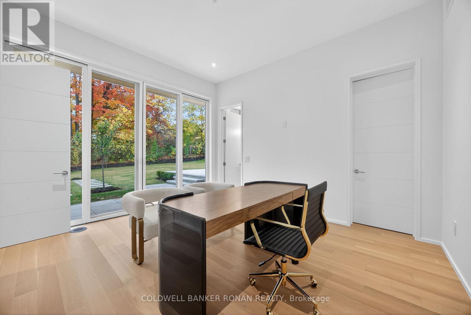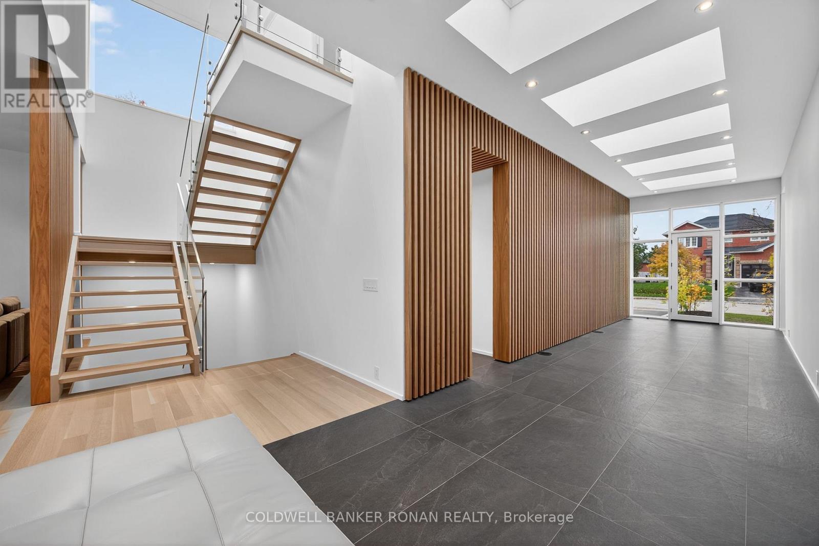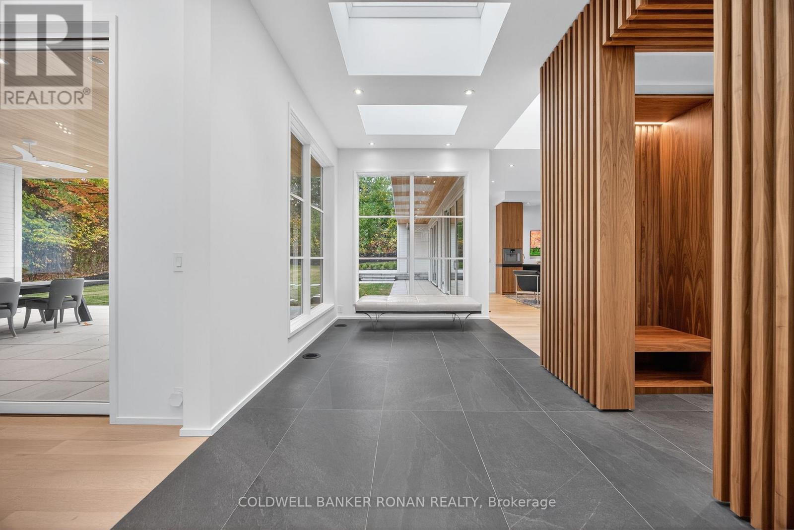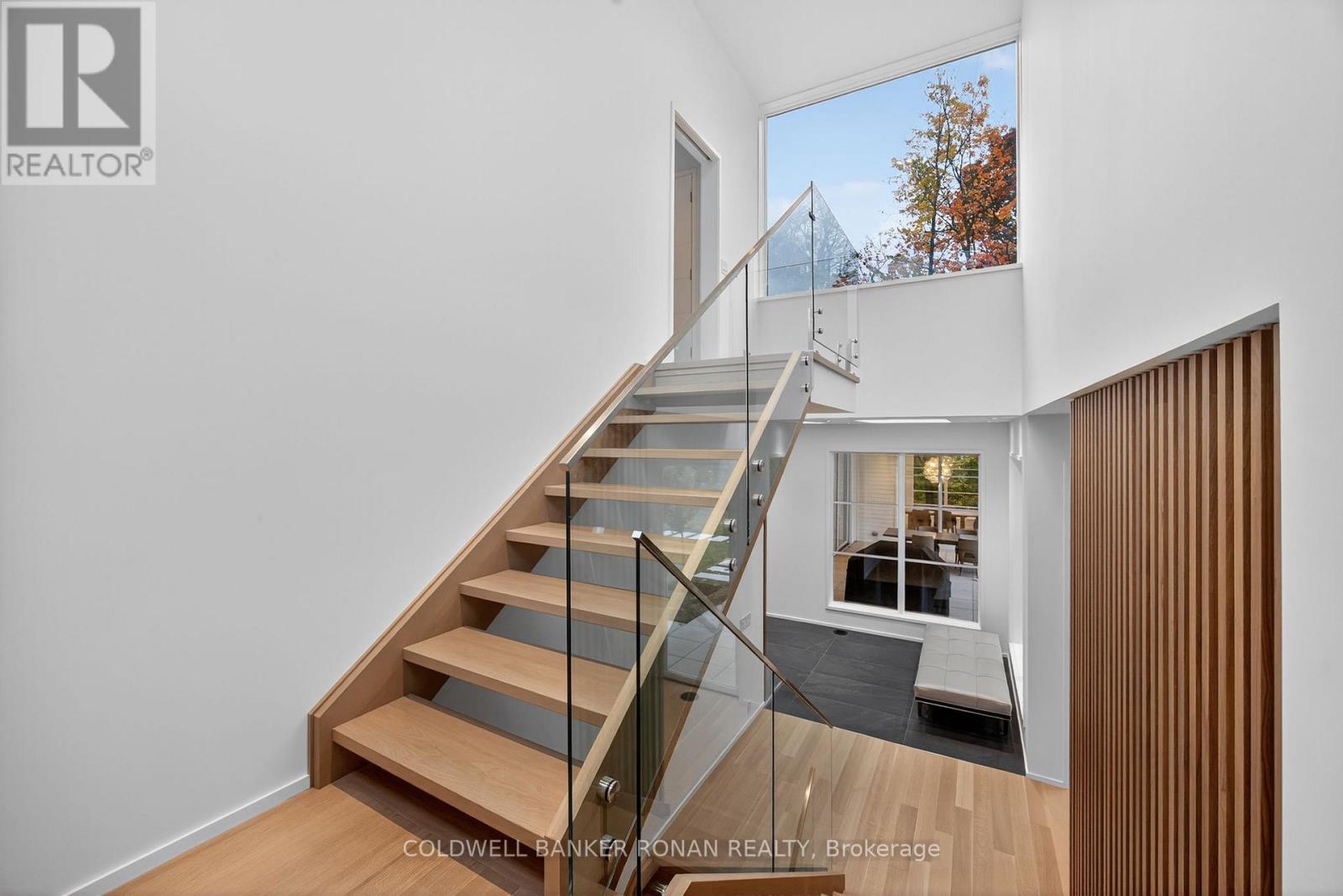 Modern luxury living in this breathtaking Forest View Home, crafted by Georgio Lolos Designs w/ interiors curated by ABella Design Inc. This stunning property is built with an eye for elegance & functionality. Step into the home through a custom wood slatted wall foyer. Six skylights flood the space with natural light. Open riser, Hollywood stairs w/ sleek glass railings lead to a private bedroom retreat over the garage. Specialty lighting highlights the grandeur of the 18-foot A-frame vaulted ceiling in the main living area, creating an inviting ambiance around the 50" gas fireplace clad in black soapstone. The home showcases 6' White Oak flooring throughout for a seamless & warm finish. The powder room impresses w/ a Starck wall-hung toilet, integrated marble sink & an exquisite book-matched Bianco Lasa marble wall. The heart of the home features a dream kitchen, equipped w/ walnut cabinetry, an impressive 14-foot waterfall island & a handcrafted 50' Julien sink. Grey Lilac marble adorns the kitchen & pantry, complemented by full-slab backsplashes. Cooking is elevated w/ a 36' Gaggenau induction cooktop, 30' Gaggenau wall oven, fully integrated 36' Thermidor fridge & Bosch dishwasher. The custom range hood & gold fixtures adds an elegant touch while a wine fridge in the pantry & a wall mounted pot filler over the stove round out the space's luxury. The TV lounge features a built-in Gaggenau coffee maker & beverage fridge, elegantly integrated into custom cabinetry & a sophisticated walnut accent wall. Each bedroom offers an ensuite bathroom & custom closets. Primary ensuite is a private oasis w/ custom wall hung vanity, a luxurious Knief, K-Stone tub, a wall-mounted AeT DOT 20 Italia toilet, an oversized shower towel warmer. Laundry room is carefully designed, with beautiful cabinetry, clothes drying area & a custom dog wash station. A must see property for those seeking a refined yet comfortable living experience. (id:64974)