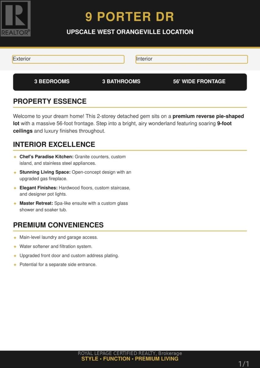 Stunning Family Home on Premium 56 feet front Lot in Sought-After West OrangevilleWelcome to 9 Porter Drive, nestled in one of Orangeville's most desirableneighbourhoods. This beautifully maintained, 2017-built detached home sits on apremium lot and offers the perfect blend of modern upgrades, comfort, and futurepotential-ideal for growing families.Step inside to a bright and inviting entryway filled with natural light. The mainlevel features 9-foot ceilings, elegant hardwood flooring, and a thoughtfullydesigned open-concept layout. The spacious living and dining area is perfect forentertaining, complete with a cozy upgraded gas fireplace and stylish finishesthroughout.The kitchen truly is the heart of the home, showcasing granite countertops, upgradedwhite cabinetry, a premium backsplash, stainless steel appliances, and a customisland. Enjoy seamless indoor-outdoor living with a walkout to the backyard-offeringplenty of space for summer BBQs and even the potential for a pool.Additional main floor highlights include California shutters, pot lights, premiumlight fixtures, garage access, and a convenient laundry area.Upstairs, you'll find three generously sized bedrooms, including a luxurious primarysuite with a spa-like ensuite featuring a custom glass shower and soaker tub. Themain bathroom offers a double vanity-perfect for busy families.The unfinished basement includes a bathroom rough-in and offers incredible potentialfor customization, with the possibility of a future side entrance.Highlighted Features :Premium 56 feet Front lot in a family-friendly neighbourhoodHardwood flooring & California shutters .Custom hardwood staircase with iron picketsPot lights on Main & 2nd FloorCentral air conditioning & Furnace ( owned )Water softener & filtration system ( owned )Upgraded front door with custom address letteringGarage door openerPotential for side Entrance to Basement. (id:64974)