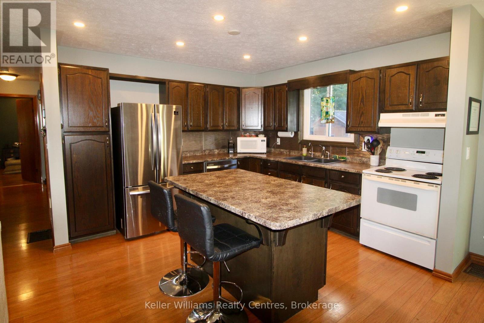 Welcome to this raised bungalow in the quiet community of Riversdale, situated on a generous 66 x 132 lot. With an attached garage, concrete driveway, and a large fully fenced yard, this property offers great space both inside and out. The main level features an open-concept kitchen, living, and dining area, perfect for family living or entertaining. The kitchen is equipped with appliances (new Samsung dishwasher 2025), an island with overhang for barstool seating, and a dining area with a walkout to a spacious deck overlooking the backyard. Three comfortable bedrooms and a full bathroom complete this level. The finished basement provides additional living space with a cozy rec room warmed by a wood stove, plenty of storage, garage access, and laundry facilities. A 10 x 31 shed with hydro out back offers an excellent workshop or space for toys. Notable updates include the concrete driveway and retaining wall, vinyl flooring in the lower level and bedrooms, a steel roof (approx 2015), and updated windows for peace of mind. The home is equipped with a full water treatment system and is conveniently located just 20 minutes from Bruce Power. Combining functionality and charm on a great lot, this home is ideal for families, first-time buyers, or those looking for extra outdoor space. (id:64974)