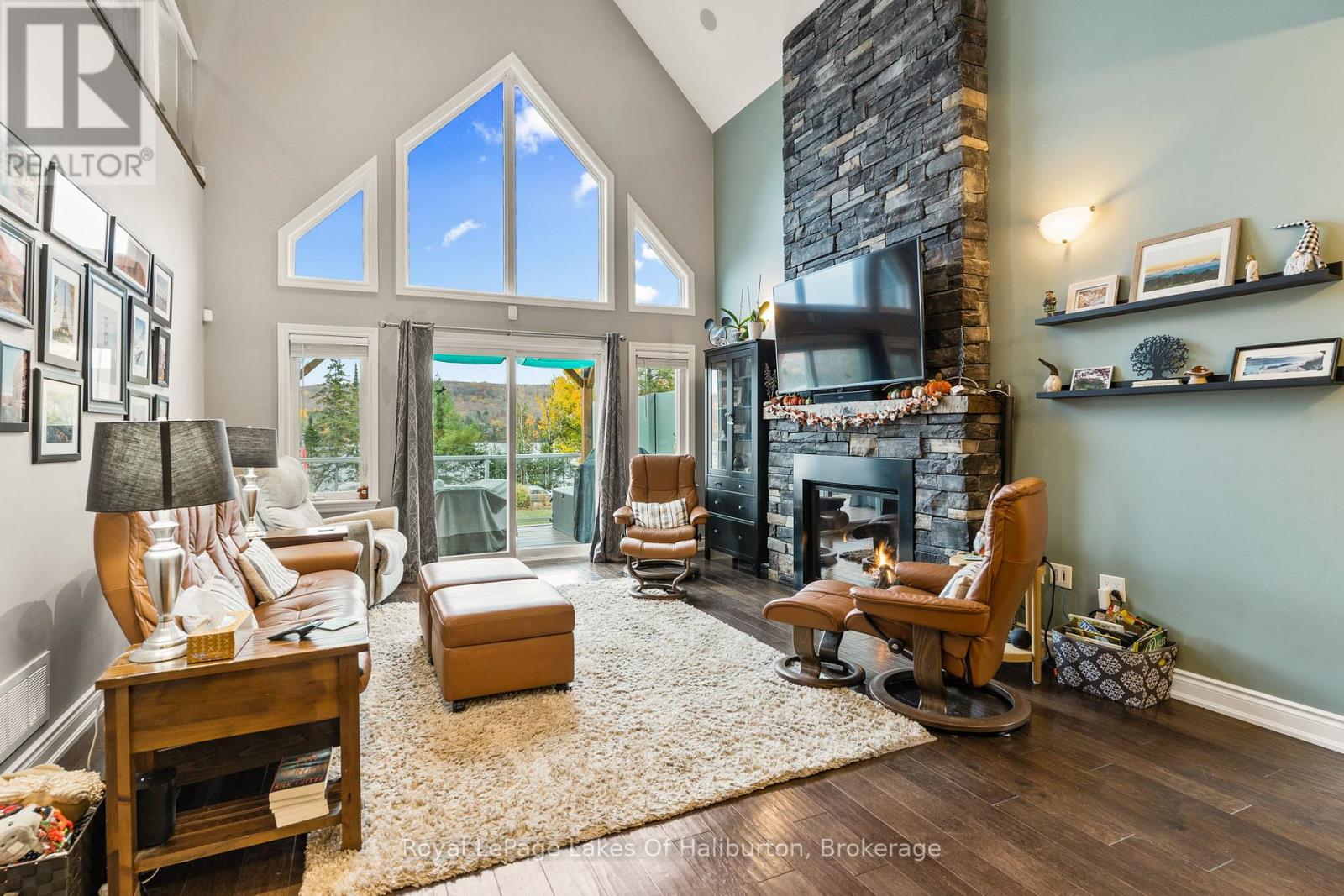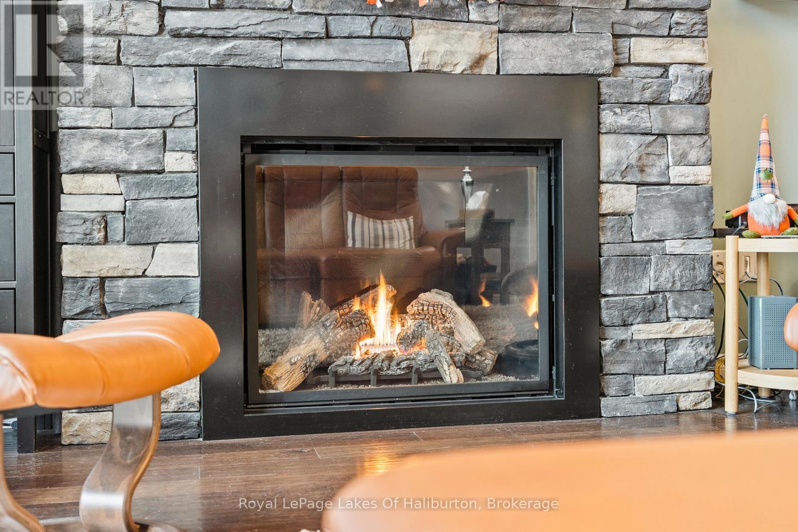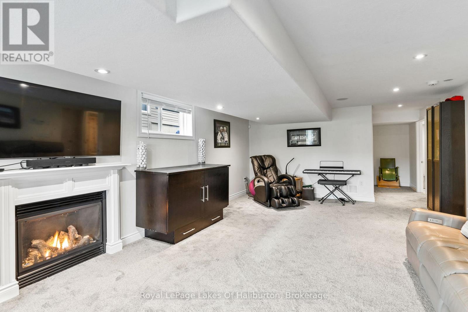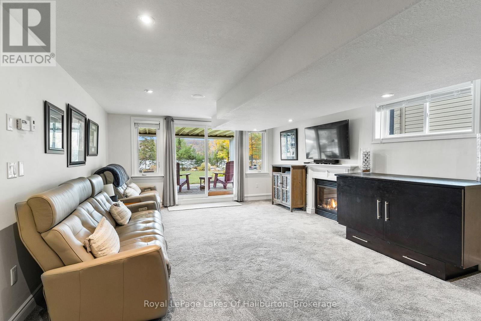Welcome to this 4-bedroom, 4-bathroom executive home in the prestigious Silver Beach waterfront community on Kashagawigamog Lake, part of the sought-after 5-lake chain. With 2,955 sq. ft. of refined living space, this home combines quality craftsmanship, luxury finishes, and spectacular lake views.The foyer offers keyless entry, retractable screen, and tile floors leading to a gourmet kitchen with upgraded cabinetry, granite counters, under-cabinet lighting, sit-up area, stainless steel appliances, and elegant fixtures. The great room impresses with cathedral ceilings, a stunning floor-to-ceiling stone propane fireplace, hardwood floors, soaring windows, and walkout to a lakeside composite deck featuring a cedar timber-frame pergola and BBQ area and endless lakeviews.The primary suite provides a peaceful retreat with walkout to the deck and awning, ceiling fan, ensuite with heated floors and glass shower. The upper level offers a bright family room with glass panels overlooking the great room, high ceilings, hardwood flooring, 2 bedrooms, carpeted, ceiling fans, and custom blinds, while a walk-in closet area adds generous storage and 4pc bath with soaker tub.The lower level features a spacious rec room with propane fireplace, pot lights, and walkout to an interlocking lakeside patio. A guest suite offers a walkout to waterside patio, walk-in closet, and 4-pc ensuite. Additional highlights include, all bathrooms with heated floors, a multi-zone HVAC system, new hot water on demand (2025), 18W Generac generator, NFTC fibre optics, and a heated, insulated garage with storage and retractable screen. Exterior upgrades include programmable soffit lighting, glass railings, firepit area, and under-deck shielding.Enjoy exclusive access to the Silver Beach Clubhouse featuring a grand hall, kitchen, fitness center, games room, guest suite, two beaches & trails, close to Haliburton for all your amenities. Dock slip available to purchase ($25K). See full list of features. (id:64974)