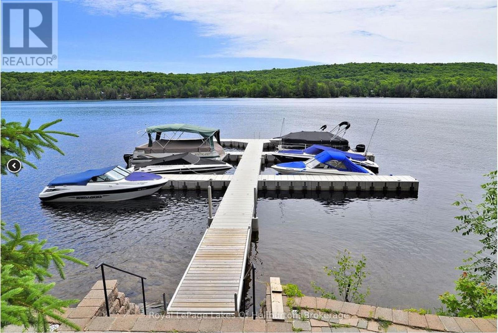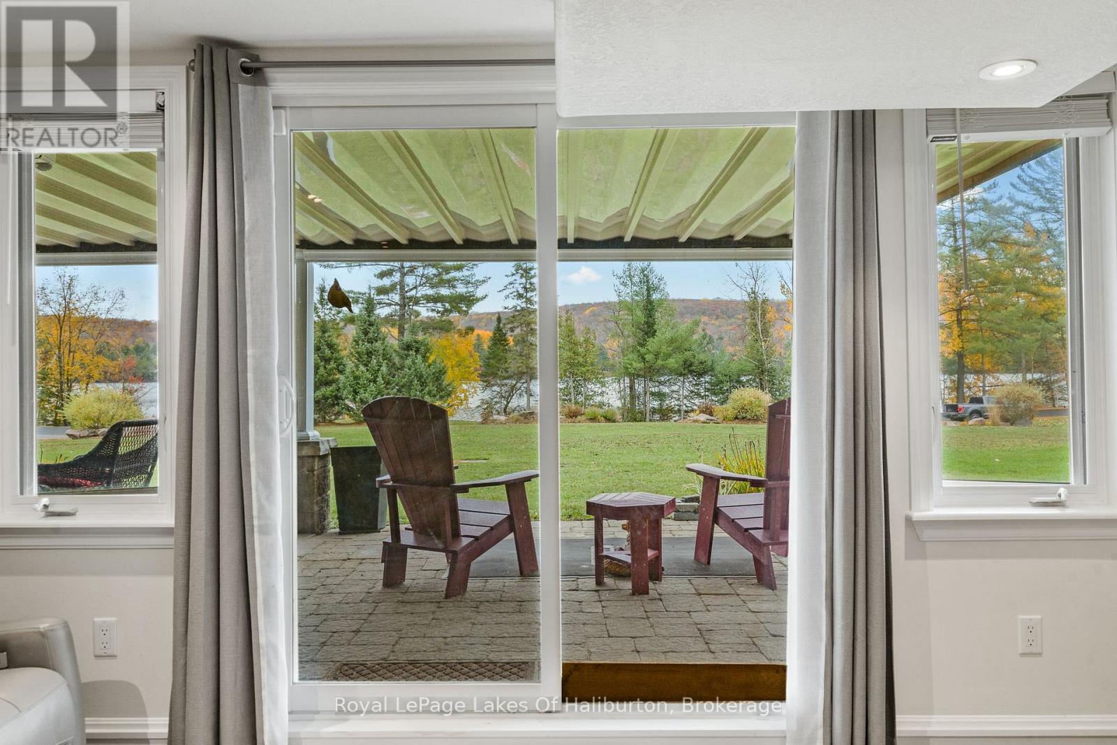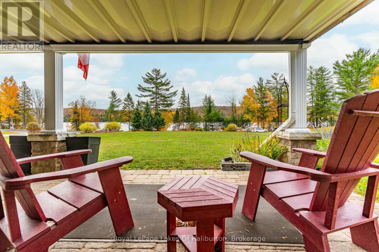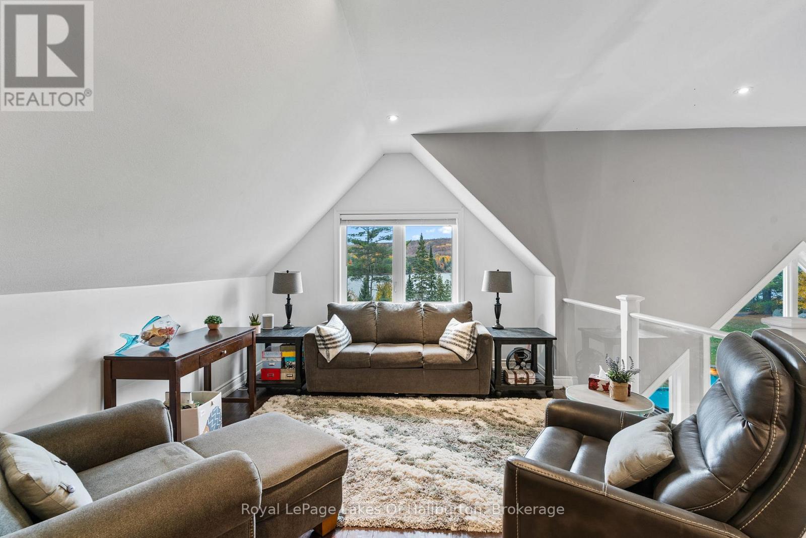 Welcome to this 4-bedroom, 4-bathroom executive home in the prestigious Silver Beach waterfront community on Kashagawigamog Lake, part of the sought-after 5-lake chain. With 2,955 sq. ft. of refined living space, this home combines quality craftsmanship, luxury finishes, and spectacular lake views.The foyer offers keyless entry, retractable screen, and tile floors leading to a gourmet kitchen with upgraded cabinetry, granite counters, under-cabinet lighting, sit-up area, stainless steel appliances, and elegant fixtures. The great room impresses with cathedral ceilings, a stunning floor-to-ceiling stone propane fireplace, hardwood floors, soaring windows, and walkout to a lakeside composite deck featuring a cedar timber-frame pergola and BBQ area and endless lakeviews.The primary suite provides a peaceful retreat with walkout to the deck and awning, ceiling fan, ensuite with heated floors and glass shower. The upper level offers a bright family room with glass panels overlooking the great room, high ceilings, hardwood flooring, 2 bedrooms, carpeted, ceiling fans, and custom blinds, while a walk-in closet area adds generous storage and 4pc bath with soaker tub.The lower level features a spacious rec room with propane fireplace, pot lights, and walkout to an interlocking lakeside patio. A guest suite offers a walkout to waterside patio, walk-in closet, and 4-pc ensuite. Additional highlights include, all bathrooms with heated floors, a multi-zone HVAC system, new hot water on demand (2025), 18W Generac generator, NFTC fibre optics, and a heated, insulated garage with storage and retractable screen. Exterior upgrades include programmable soffit lighting, glass railings, firepit area, and under-deck shielding.Enjoy exclusive access to the Silver Beach Clubhouse featuring a grand hall, kitchen, fitness center, games room, guest suite, two beaches & trails, close to Haliburton for all your amenities. Dock slip available to purchase ($25K). See full list of features. (id:64974)