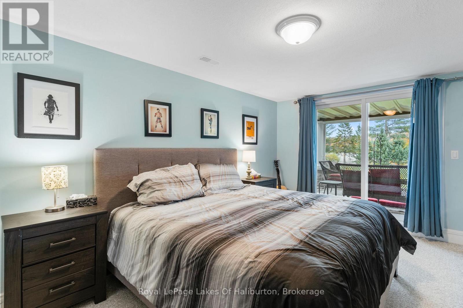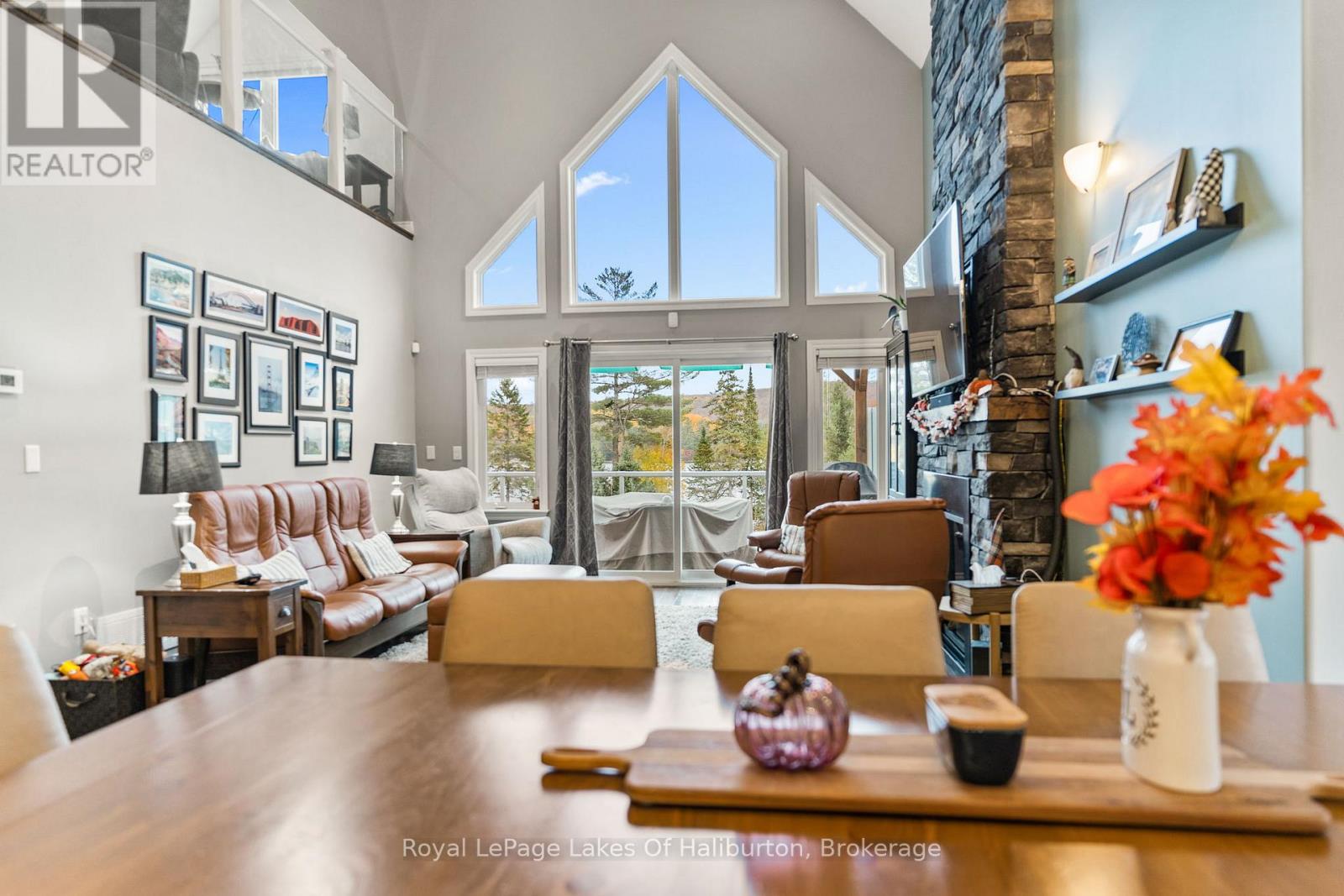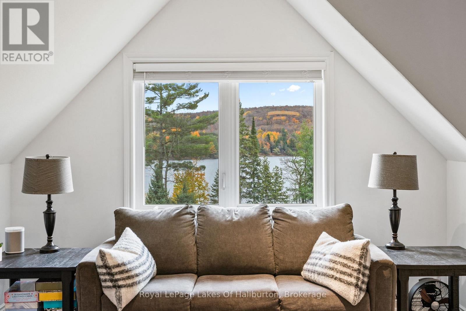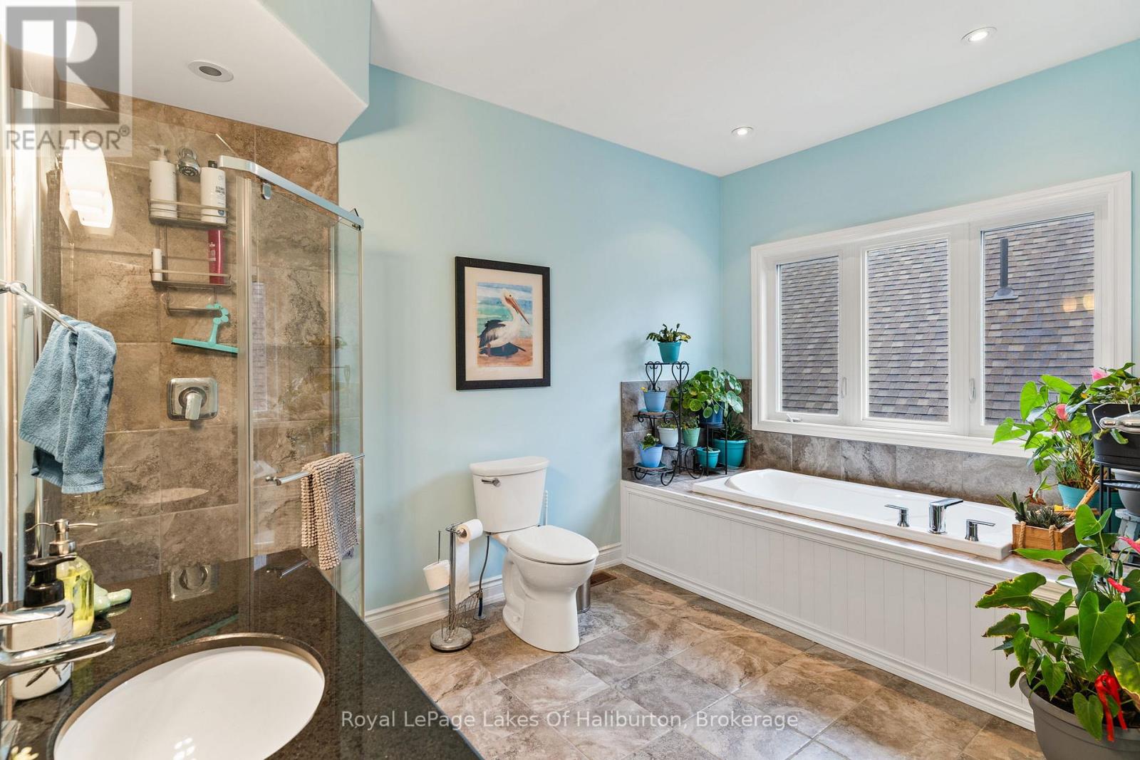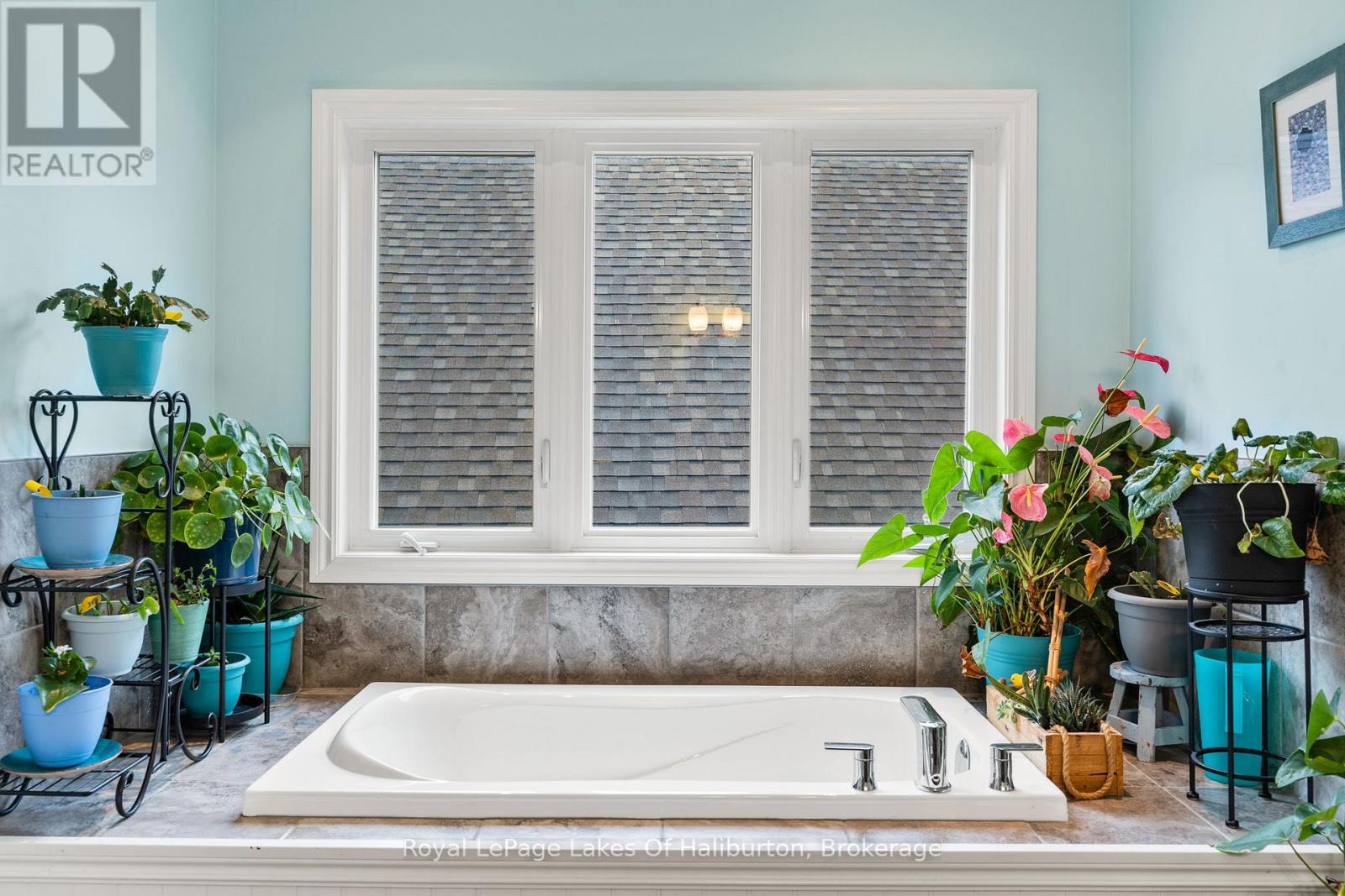 Welcome to this 4-bedroom, 4-bathroom executive home in the prestigious Silver Beach waterfront community on Kashagawigamog Lake, part of the sought-after 5-lake chain. With 2,955 sq. ft. of refined living space, this home combines quality craftsmanship, luxury finishes, and spectacular lake views.The foyer offers keyless entry, retractable screen, and tile floors leading to a gourmet kitchen with upgraded cabinetry, granite counters, under-cabinet lighting, sit-up area, stainless steel appliances, and elegant fixtures. The great room impresses with cathedral ceilings, a stunning floor-to-ceiling stone propane fireplace, hardwood floors, soaring windows, and walkout to a lakeside composite deck featuring a cedar timber-frame pergola and BBQ area and endless lakeviews.The primary suite provides a peaceful retreat with walkout to the deck and awning, ceiling fan, ensuite with heated floors and glass shower. The upper level offers a bright family room with glass panels overlooking the great room, high ceilings, hardwood flooring, 2 bedrooms, carpeted, ceiling fans, and custom blinds, while a walk-in closet area adds generous storage and 4pc bath with soaker tub.The lower level features a spacious rec room with propane fireplace, pot lights, and walkout to an interlocking lakeside patio. A guest suite offers a walkout to waterside patio, walk-in closet, and 4-pc ensuite. Additional highlights include, all bathrooms with heated floors, a multi-zone HVAC system, new hot water on demand (2025), 18W Generac generator, NFTC fibre optics, and a heated, insulated garage with storage and retractable screen. Exterior upgrades include programmable soffit lighting, glass railings, firepit area, and under-deck shielding.Enjoy exclusive access to the Silver Beach Clubhouse featuring a grand hall, kitchen, fitness center, games room, guest suite, two beaches & trails, close to Haliburton for all your amenities. Dock slip available to purchase ($25K). See full list of features. (id:64974)